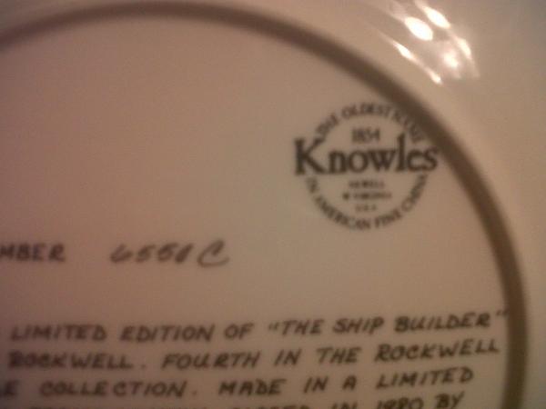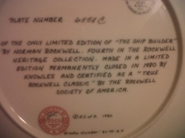 The writing on the back of the plate reads "Plate number 6550c. Of the only limited edition of "The Ship Builder" by Norman Rockwell. Fourth in the Rockwell Heritage Collection. Made in a limited edition permanently closed in 1980 by KNOWLES and certified as a 'true Rockwell classic' by the Rockwell Society of America."