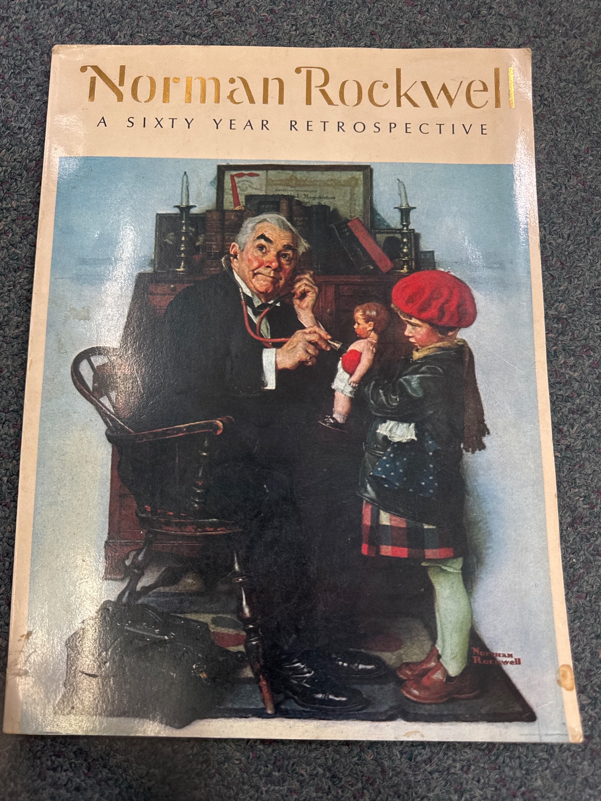 Physical Description: This item is a softcover book featuring the iconic works of Norman Rockwell. It showcases a colorful cover illustration depicting a doctor and a child, capturing Rockwell's signature style. The book measures approximately 12 inches in height and 9 inches in width. The cover is adorned with gold lettering, while the interior contains reproductions of Rockwell's artwork, along with text discussing his career.