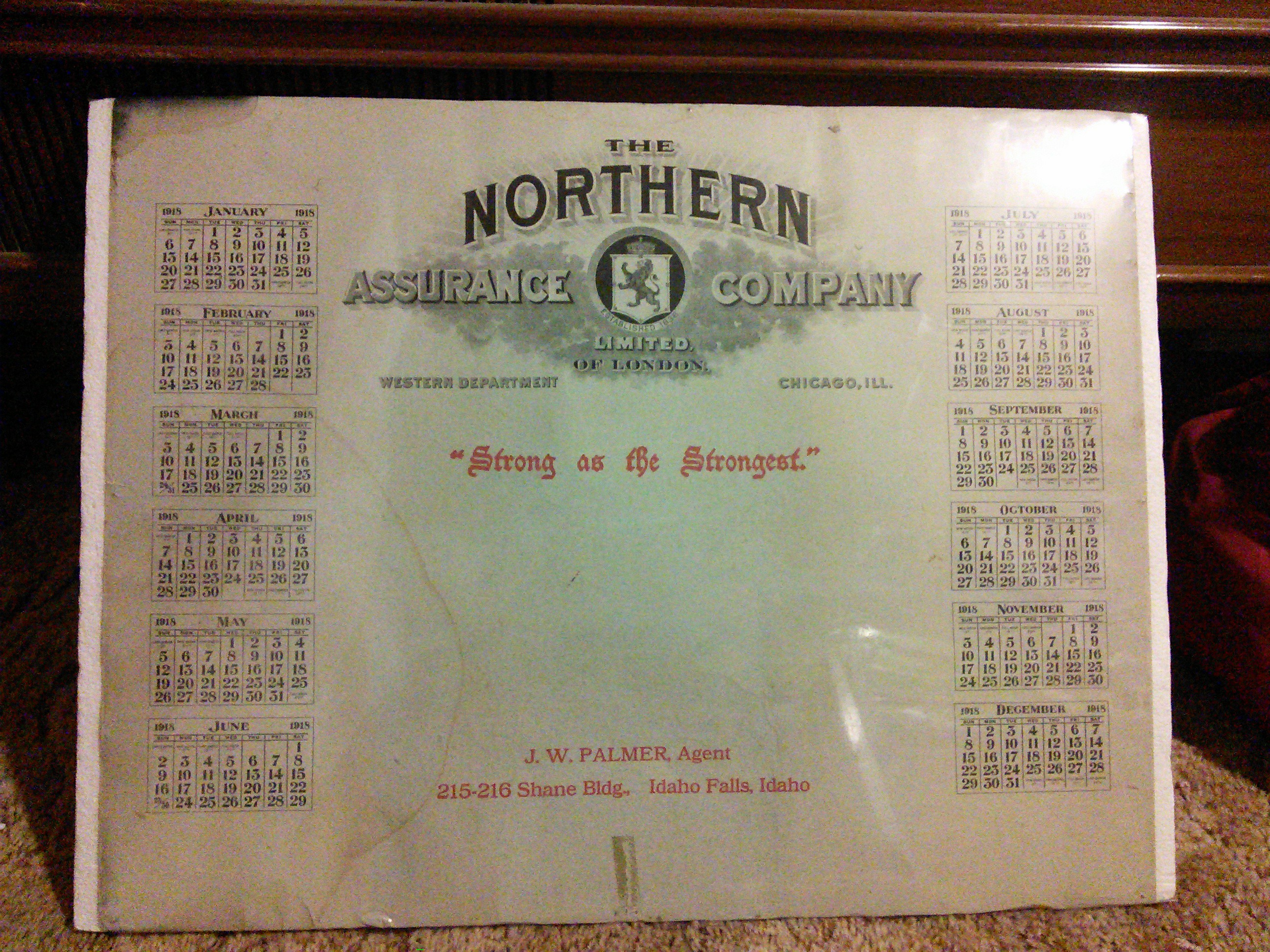 I have a northern Assurance company limited of London calendar for 1918. The reason for the glaring texture on the photos is due to the plastic wrap that's been placed on it to preserve it. The calendar is quite large and has some issues. First off it has a ink stain on the top left corner, it has water stains, a few pinholes around the borders , on the bottom center it has remains of what appears to be tape. It also appears to be yellowish with sun fade. There are also a few Frey's on the edges of the paper, and a few creases.