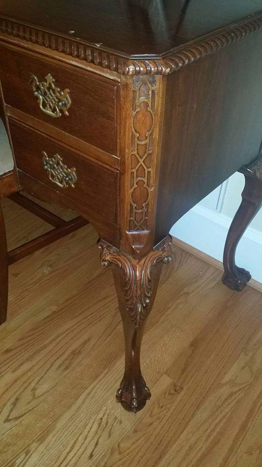 I found it at a local Goodwill store and paid $125 for it and the stool. I am pretty sure the stool doesn't go with it but it "came" with it from Goodwill. The desk has a manufacturer emblem in metal on the inside of one of the drawers. The emblem is Northern Furniture Company. It is solid wood with a rope finish around the top and the lattuce work on the sides and claw and ball feet.