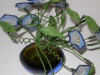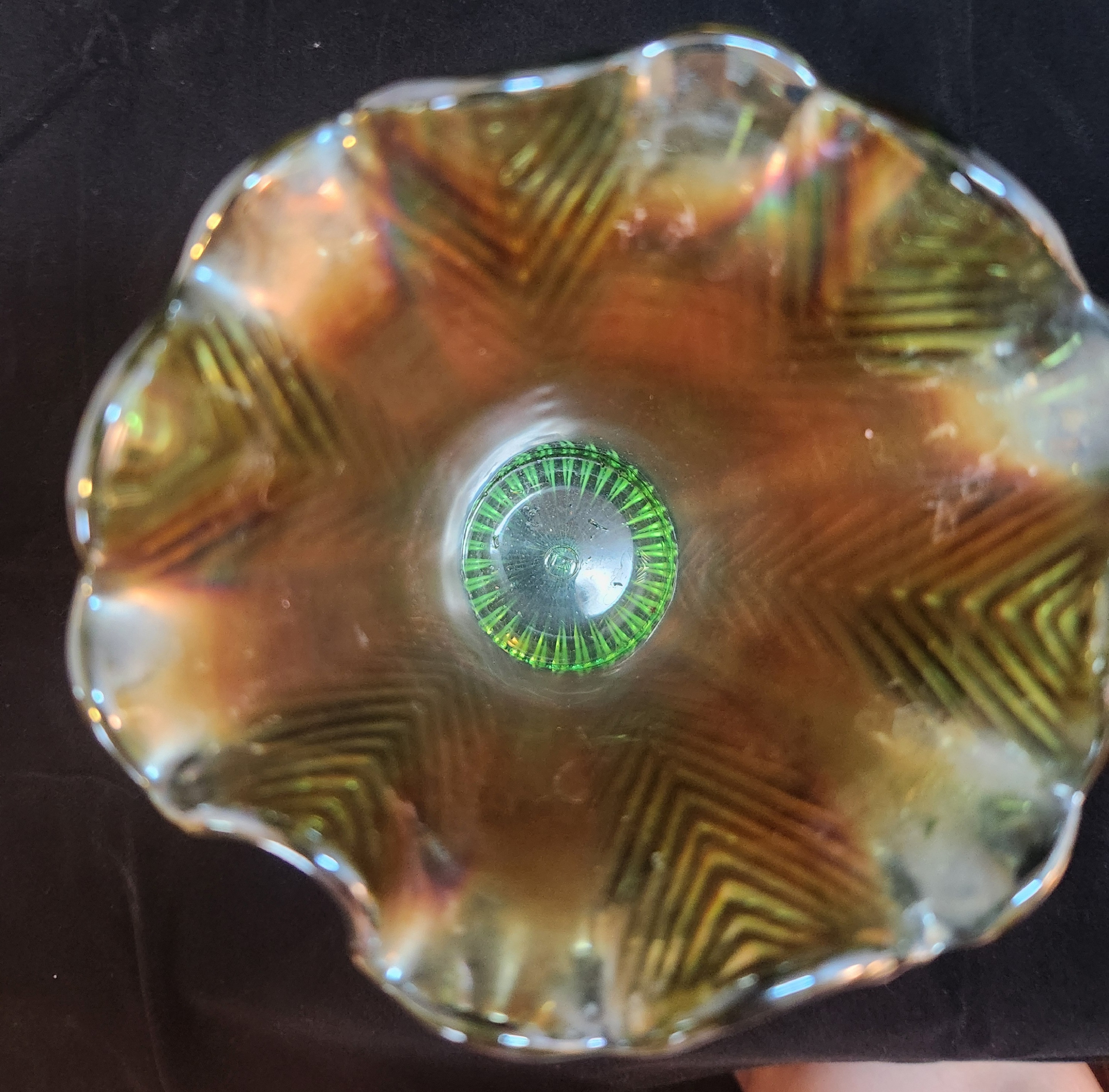 Green base/marigold coated carnival glass, embossed with Northwood's logo, an "N" underlined in a circle. Feathers motif.