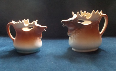 Here we have four animal theme milk jugs. They look like two matched pairs but the large bull has a red stamp 'Austria' the small bull has 'Austria' with a red crown above the word; the larger stag has 'Austria' and the smaller stag has 'Made In C(illegible) and 'Georgoria'. Does anyone now when these were made and if they have any value other than kitsch?