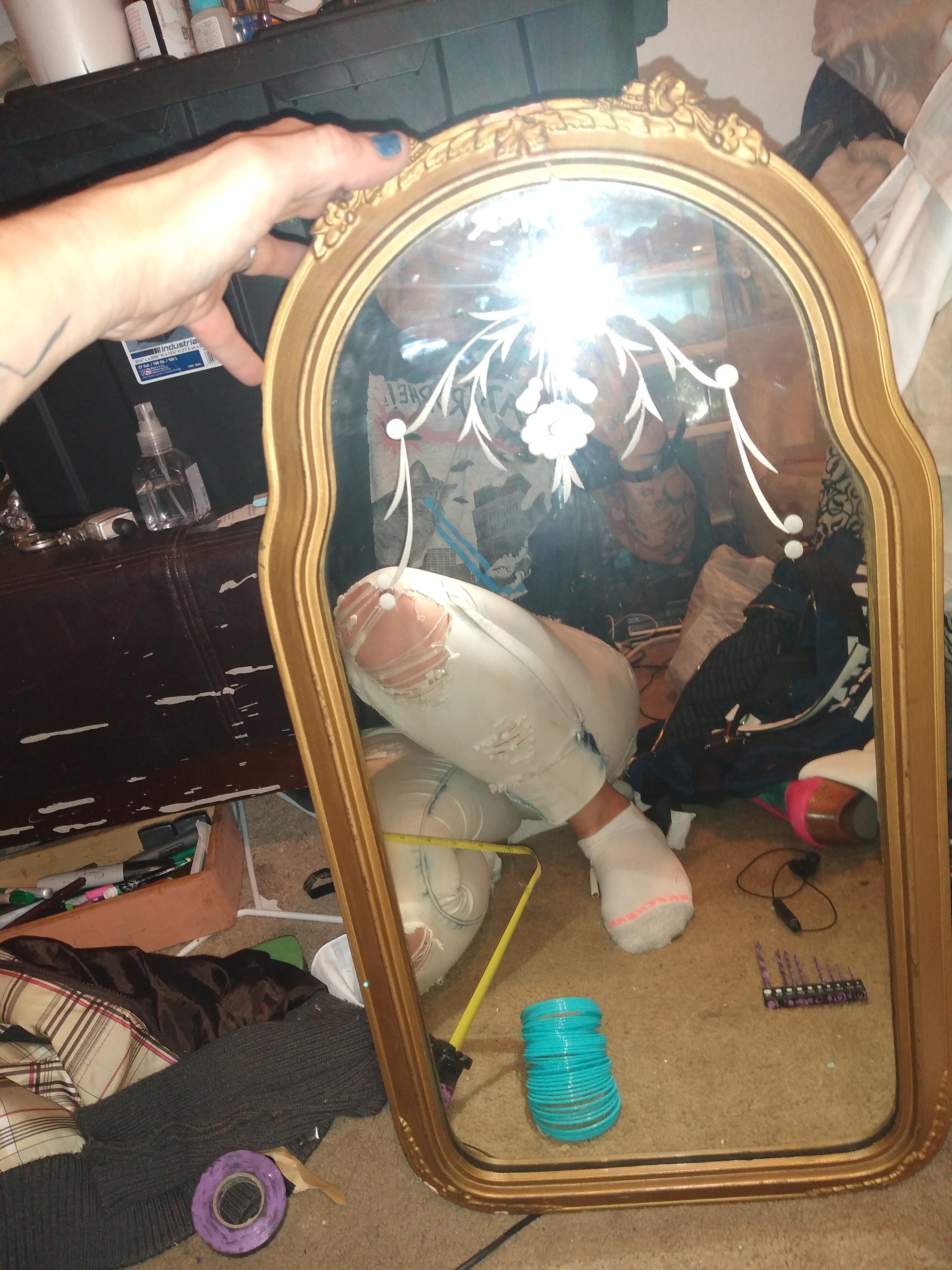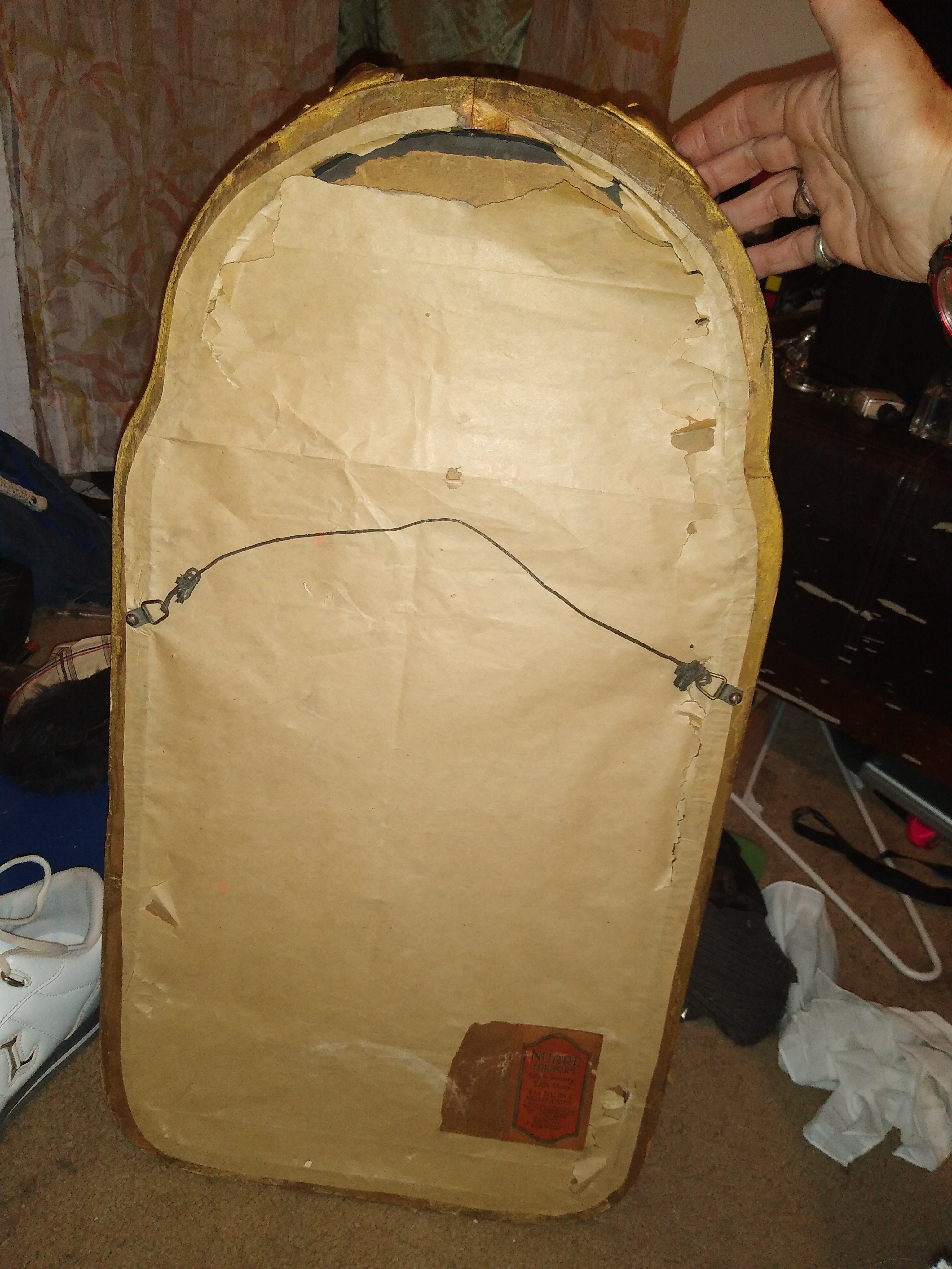 It's an old mirror with wood frame that has some imperfections at the top and that paper backing is torn on some spots The mirror is etched at the top with a flower design and has the company sticker on back lower corner and it 26 in height and 13 1/4in wide