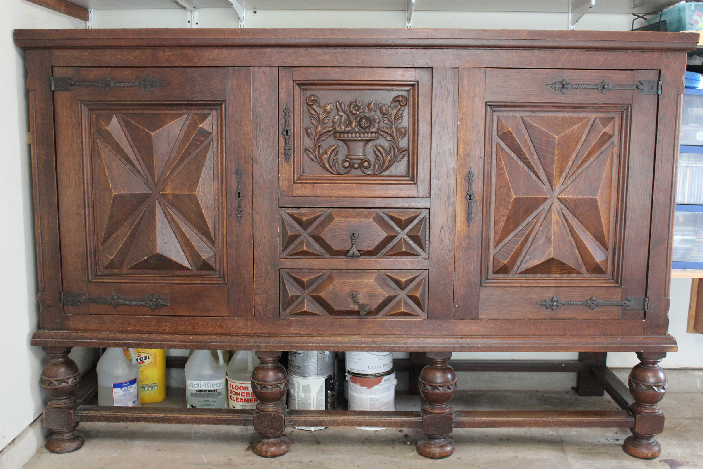 I am not sure what kind of cabinet this would be called. It has relief carvings on the face as you can see and the drawer pulls are hand forged iron and the key hole covers and hinges appeared to be stamped not cast .
