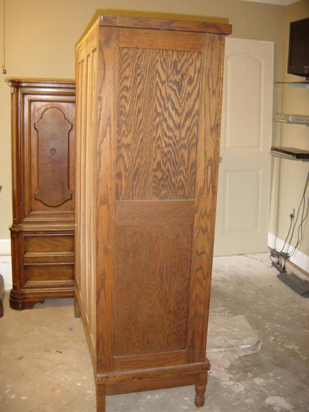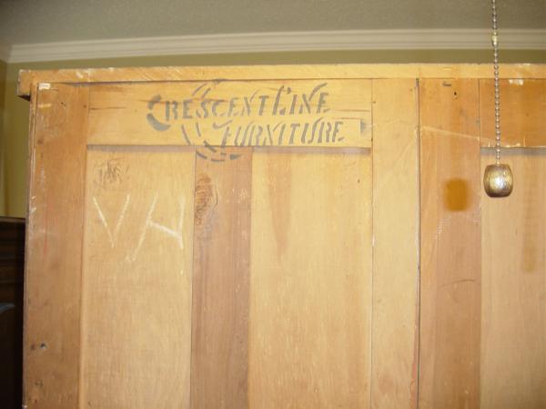 Solid oak wood chifferobe. 5 drawers w/brass pulls. Hat box that locks. Closet with metal hanging rack. Beveled glass mirror. Tags on back indicate it was made by New Orleans Furniture and chair manufacturing co. Also tagged with Crescent Line Furniture. The number 400. Several names are written on the back: John Houghton, Joe Houghton, Helen Houghton, Ann Houghton, Bill Houghton, and Mrs. W. A. Houghton. Includes key for both locks.