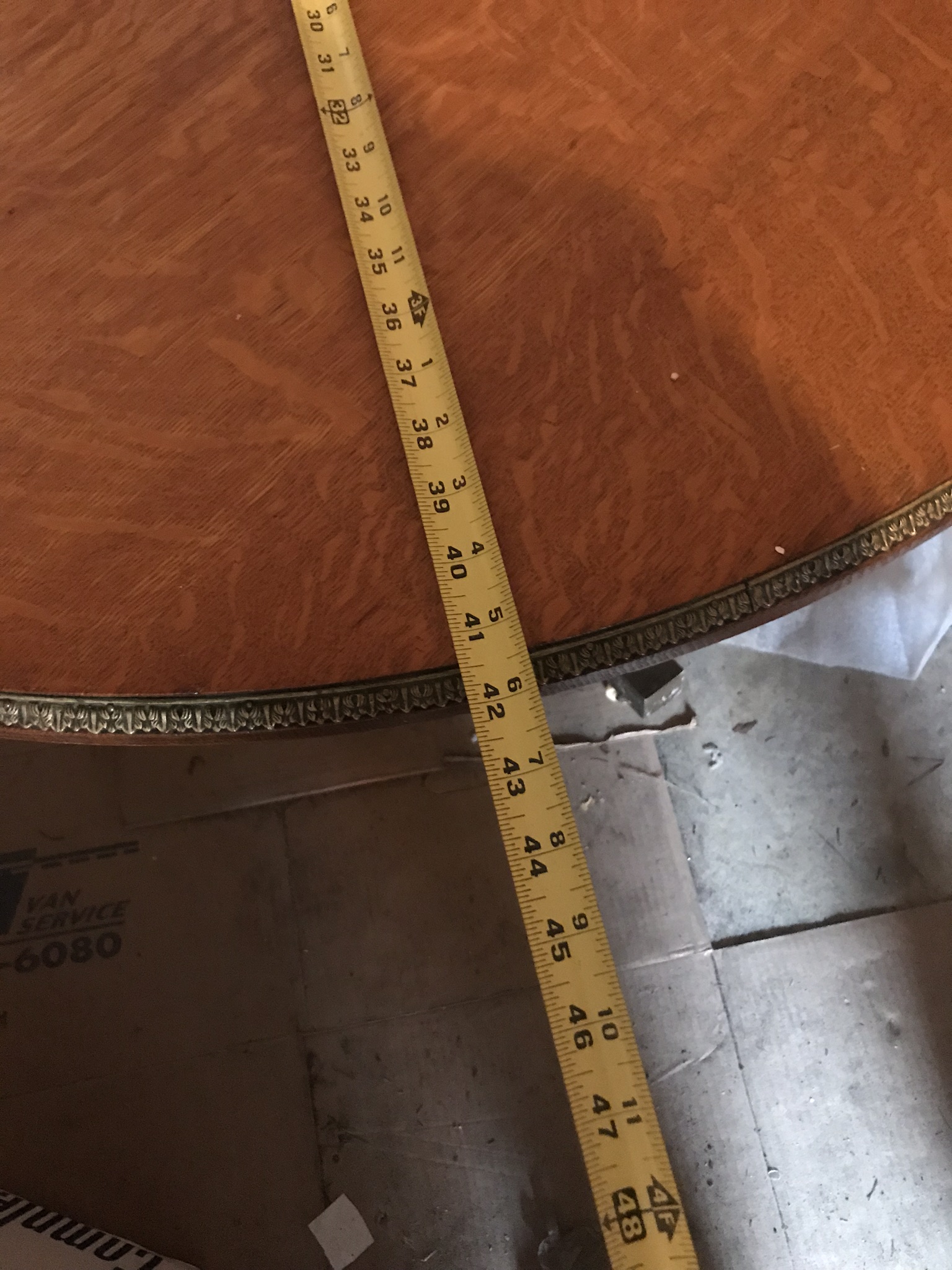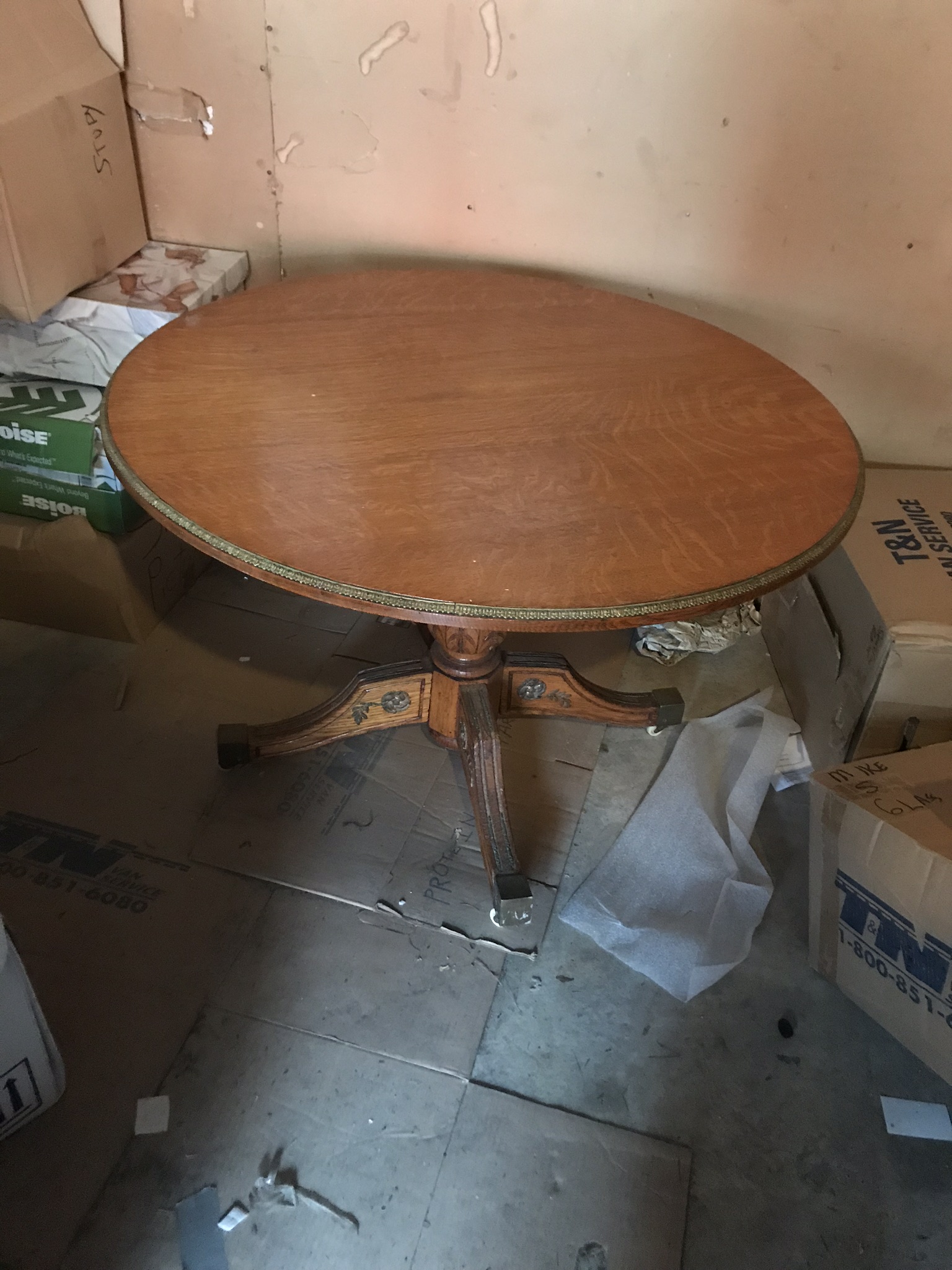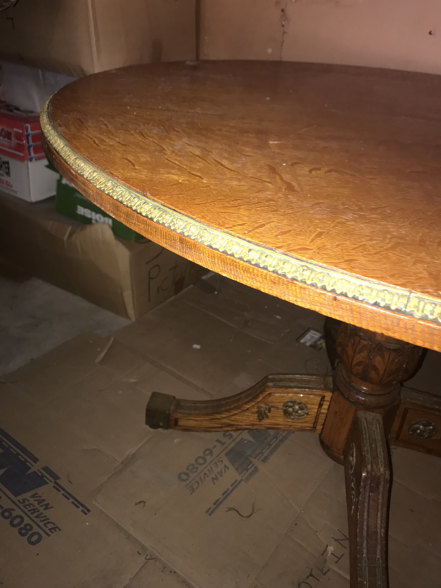 Rare 42” wide reclining oak table with brass edging, foot covers and othe brass features on the legs.