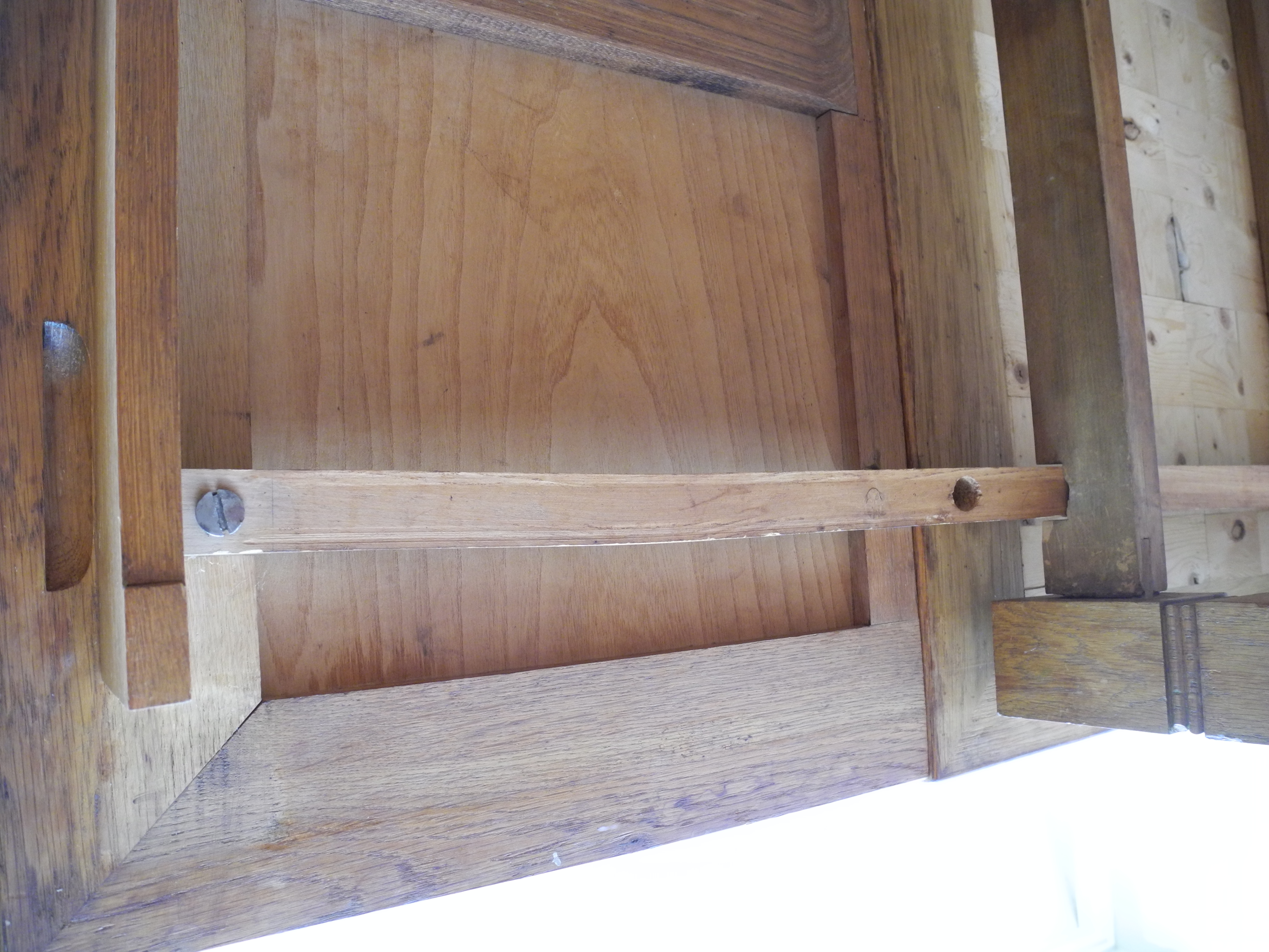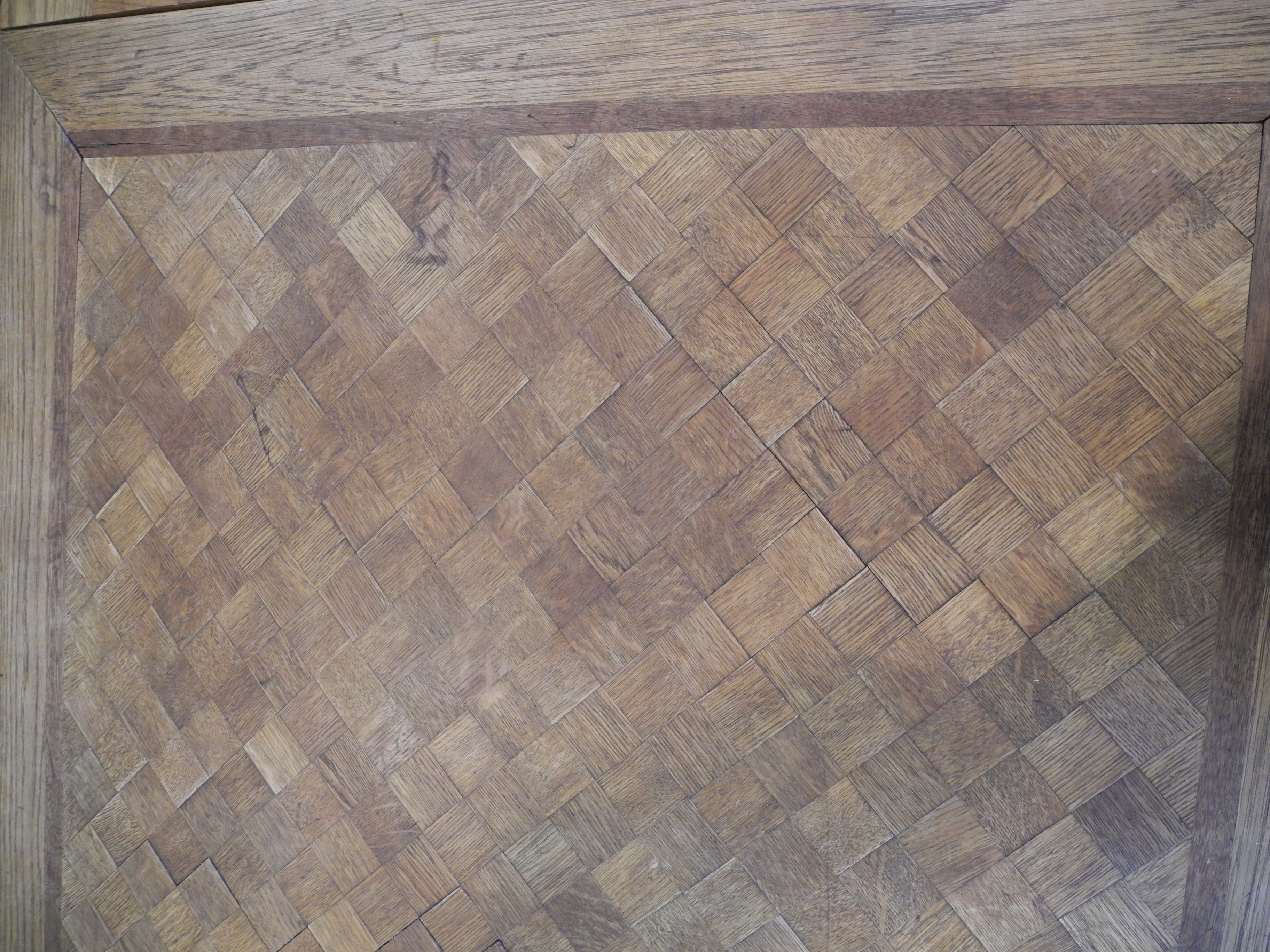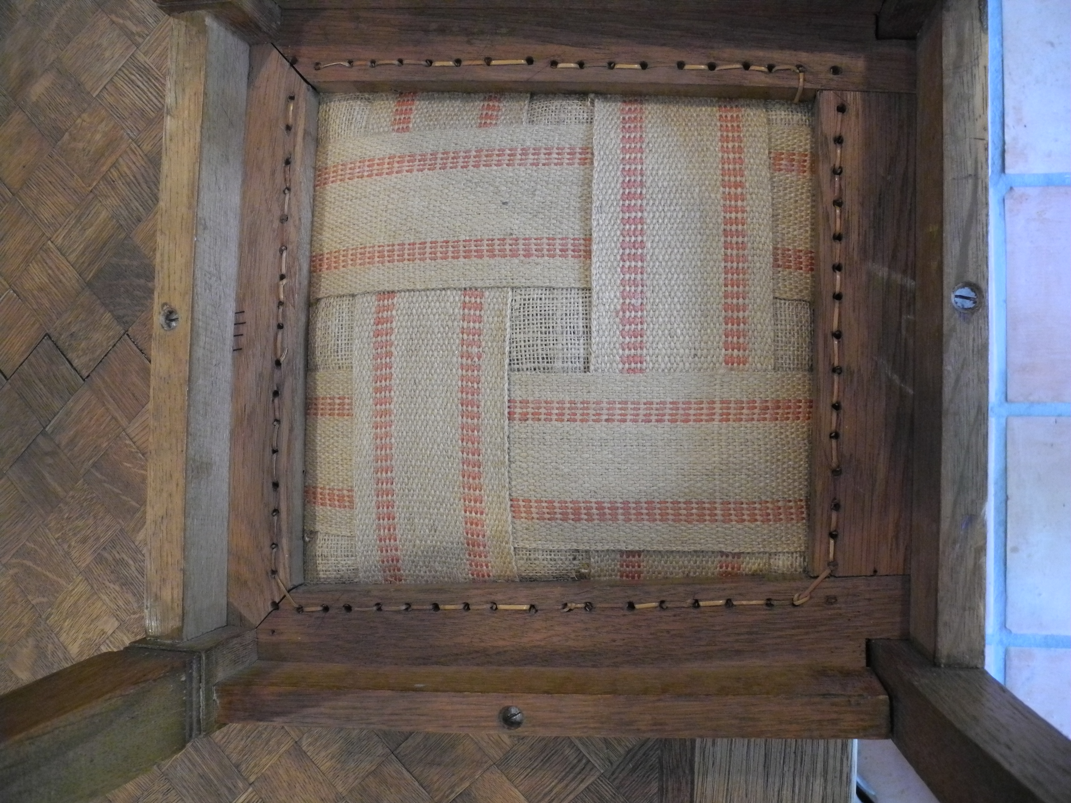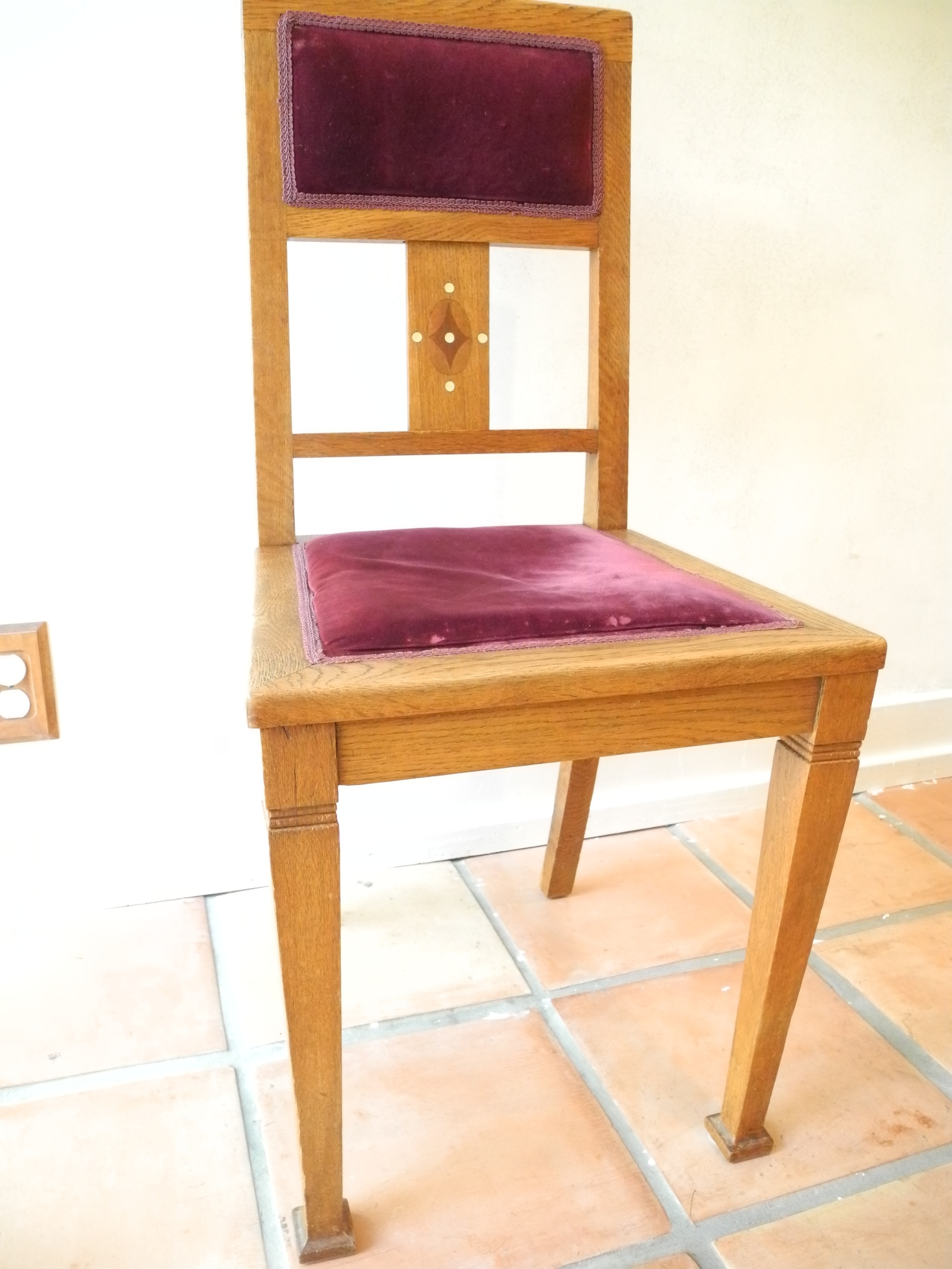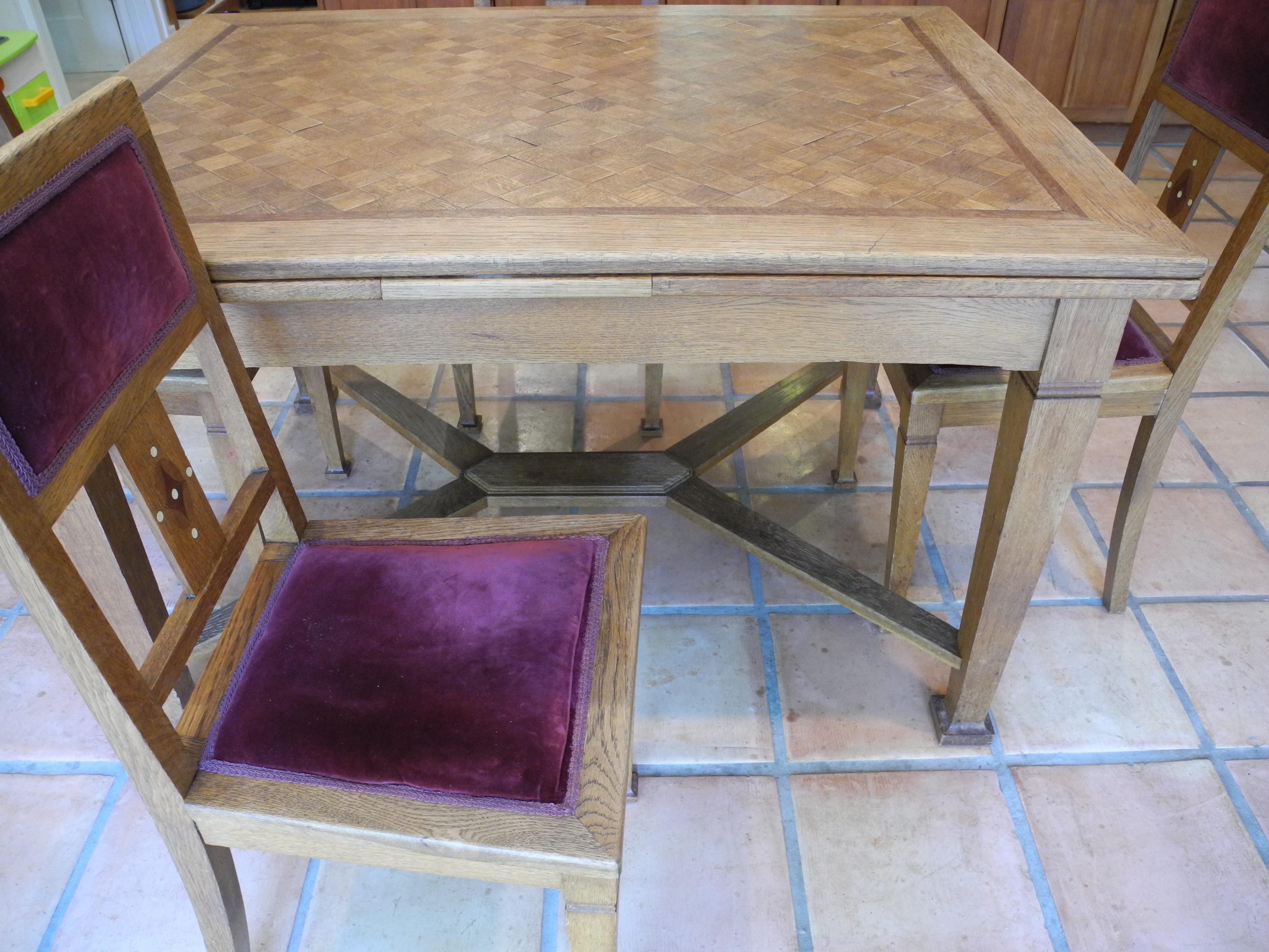 I bought this table in New Mexico, and the store owner knew nothing about it. The two side draw leaves extend the table to 92" from 52". It is made of oak with what I presume to be the original finish, and no polyurethane. It came with 5 matching chairs with inlay and old velvet seats which are stuffed with something that sounds crunchy... like straw. Photos show the bottoms of the chairs.