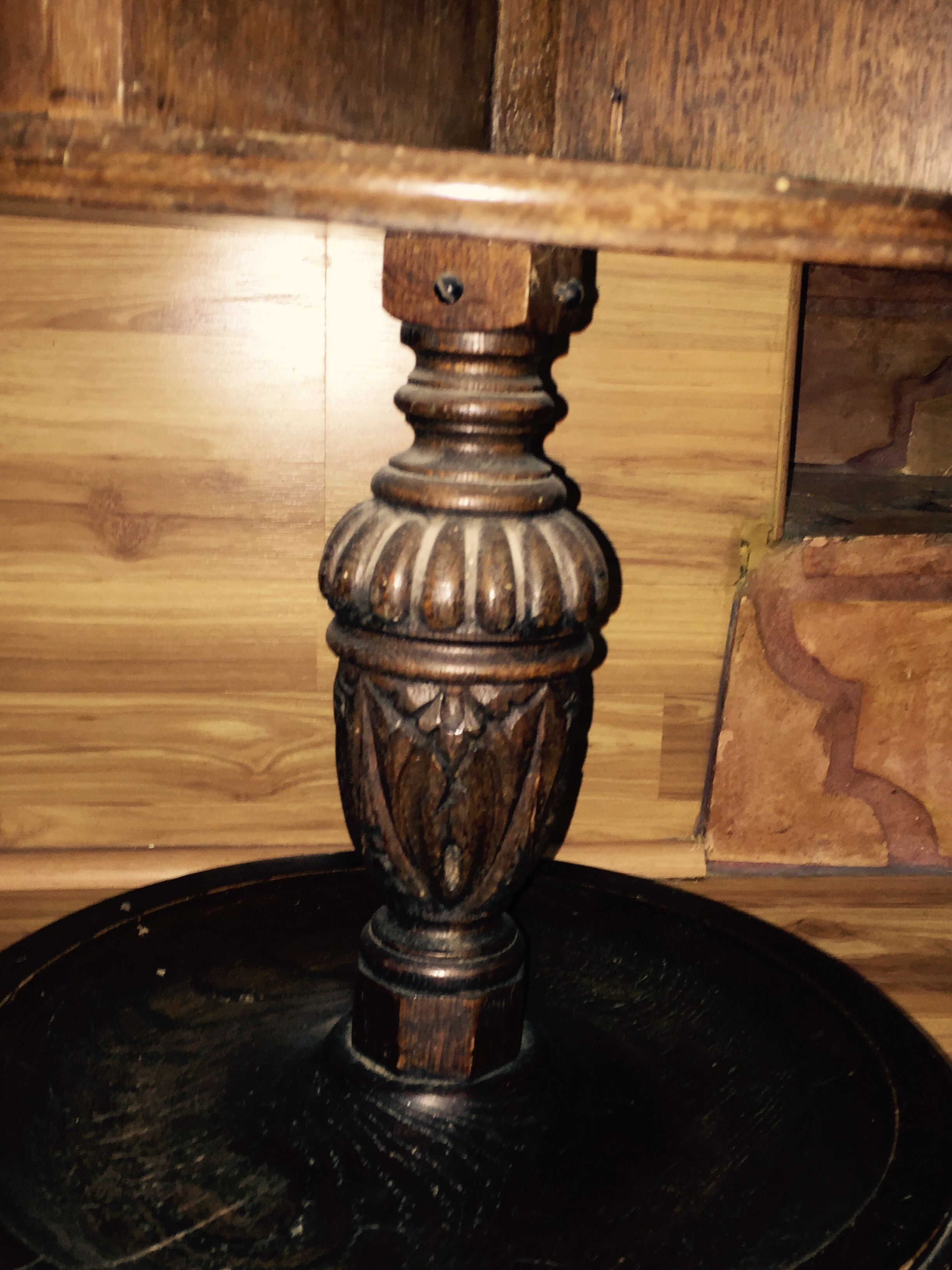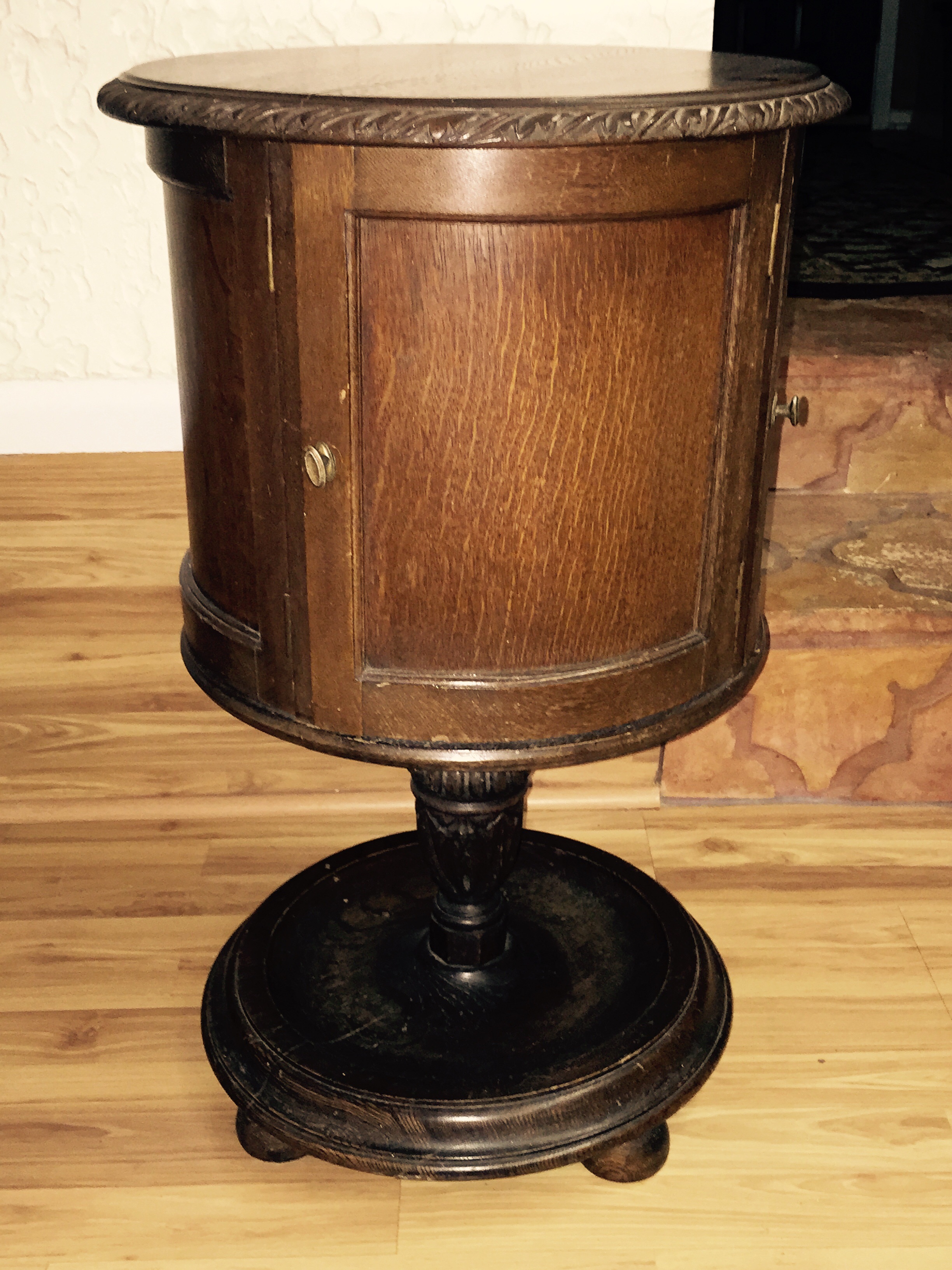 Quarter sawn oak drum shaped table with doors and shelves. Purchased 35 years ago at auction in Texas.
