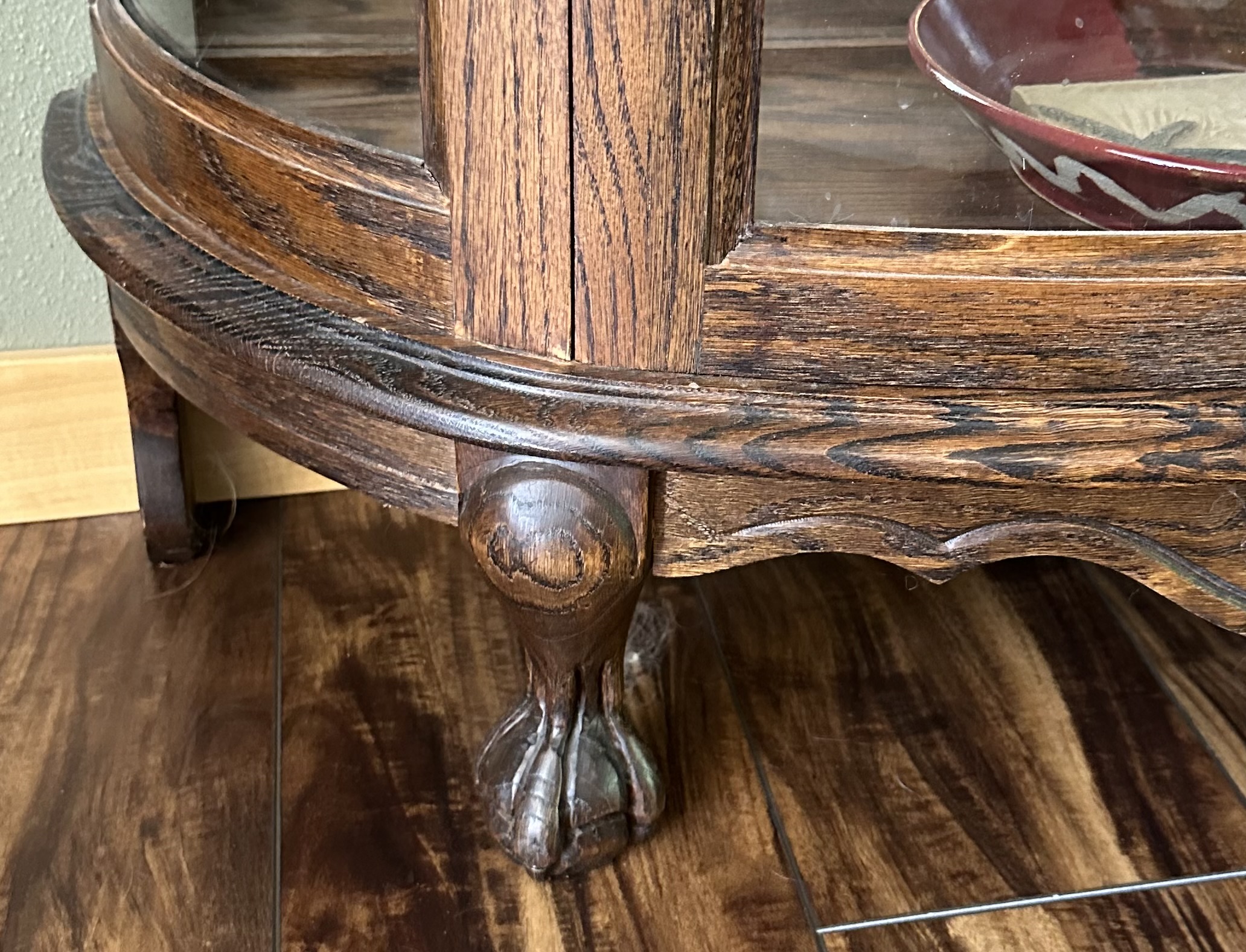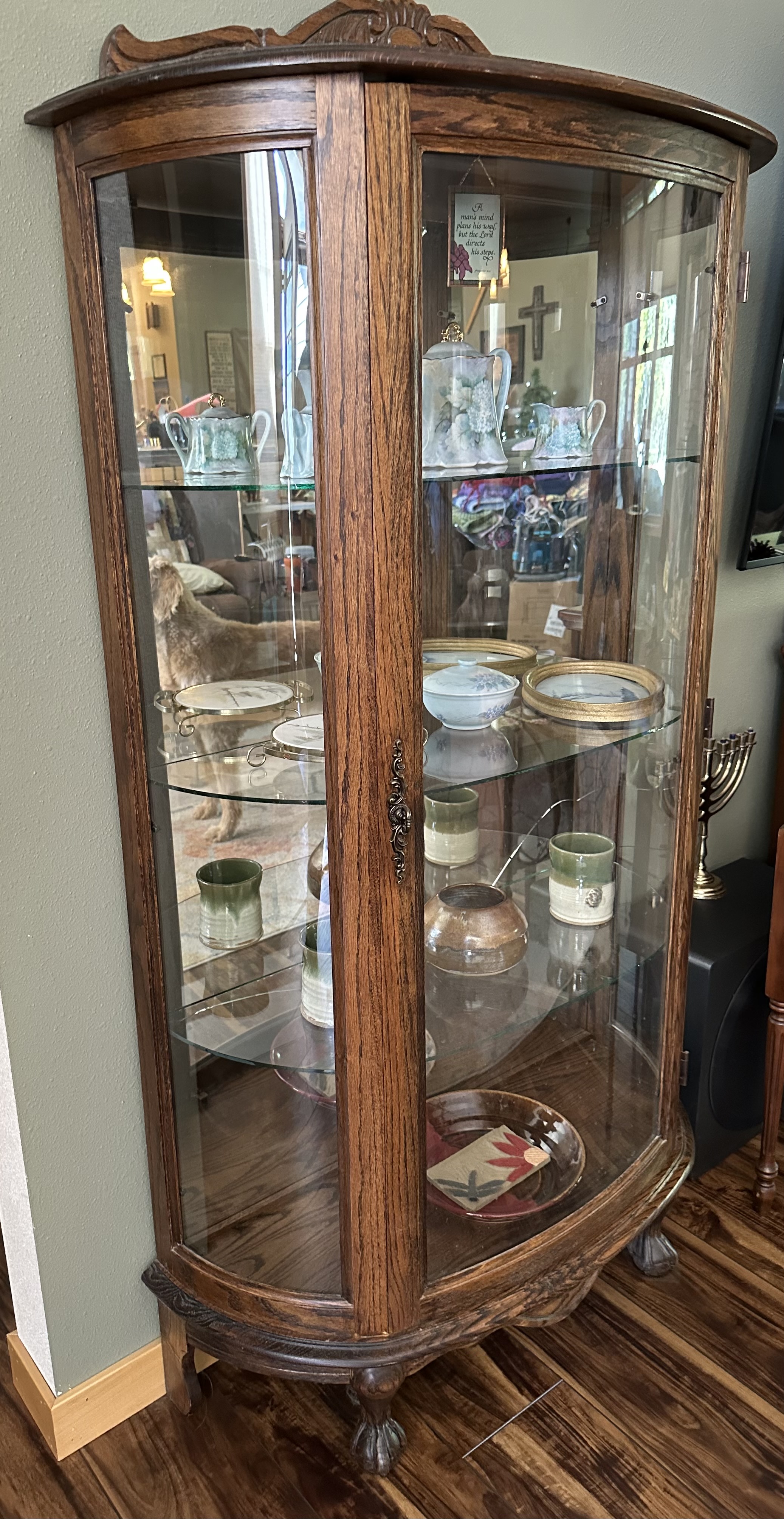This is a beautiful oak half oval hutch with claw feet and mirrored back. The carved topper lifts off.