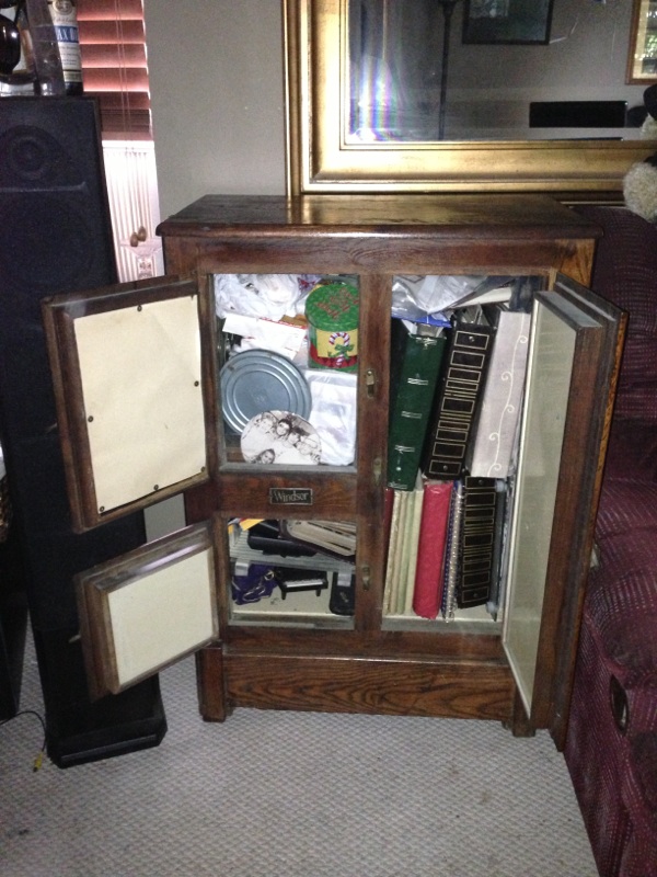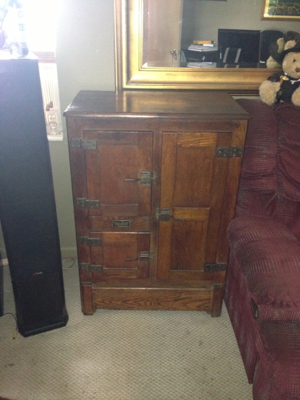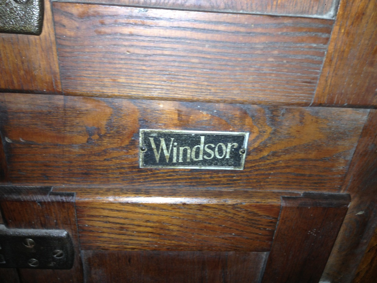 Antique Oak Ice Box. Name plat on front is "Windsor". All original wood and never been refinished. Patina has appearance of mahogany. Doors are firm and tight on hinges. Latches work. The ice platter is the only shelf that remains.