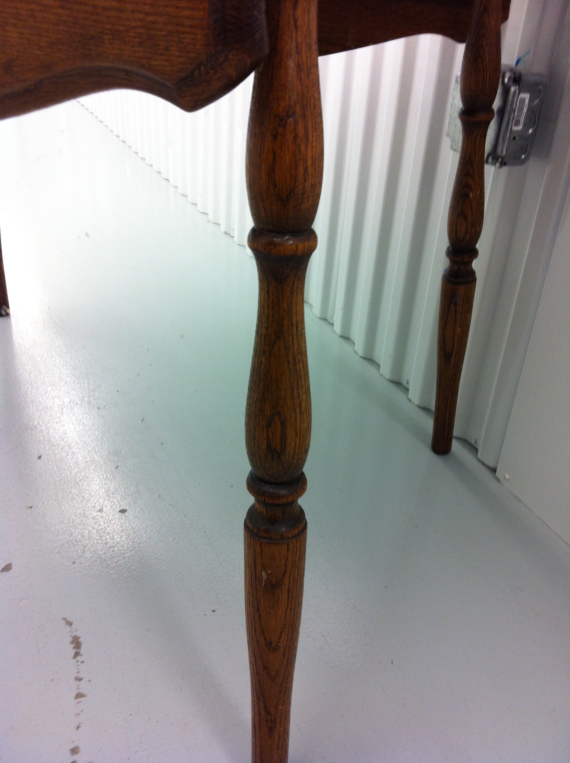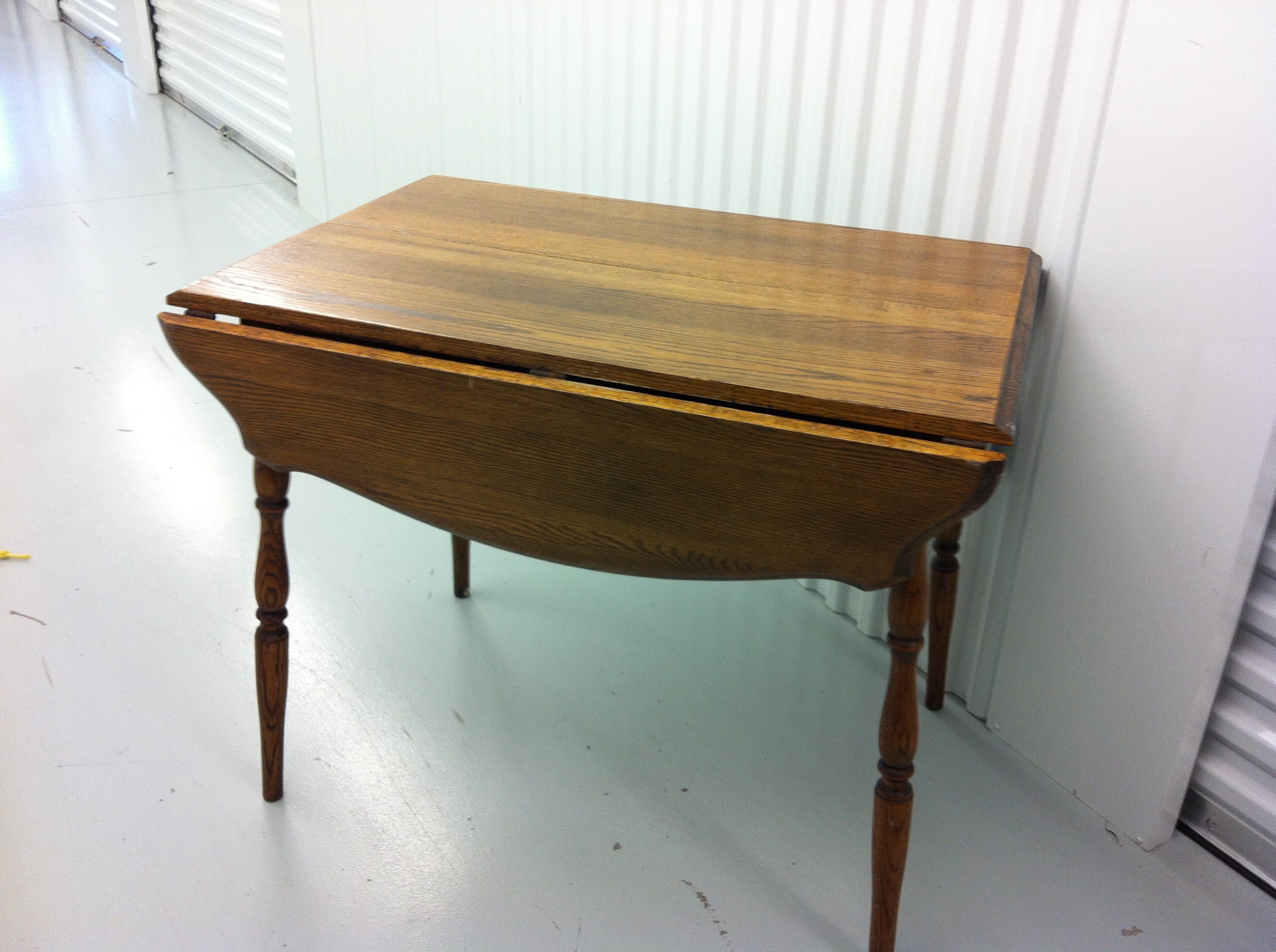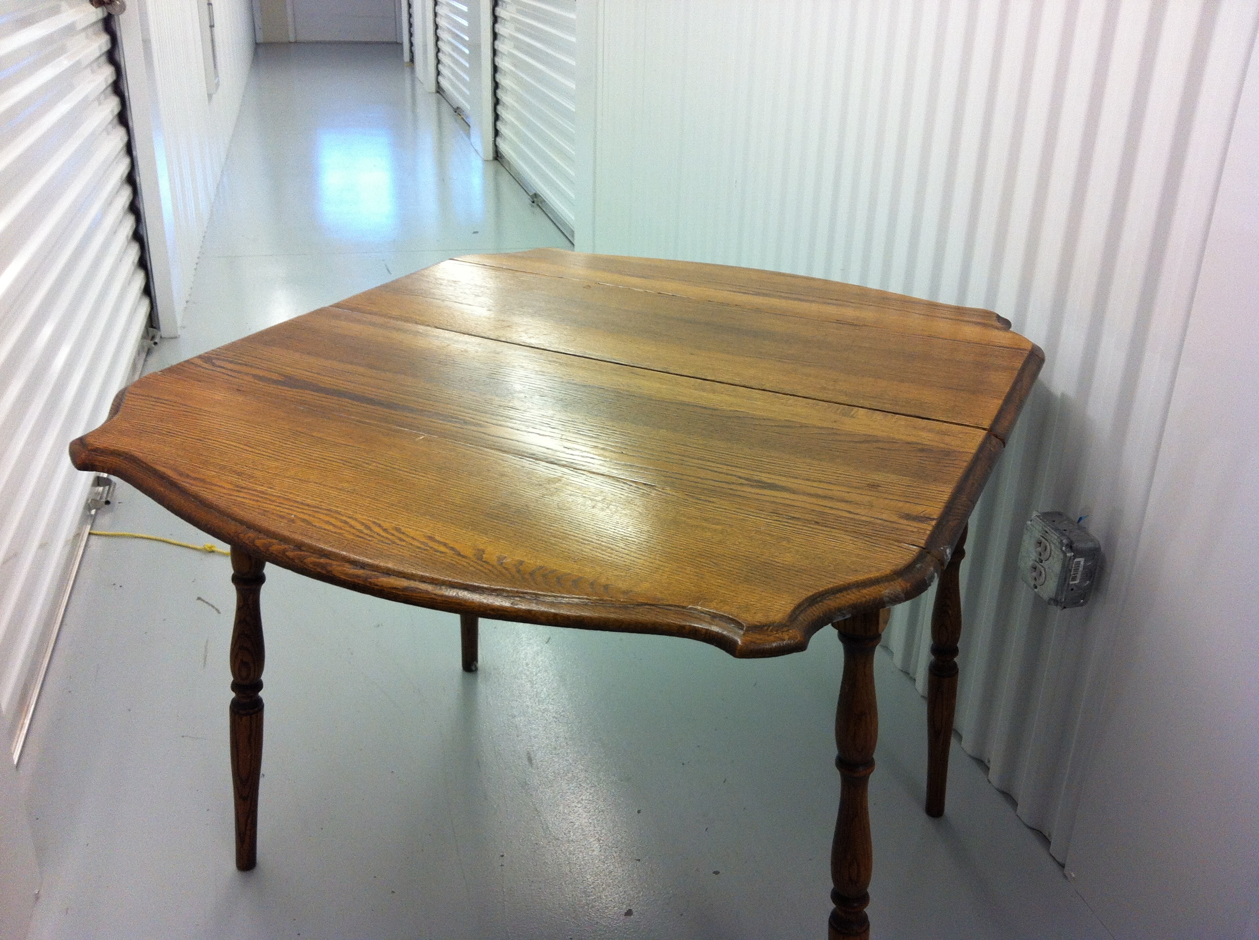 Solid oak kitchen table w/leaf. Seats 4 w/o leaf, 6 with.