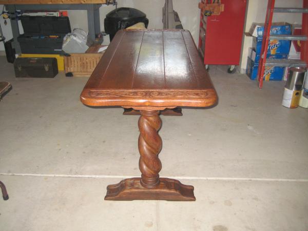 Oak library table having barley-twist pedestals on shoe feet with stretcher for additional strength. the top is made of multiple boards and each end terminates in a hand carved- design. Produced or retailed by O.W. Richardson & Co. Furniture and Floor Coverings. the underside bears it's original stamped metal tag "O.W.. Richardson & Co. Chicago-oak Park and a pattern number "818/296".