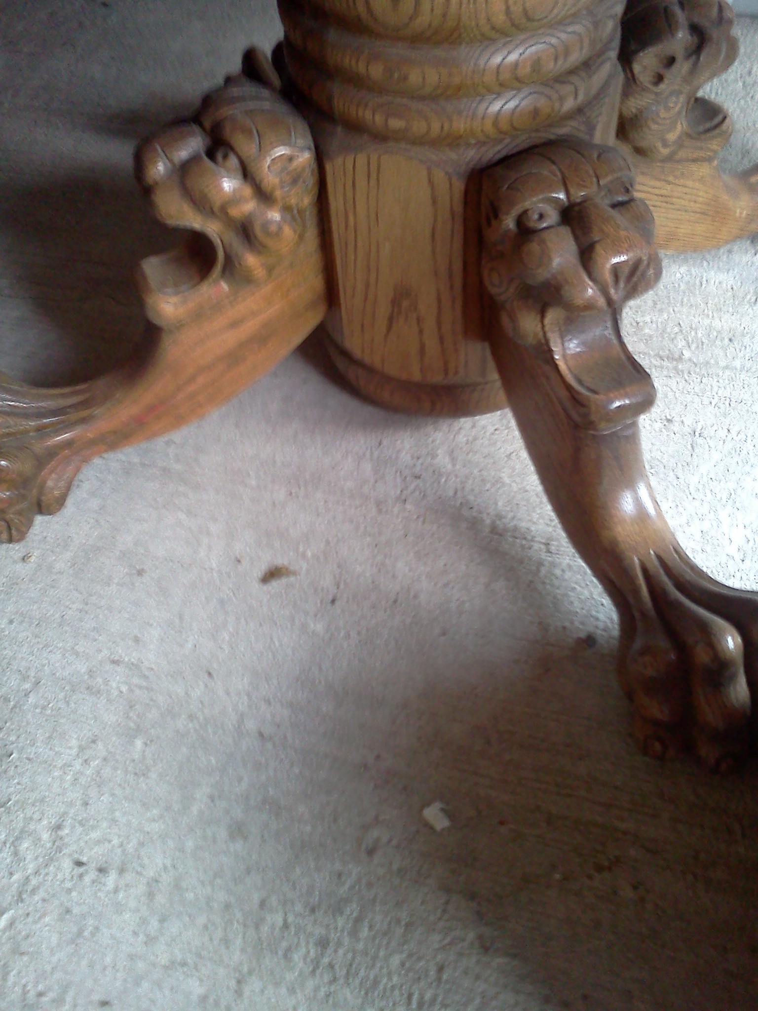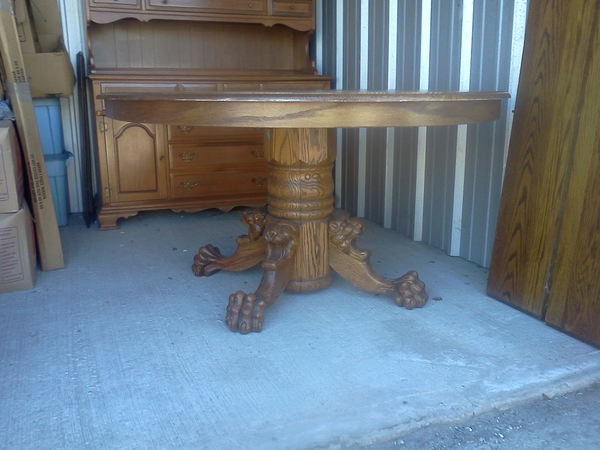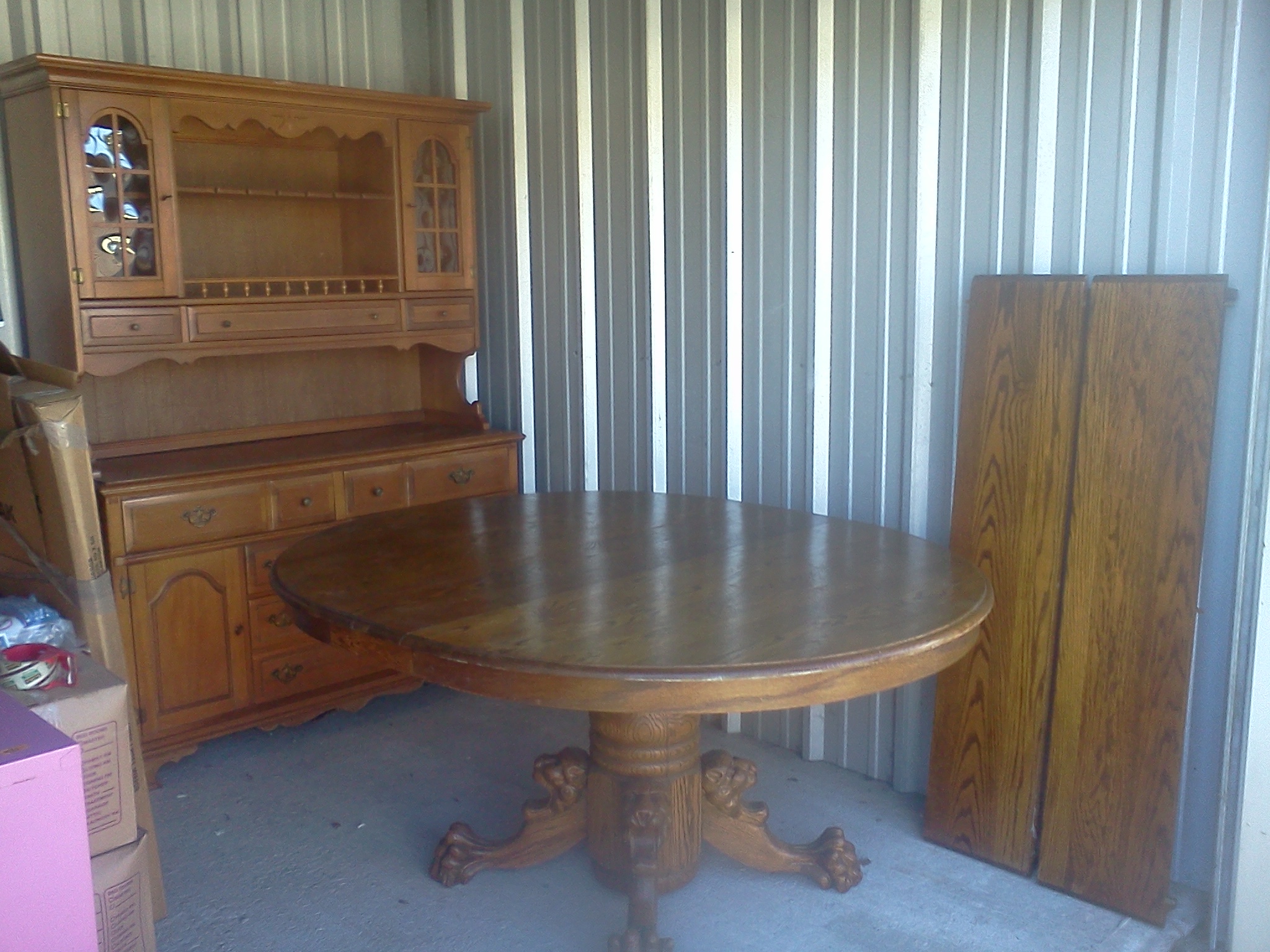 Oval, oak dinning room table. Is around 40 years old and comes with two leafs and four chairs.