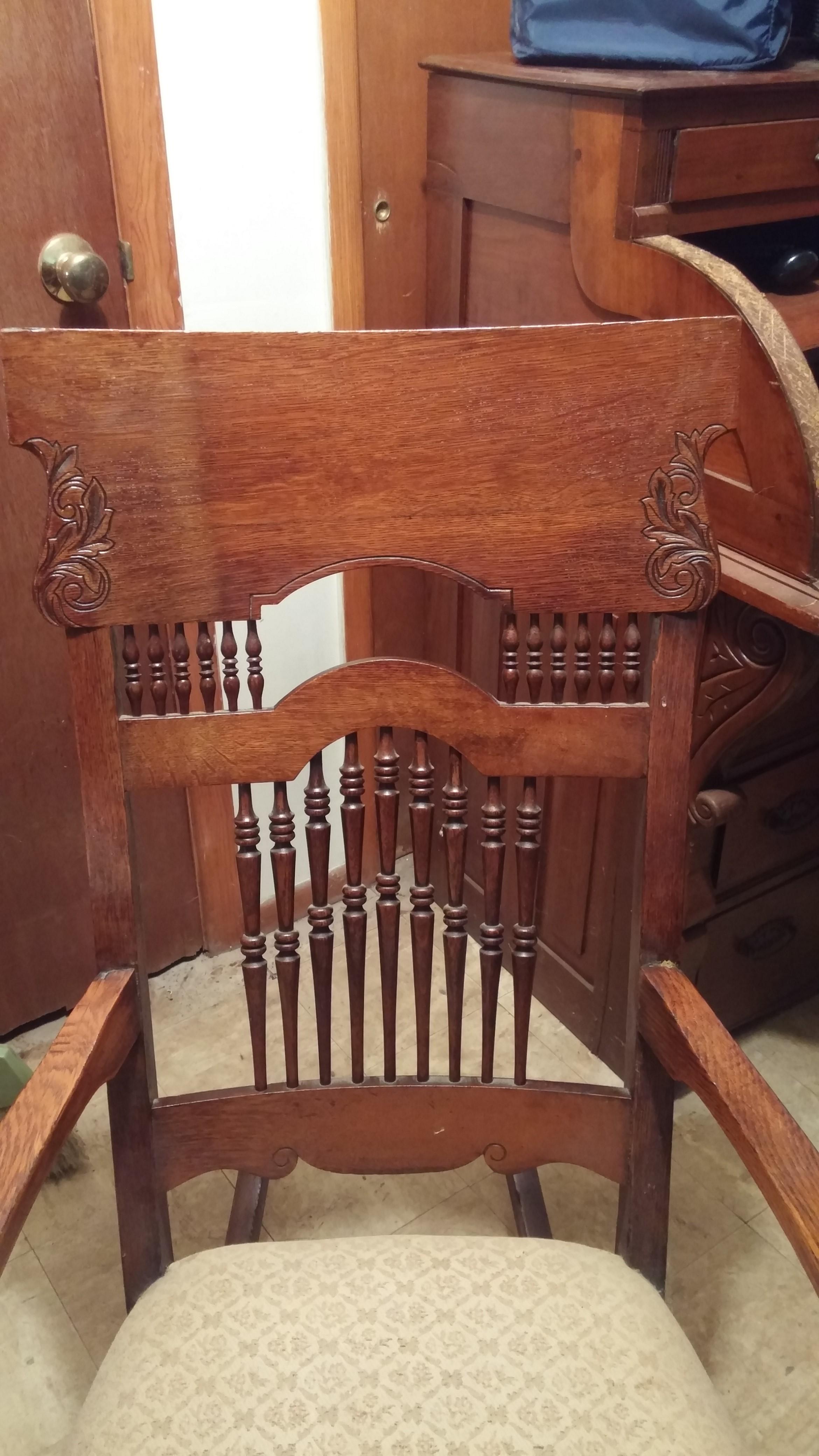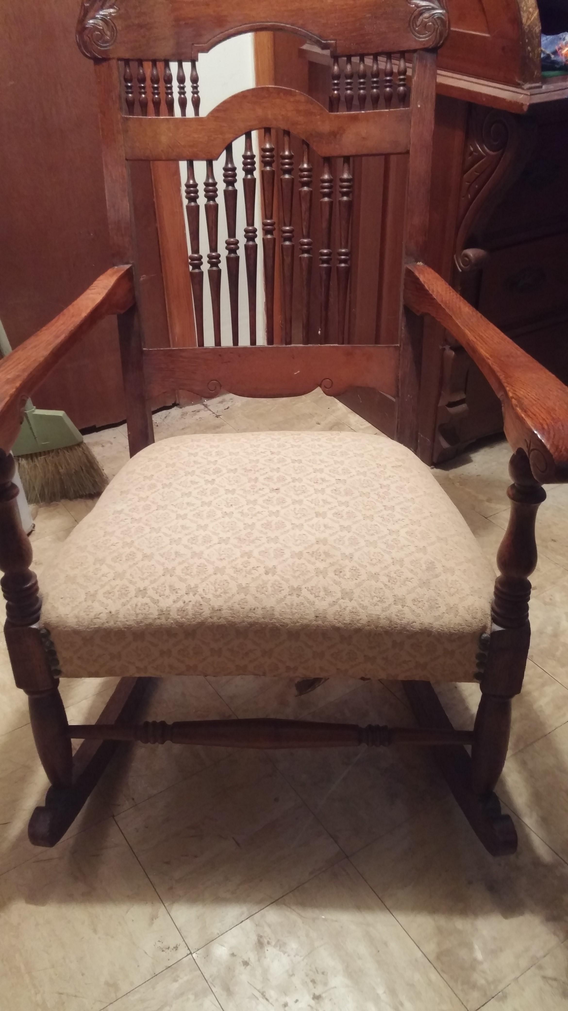 Oak rocking chair with upholstered seat. I have had this chair for quite some time now, was given to me from (I can not remember). Would like to know an approximate value. It is in good shape, sturdy and quite heavy. Thank you.