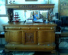 Oak sideboard with beveled mirror, winged griffin shelves on each side of mirror, clawed front feet