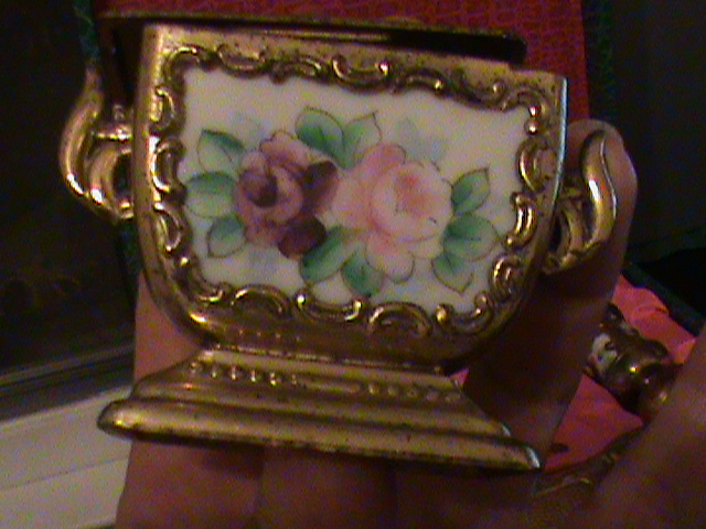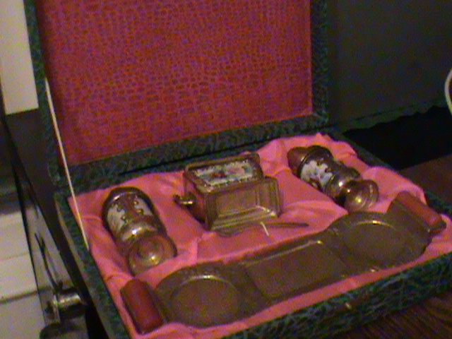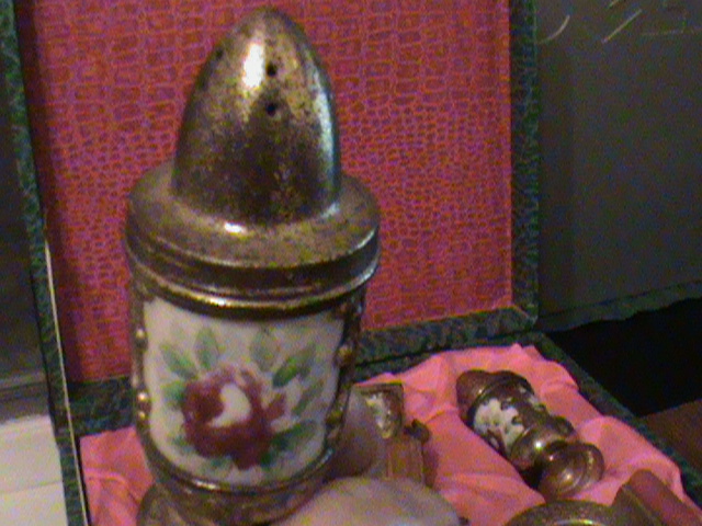 This is a salt, pepper, and I think sugar, set.  It seems to be made of glass or pottery and is surrounded by gold colored metal?  I am not sure.  I dont have a clue really what it is or what its worth.  Thanks for any help.