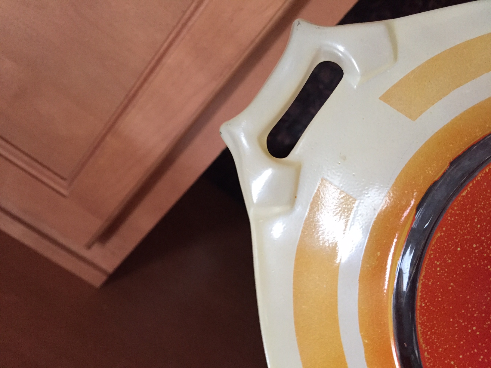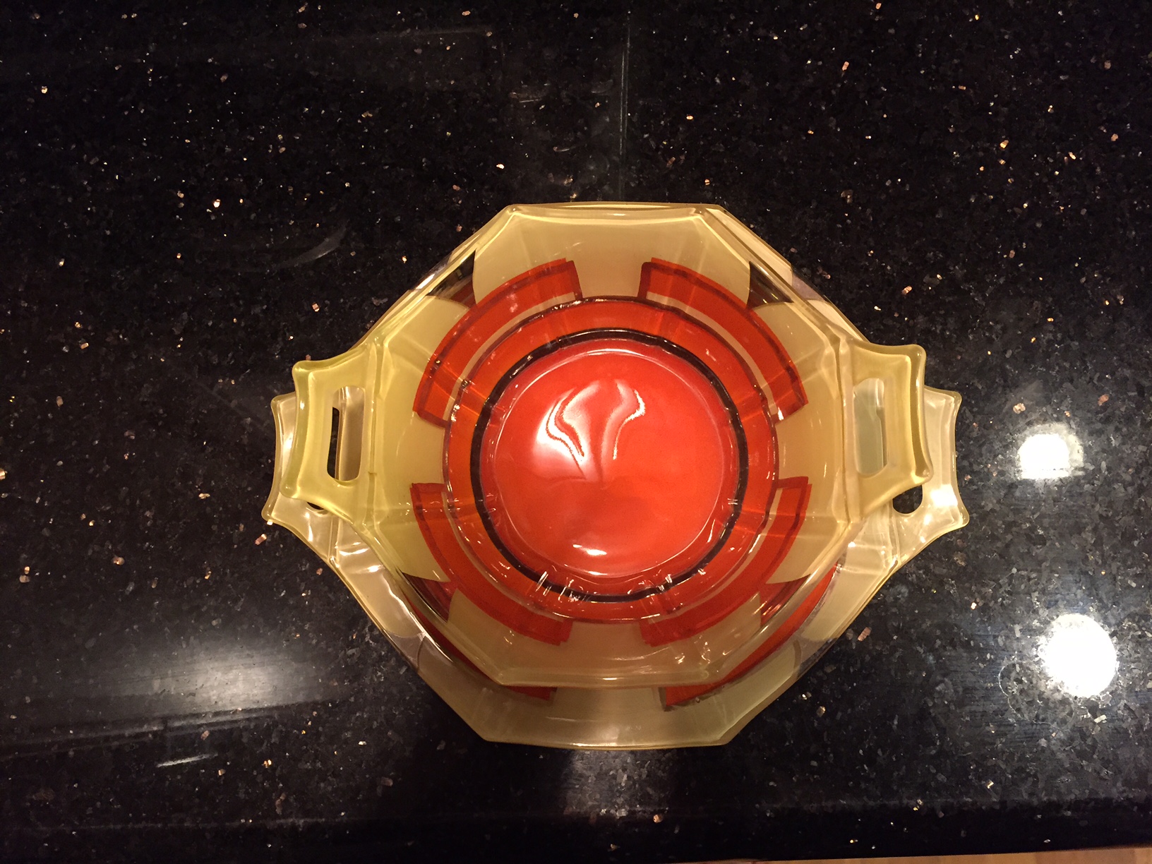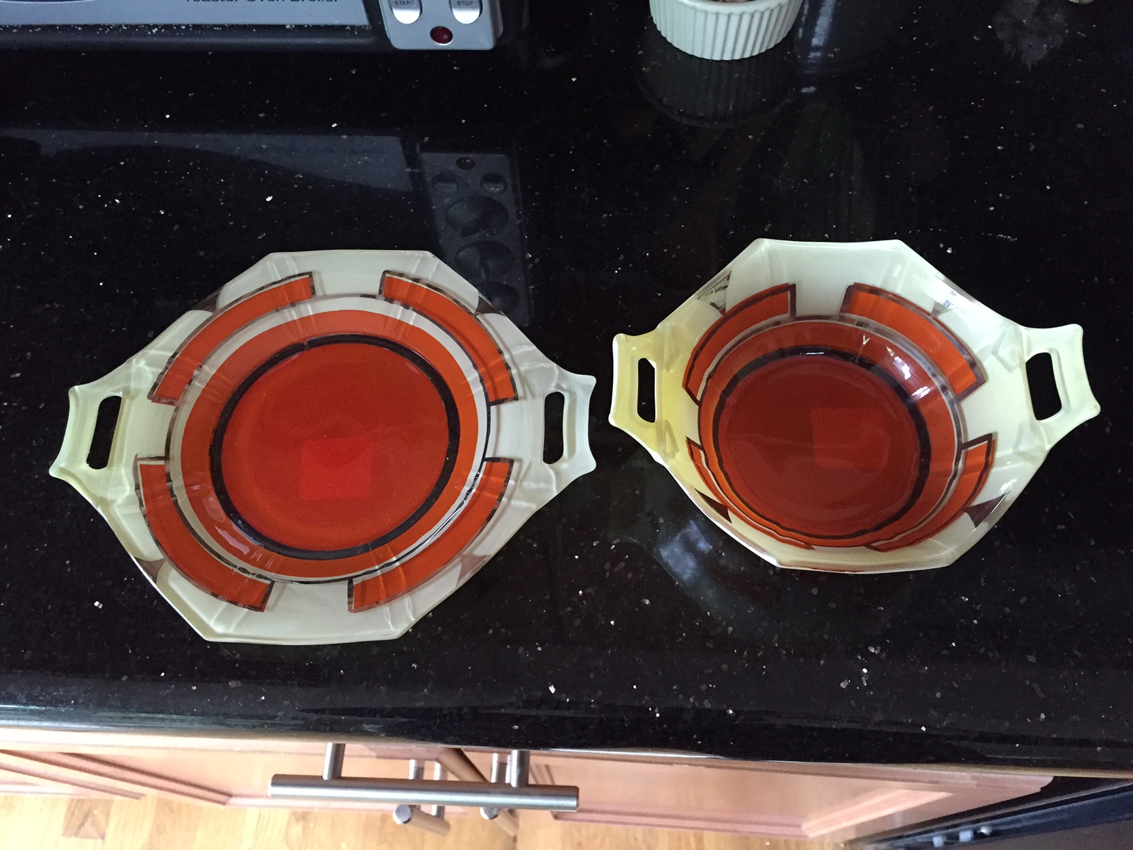 Octagon shaped glass bowl and plate orange cream silver 2 handles