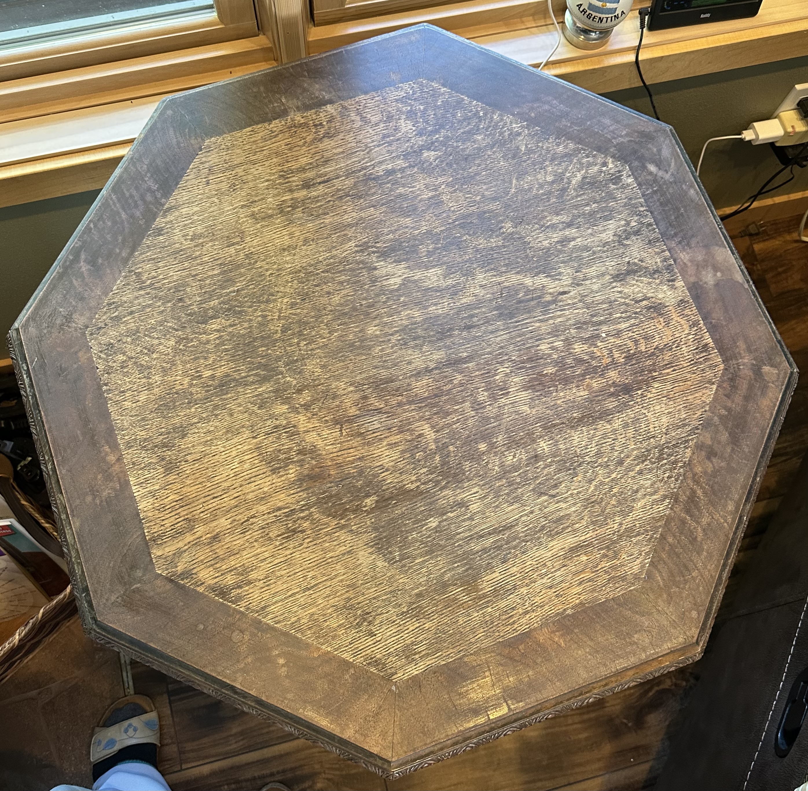 This octagon table likely dates back to the late 19th to early 20th century, a period known for intricate woodwork and decorative furniture designs. The octagonal shape was popular in Victorian-era furniture, often associated with aesthetic movements that emphasized craftsmanship.