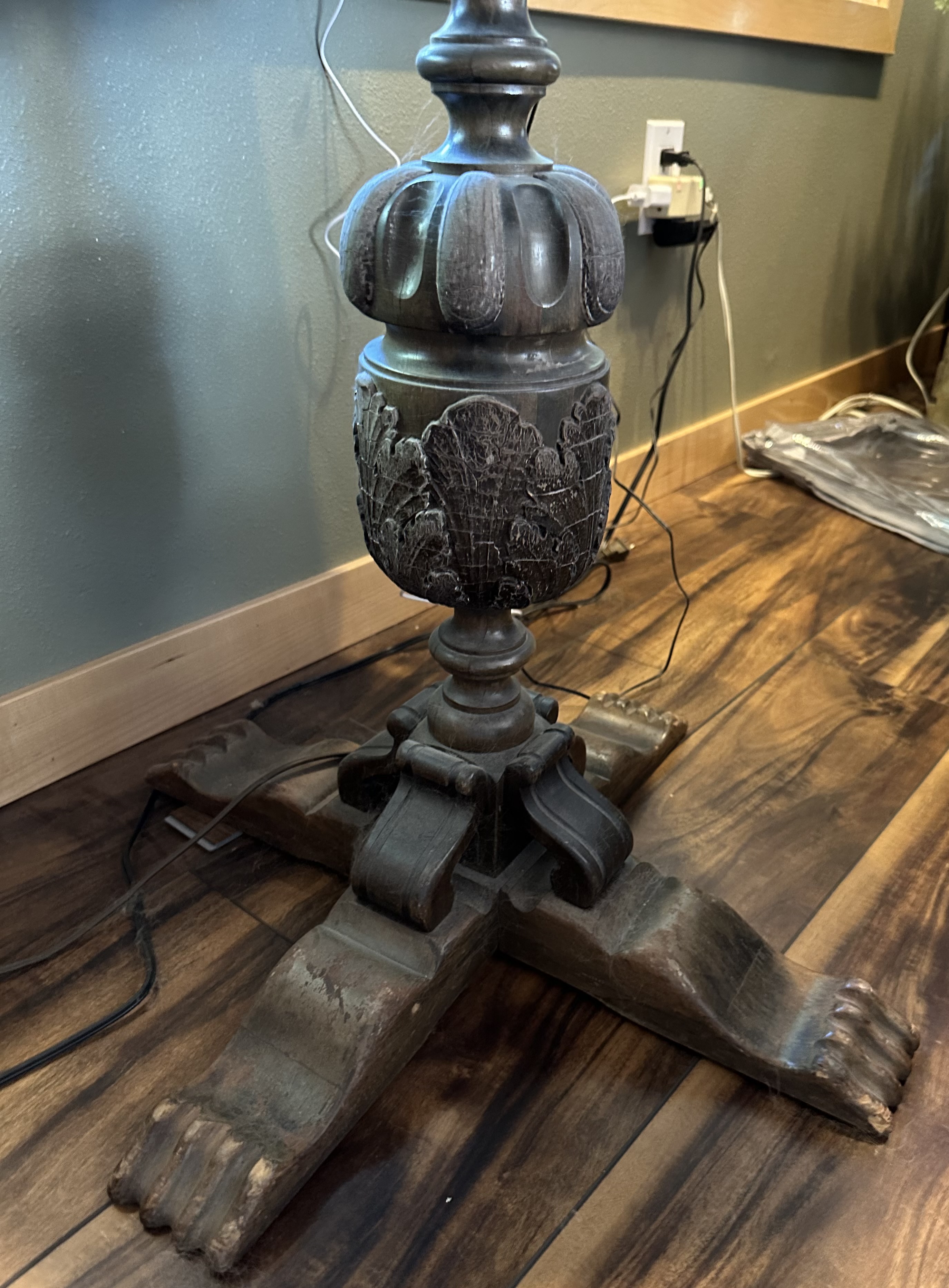 Old table, octagon with carved decorative pedestal. Finish on top in poor condition pedestal in good condition.