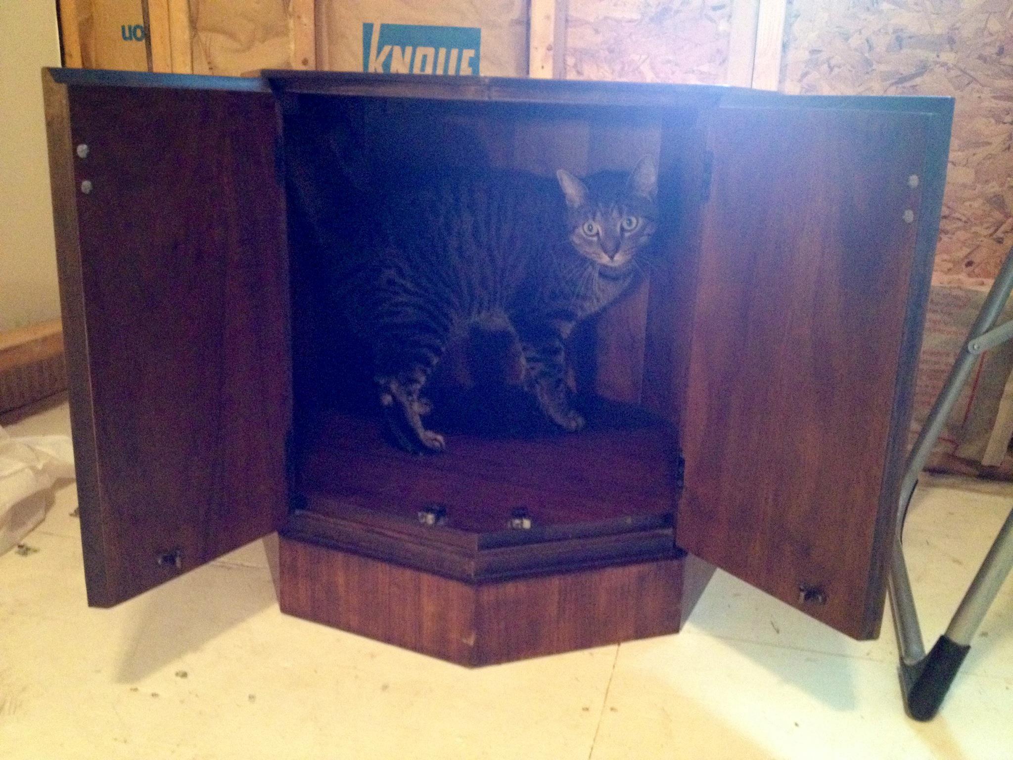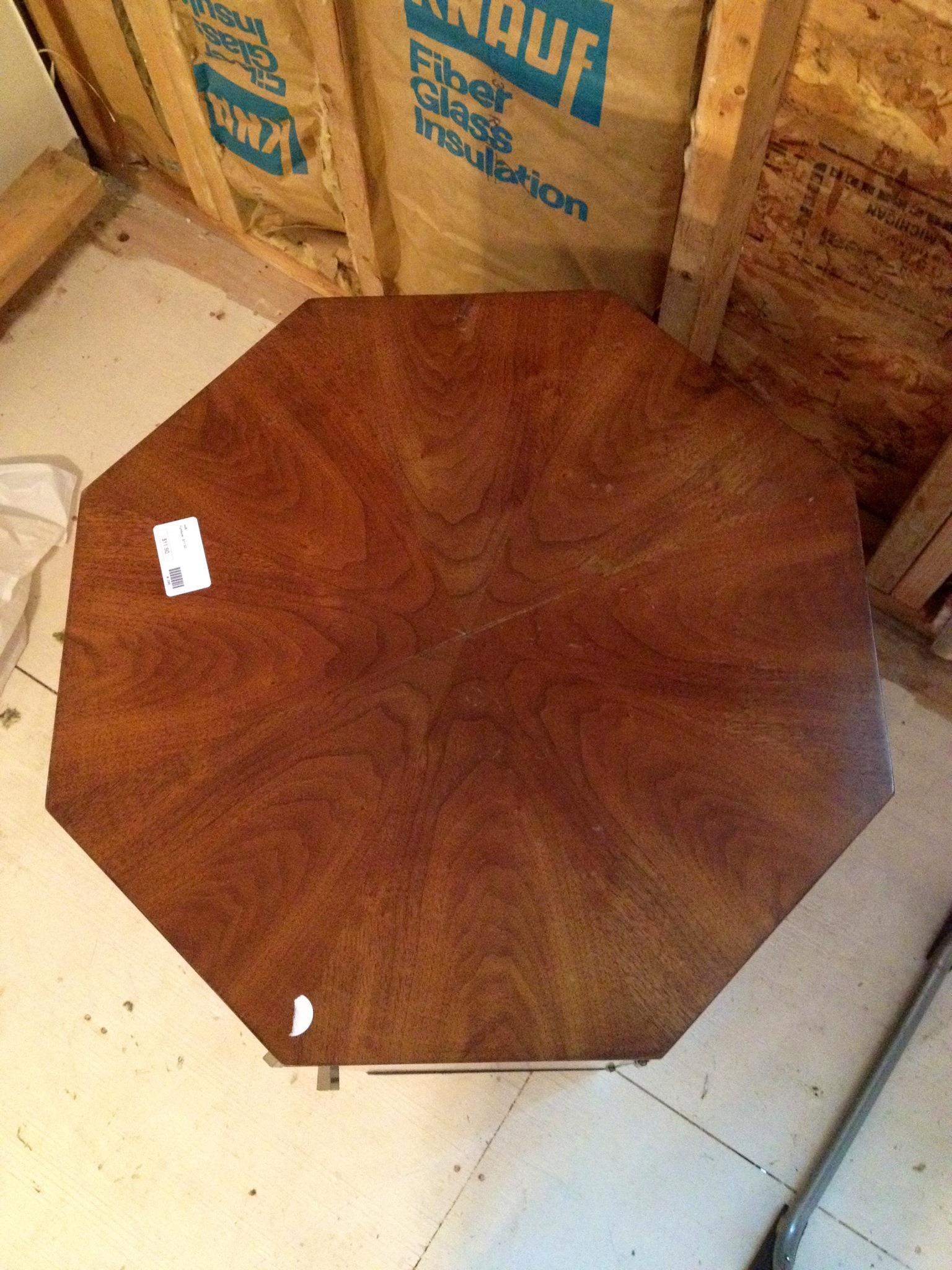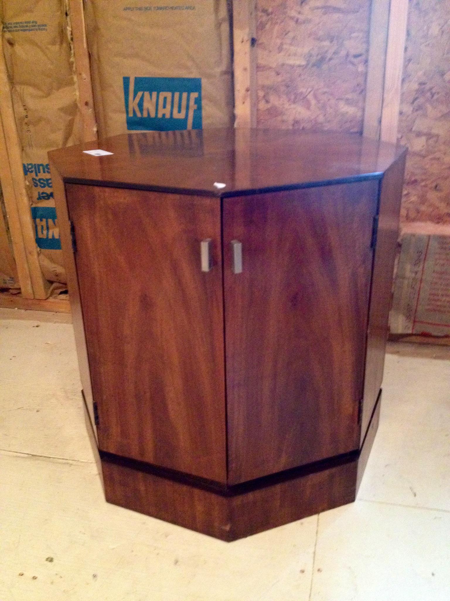 The cabinet is 24 inches tall and octagonal. It is approximately 24 inches from point to point and 22 inches across the flat. It is solid wood with veneer. It appears to be mahogany or maybe walnut, the grain is very tight and rather shallow. But it is veneered so I don't know if the grain is a judge of type of wood. The finish appears to be french polished. The interior is quite dark, as with age. The bottom has been stapled at the joints. The bottom appears new and it has been repaired (?)/worked on with new wood and screws.