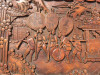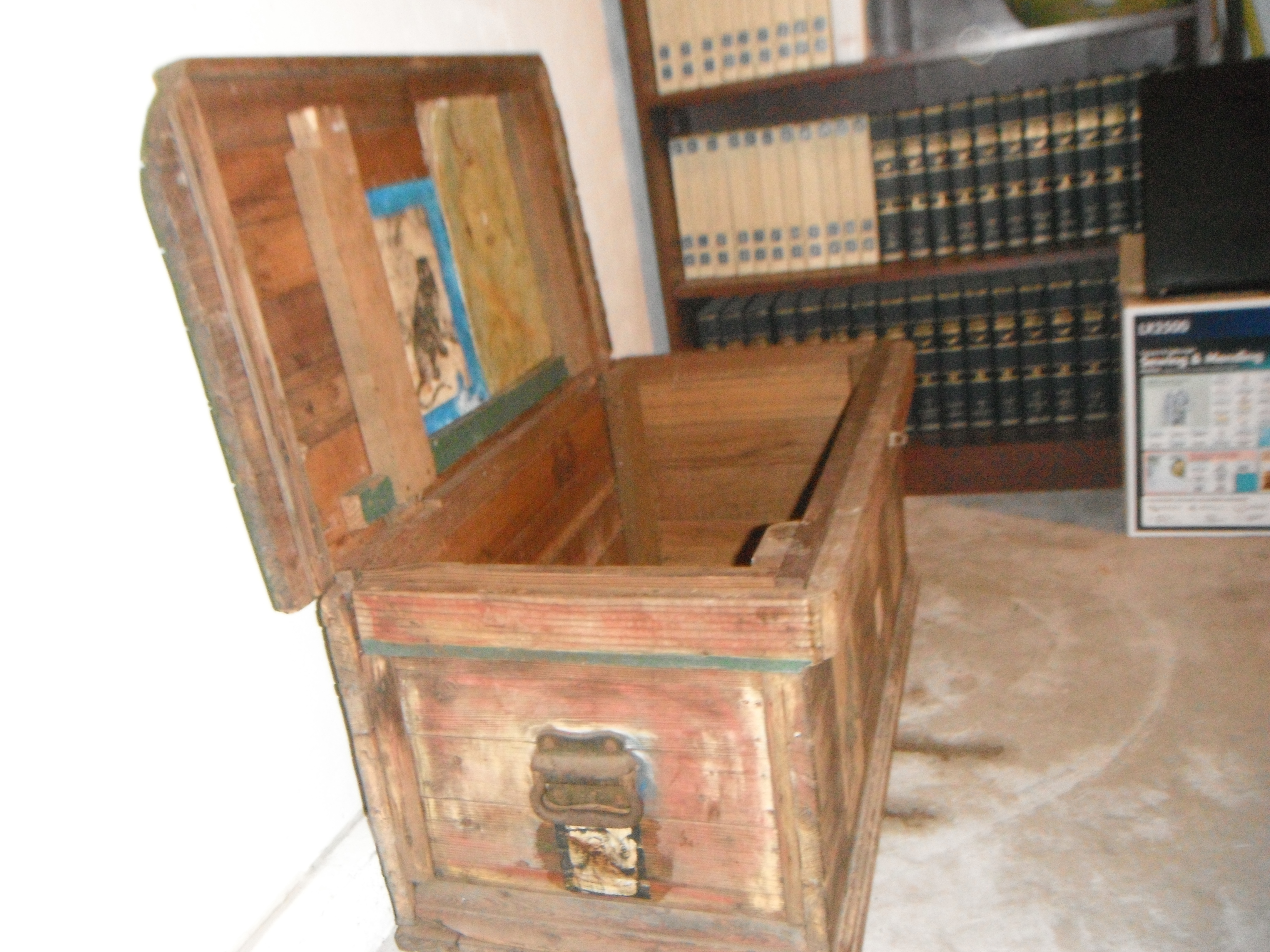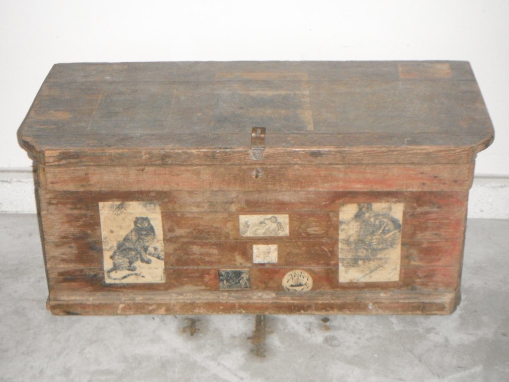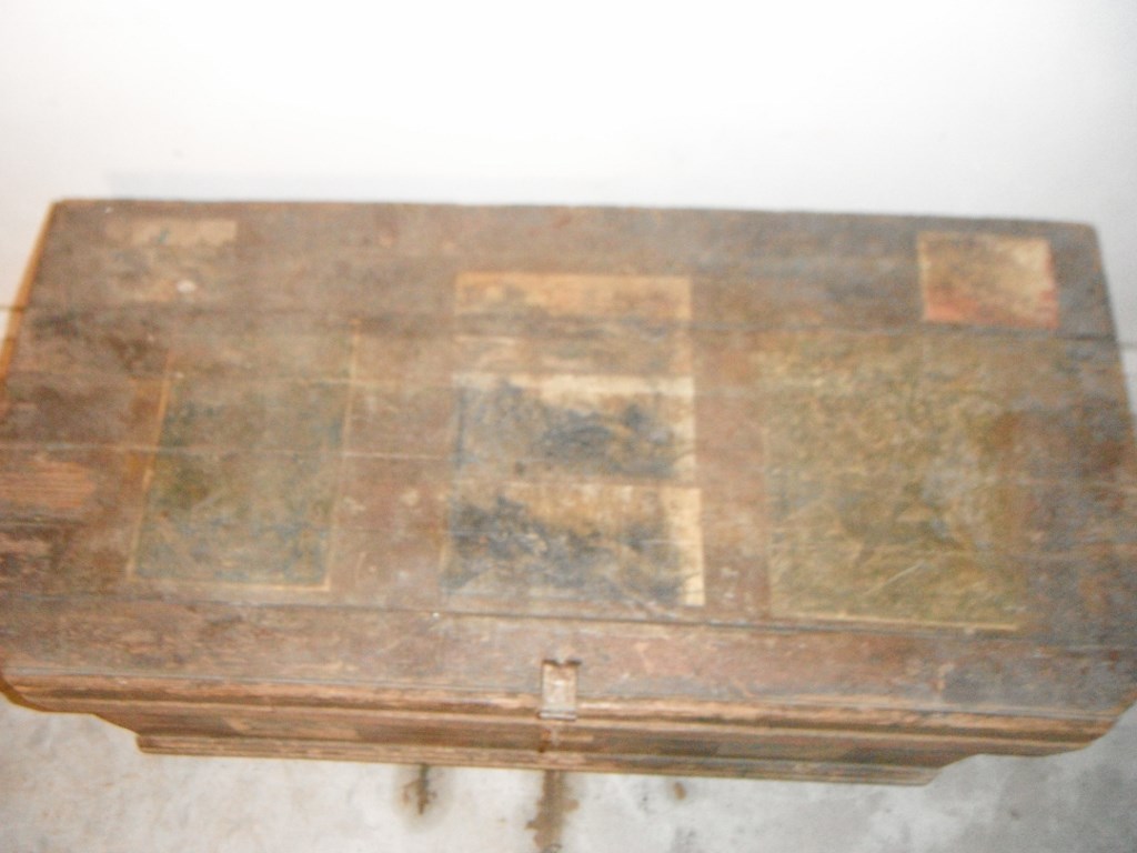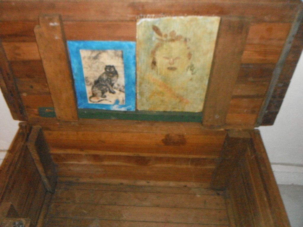 This old wooden chest was given to me by a friend. It's fairly heavy, and the wood is pretty worn. There are various strange pictures attached to it on the inside and out. There is one attached on the inside on the right that looks like it's affixed to maybe cardboard, and the picture itself has a face with a either a small rock or a shell for a nose. The material looks overall cracked, and it looks like there are leaves underneath as part of the design. The one on the left under the lid looks like a Chinese tiger, and the picture's on a fabric that looks hand painted. The pictures on top of the lid are extremely worn.
