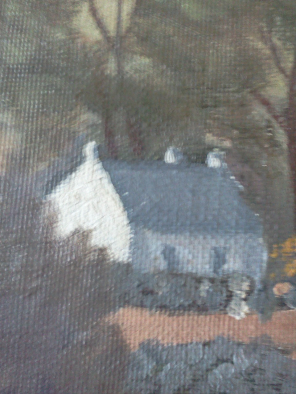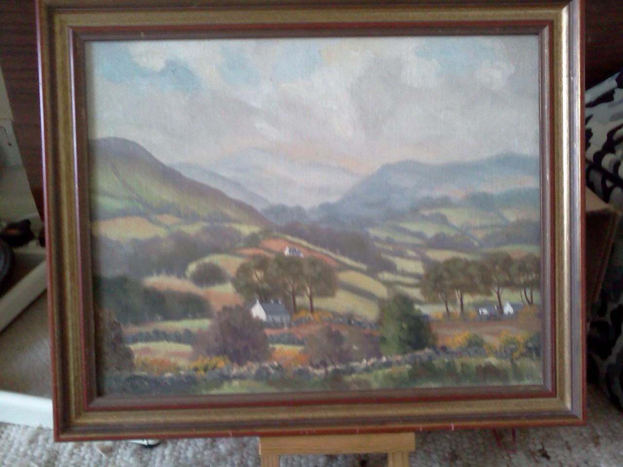 it is called cottages in the naurmes and has a provence from the william rodman gallery in belfast who stopped trading i think around the 1930's . it is an oil on board , a landscape , i dunno seems to have something about it ??? The painting is in fairly good condition , cant find the artist but can found the gallery who i believe only showed fairly good work?? however no records as no longer trade !! since then a mystery but has ended up in surrey england instead of ireland .