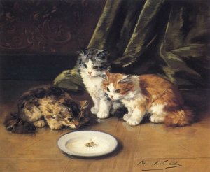 I have a friend that collect paintings and she told me that the painting is by Alfred Arthur Brunel de Neuville an artist from Paris (1851 - 1941)but she is not an appraiser and I am not sure. I reserched on the internet and found a very similar painting from him. The only diferent is that it is 17" by 21" and only it has three cats and my painting has four cats. I incuded a photo for comparison (#5). Thank you for any help.