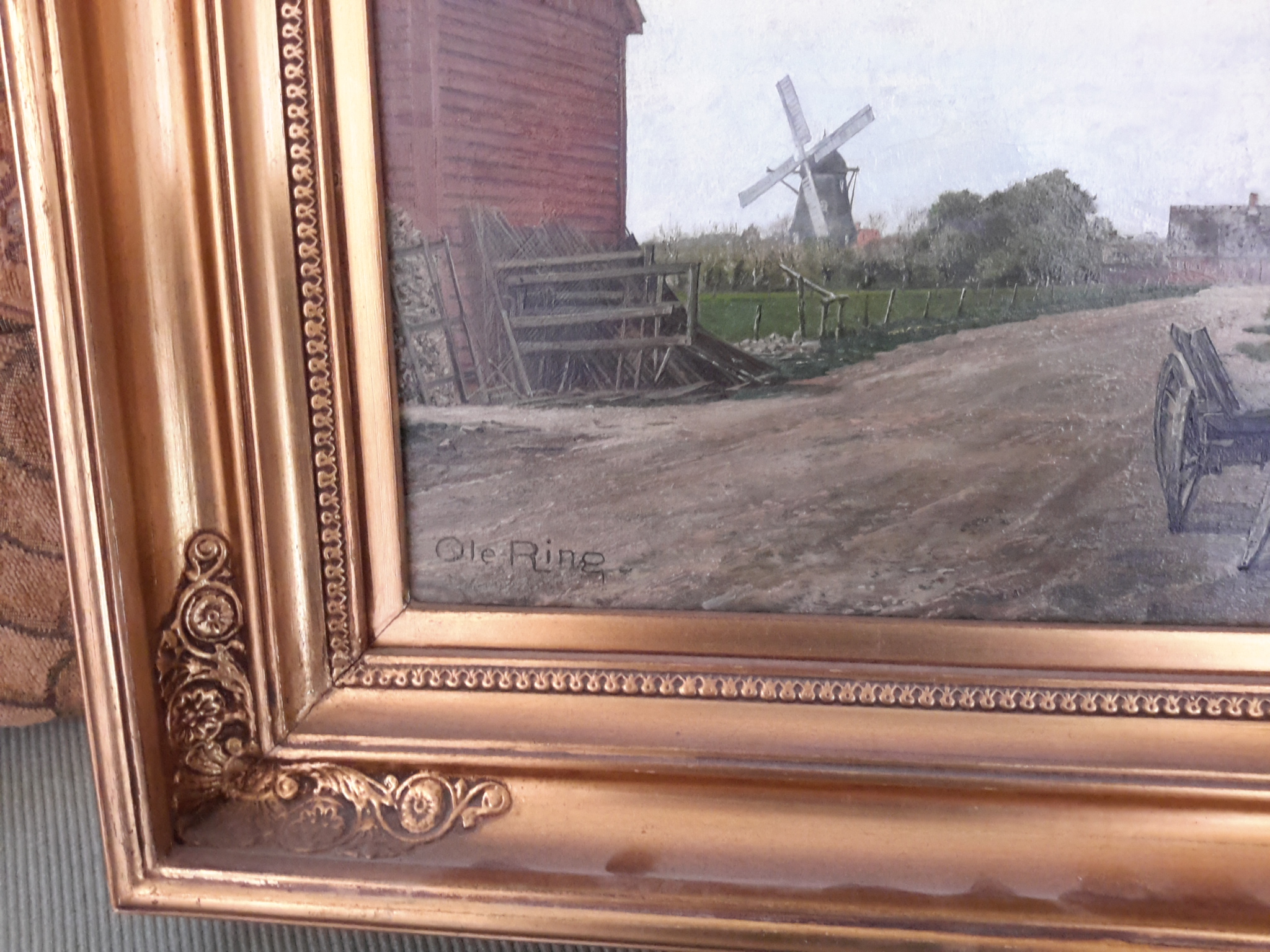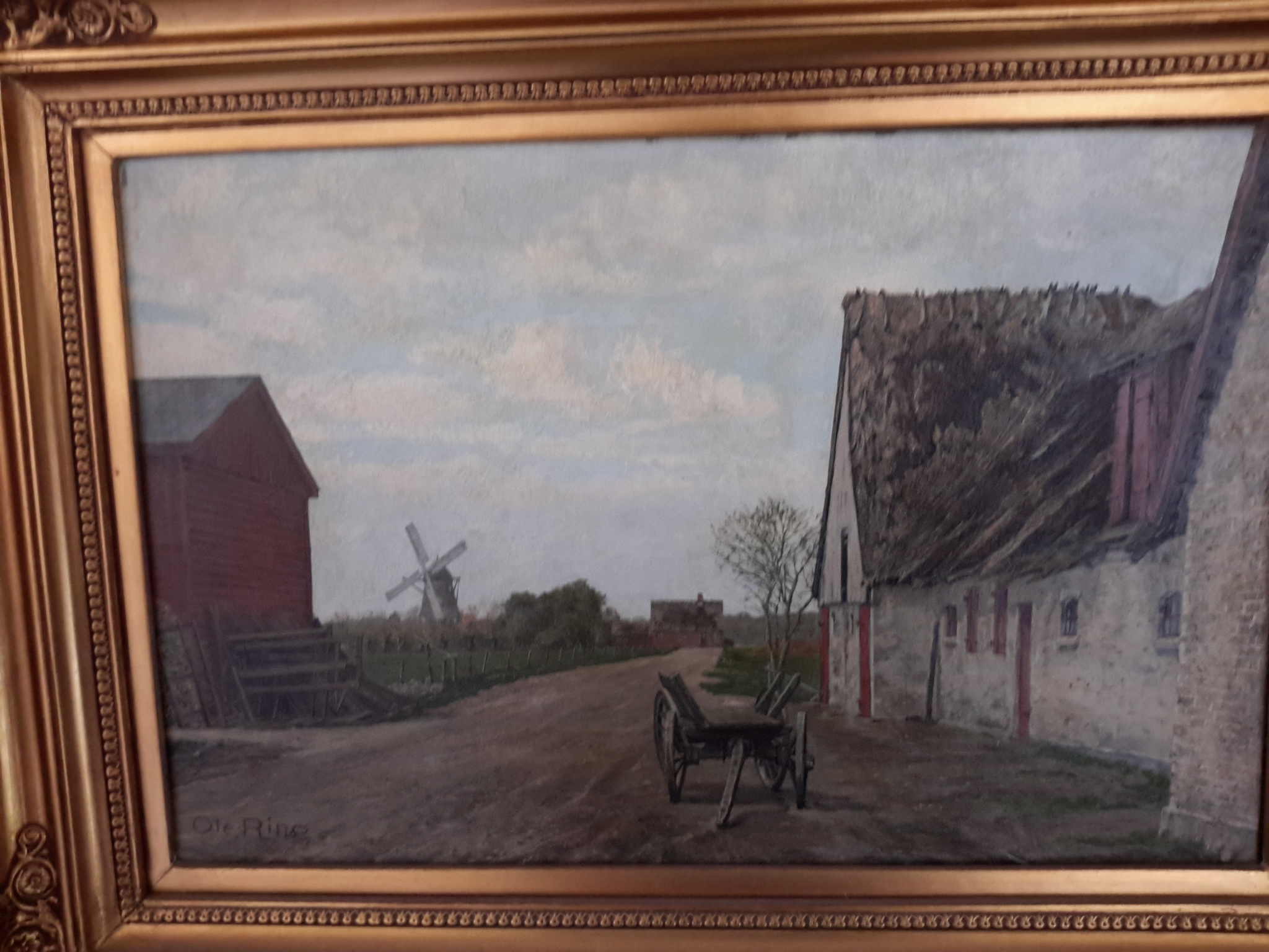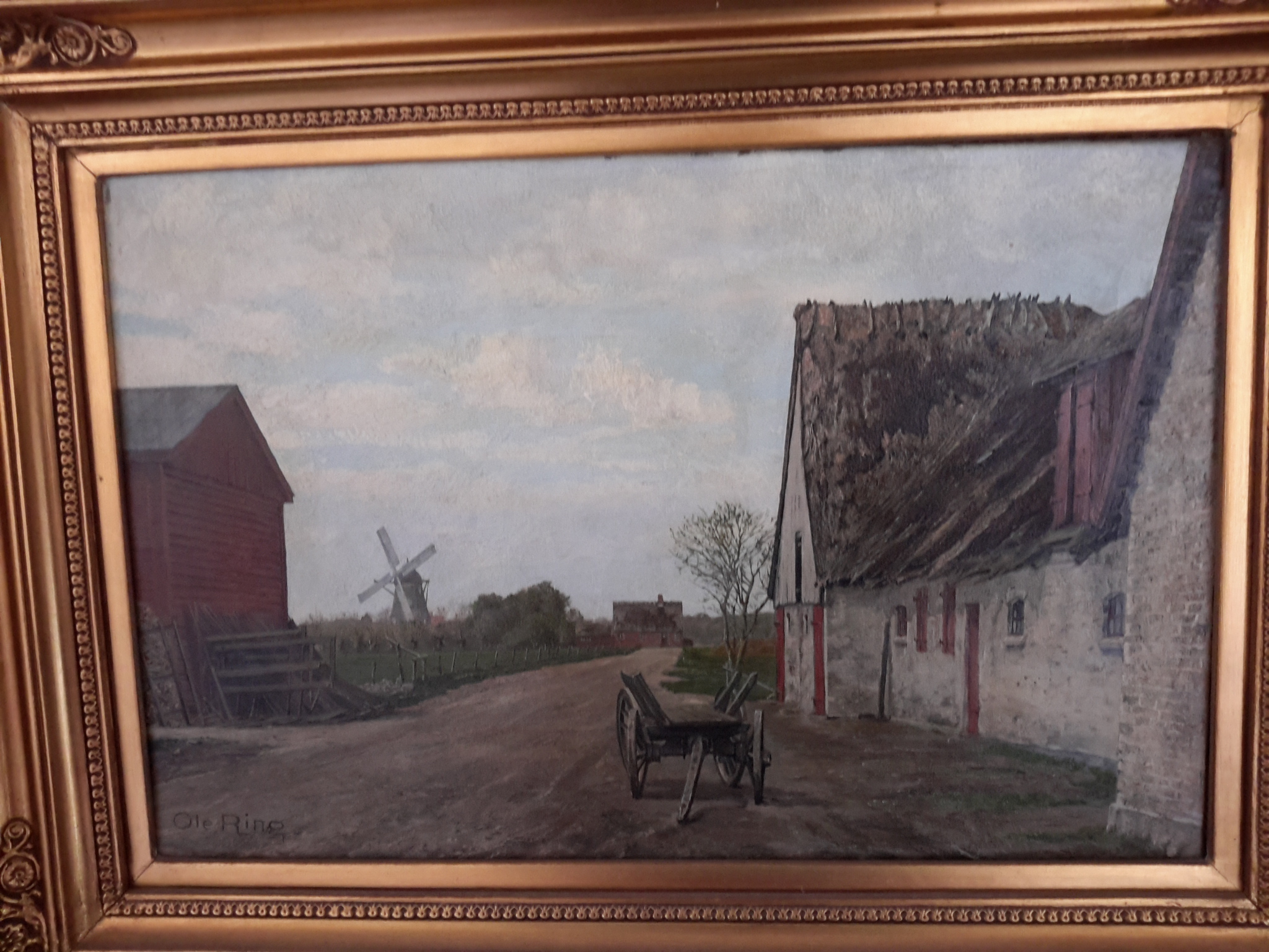Framed oil on canvas of village road with a cart. |Title of work unknown by danish artist Ole Ring. Purchased in 1954 at the Kunsthandel in Ostergade 4, Copenhagen Denmark. Signed by artist in lower left corner. Condition is excellent.