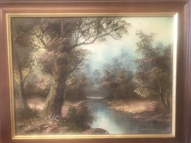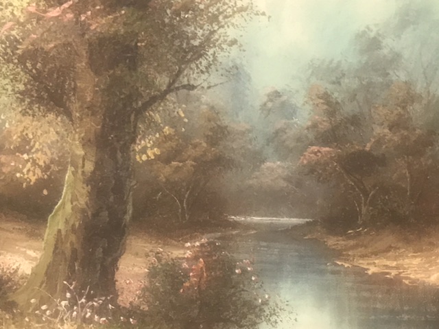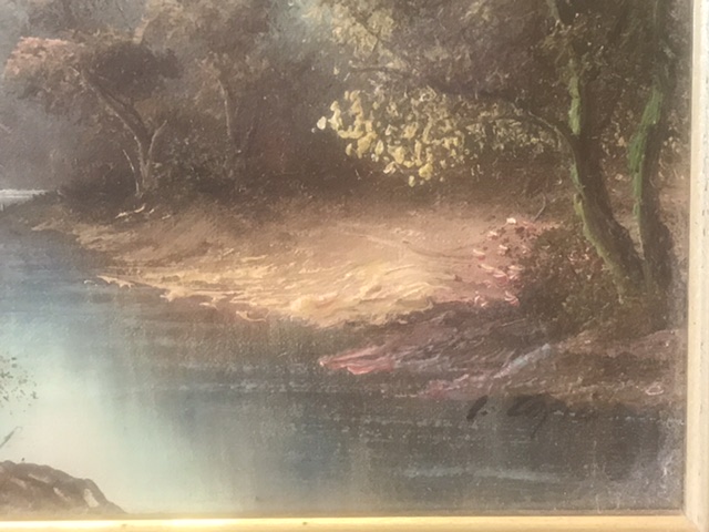 Woodland landscape scene with stream, oil painting framed with signature in bottom right corner of I.Cafieri