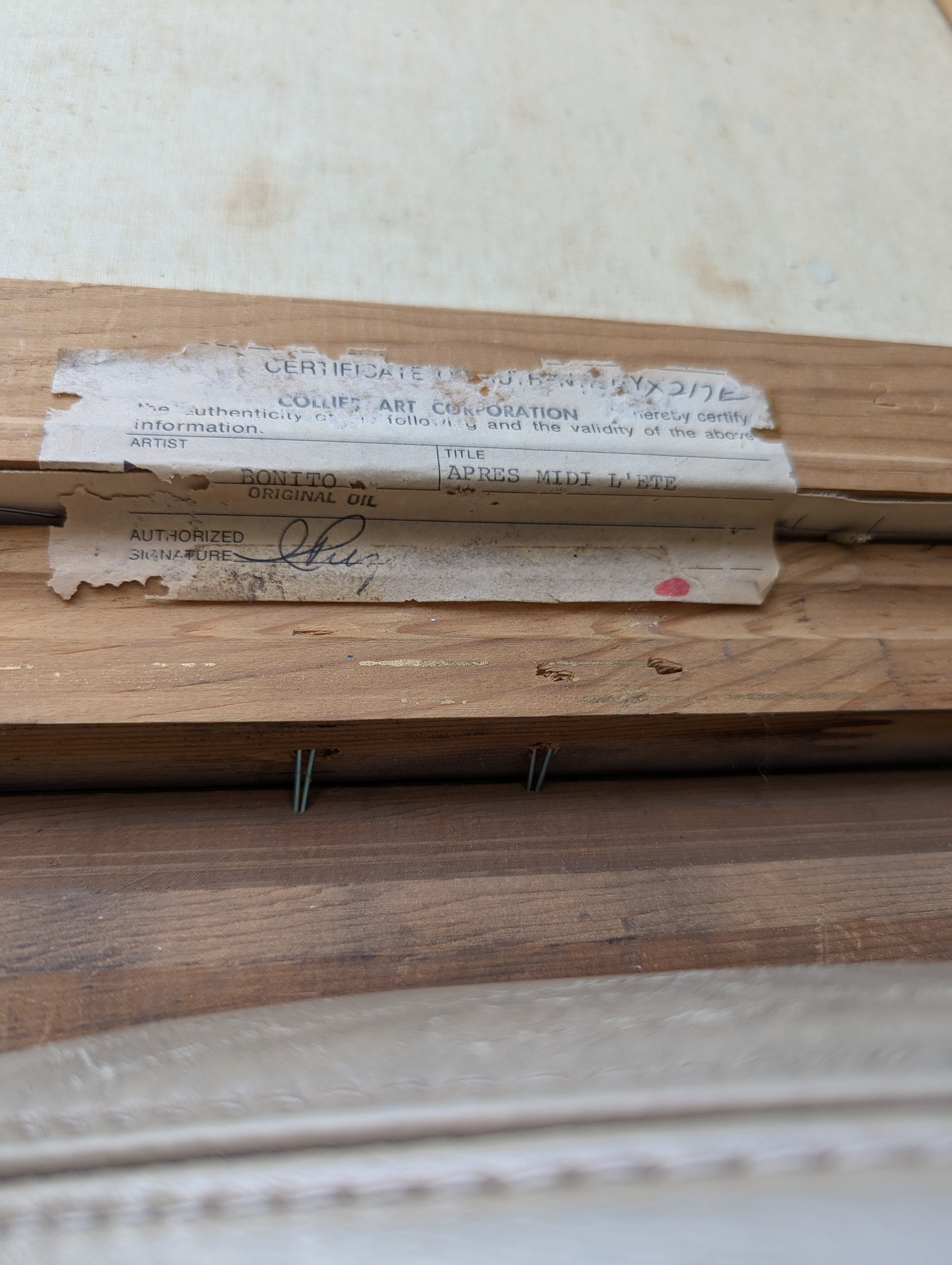 The attached certificate suggests this piece was created as part of a collection distributed or authenticated by Collier Art Corporation, a company known for distributing decorative art. While "Bonito" appears to be the artist's name, further research would be needed to verify their history or significance in the art world.