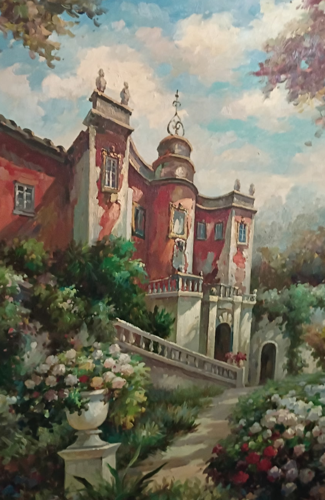 Collectors value oil paintings for their craftsmanship and the emotional resonance they can evoke. This piece, with its charming depiction of a garden and building, appeals to those interested in pastoral scenes and vintage aesthetics. The rarity of works by lesser-known artists can also attract collectors looking for unique pieces that stand out.