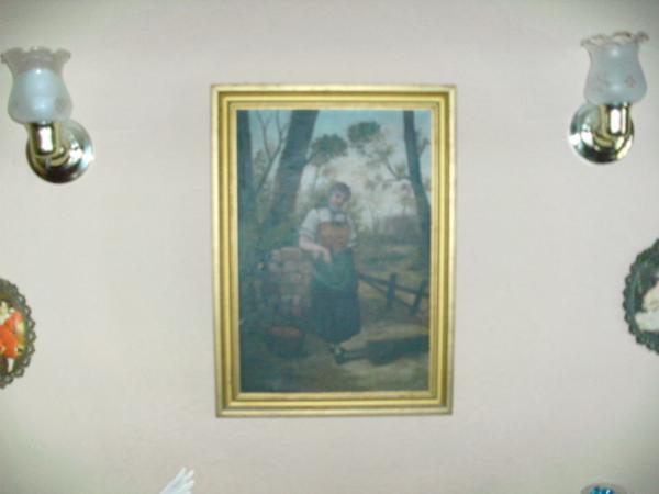 girl with short curly hair, resting her elbow on a brick wall. A basket or pot sits below the brick wall. There is a shawdow of the girl the shadow is not a full shadow, the upper portion of her body runs off the canvas.