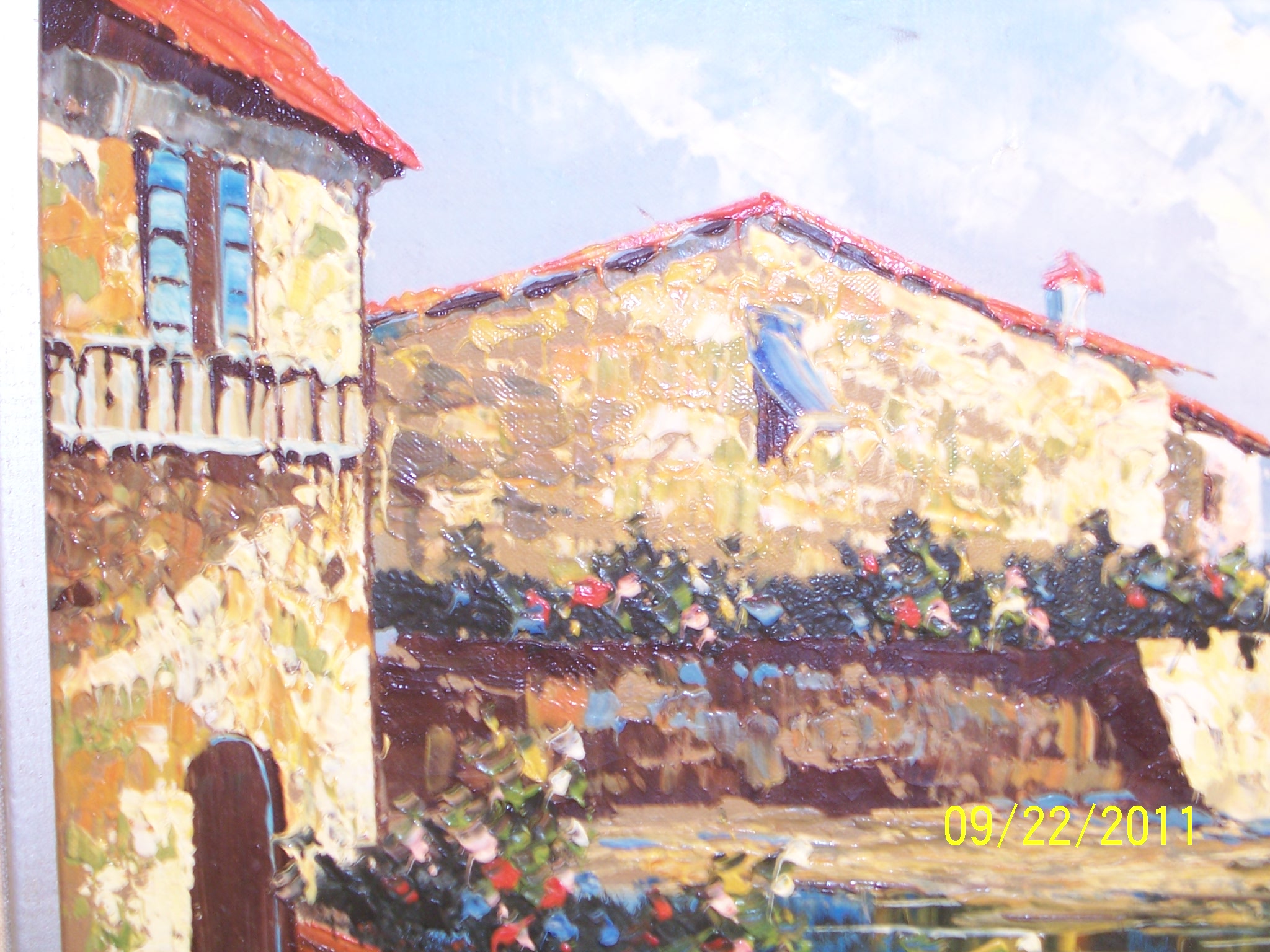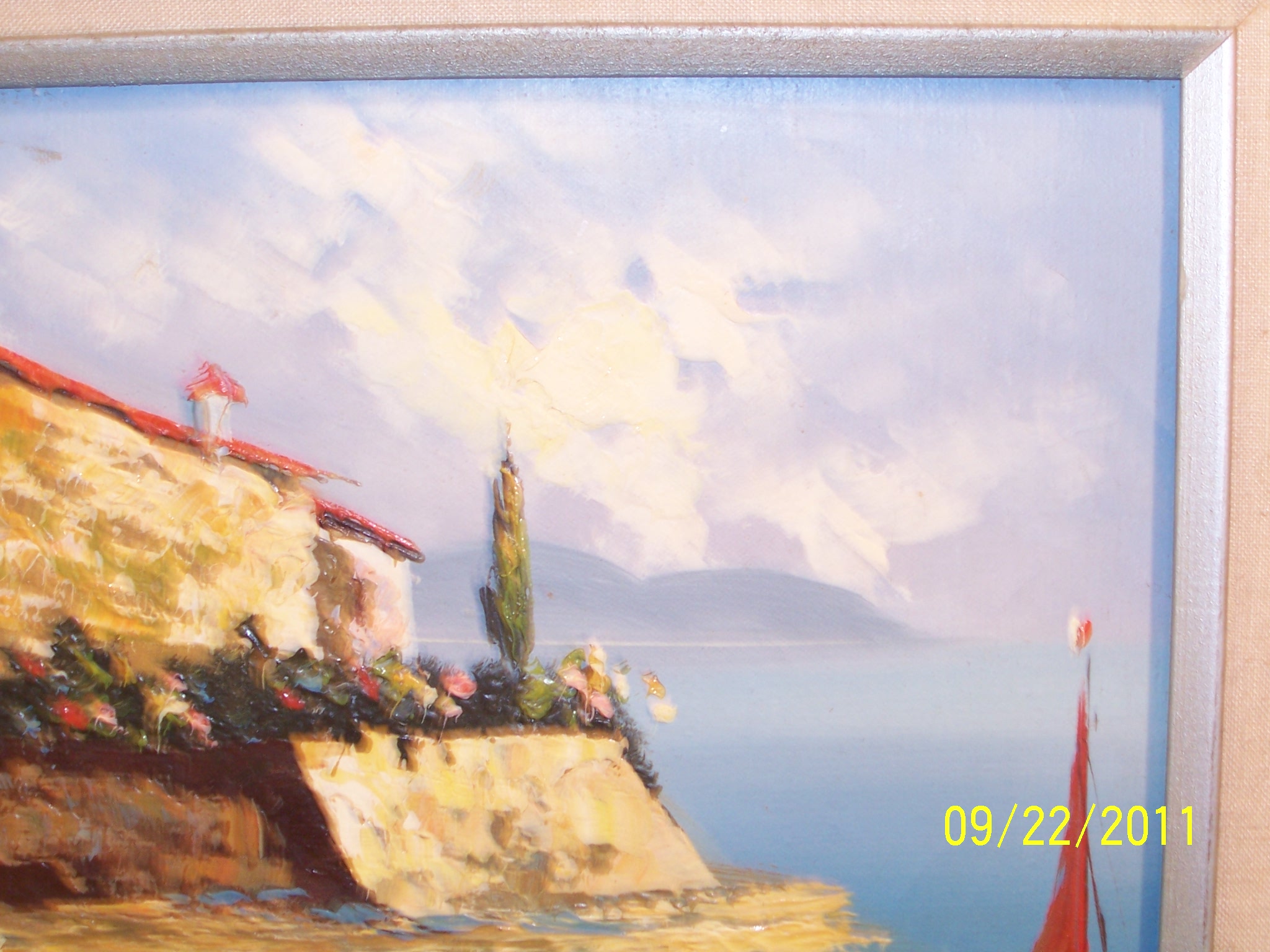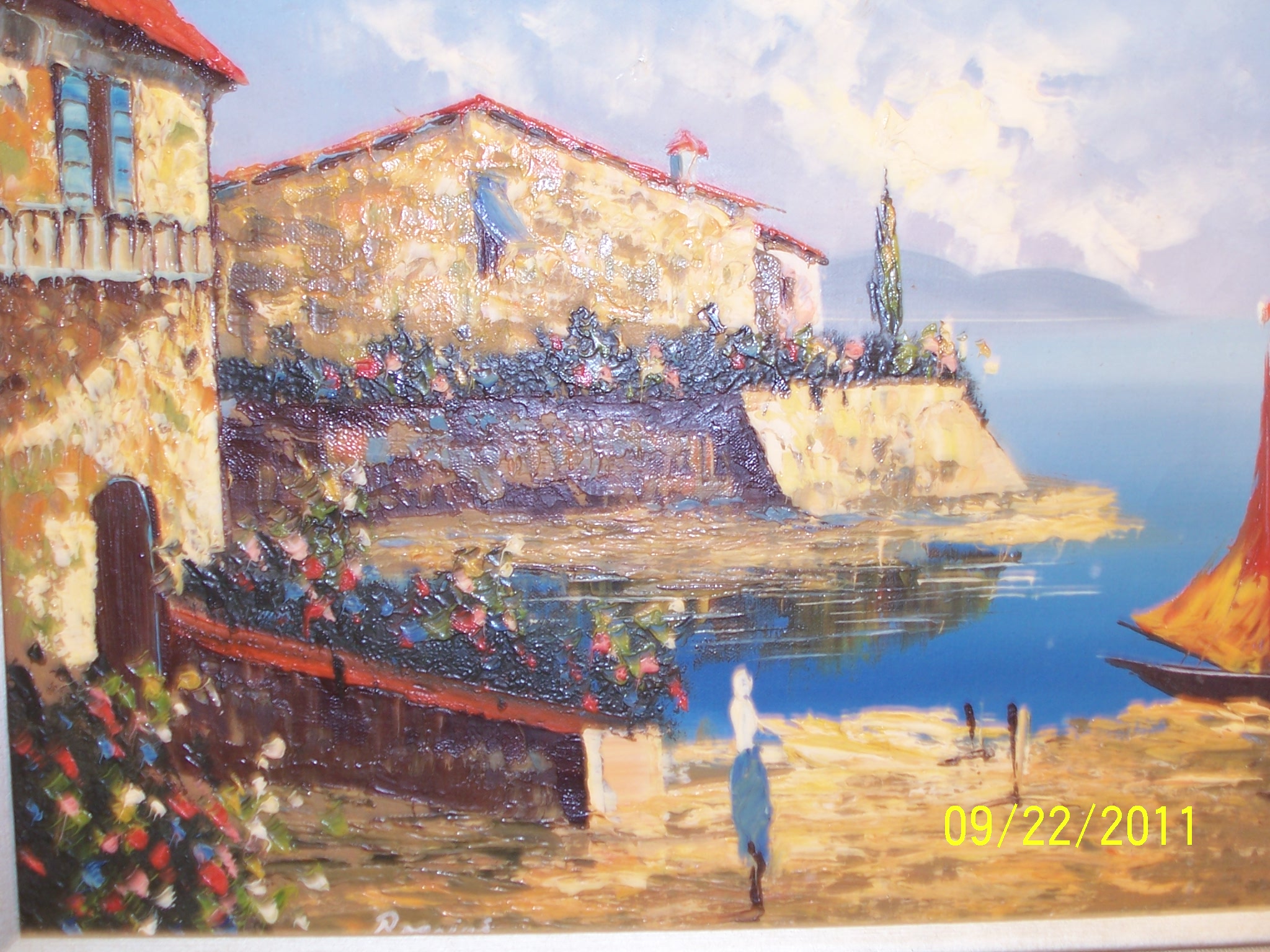 THERE IS A WOMAN STANDING IN FRONT OF THE WATER , AS WELL AS A SAILBOAT IN THE WATER SOMEWHAT IN THE DISTANCE, ALSO THERE ARE AT LEAST TWO BUILDINGS, ONE LOOKS AS IF IT IS A TWO STORY COTTAGE LIKE HOME AND I AM NOT QUITE SURE OF THE OTHER BUILDING, ALL IN ORIGINAL OIL ON ORIGINAL CANVAS. IT HAS BEEN FOUND IN THE ATTICK OF MY FAMILY AND HAS BEEN THERE FOR QUITE SOME TIME. THEY DID TRAVEL A LOT AND EVEN TO RUSSIA AND OTHER PLACES SUCH AS ITALY AND SPAIN.
