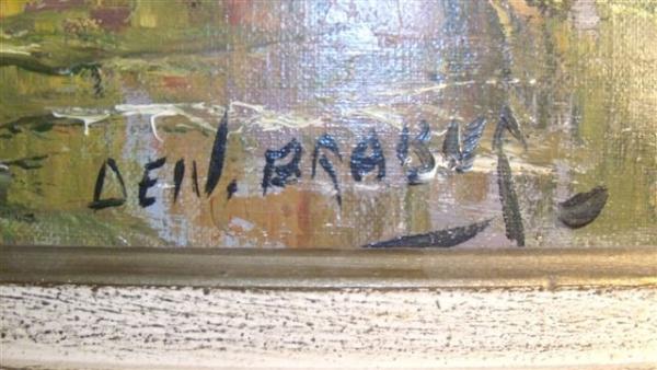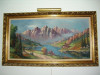 A 30 inch by 48 inch oil painting in very good condition of a landscape with a mix of