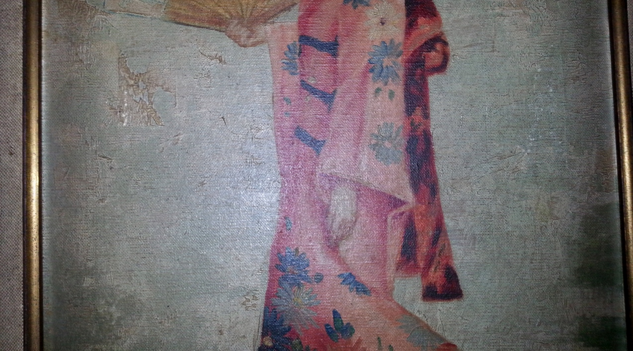 The painting looks like oil or acrylic and looks like it was kept in an attic for a long period. The attached photos make it look cleaner than it actually is. Looks as if it was near an oil furnace or coal. However, it should clean nicely.