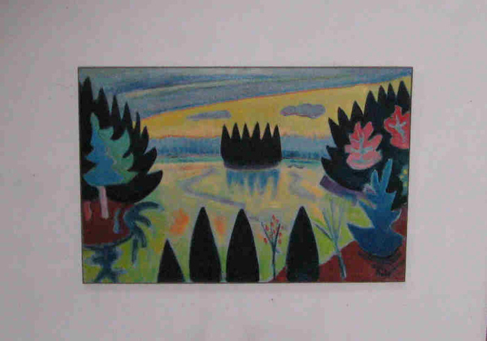 Large oil painting, titled Egypt Stream/Burying Island, by regional Maine painter Philip Barter, who has a bold, distinctive style.