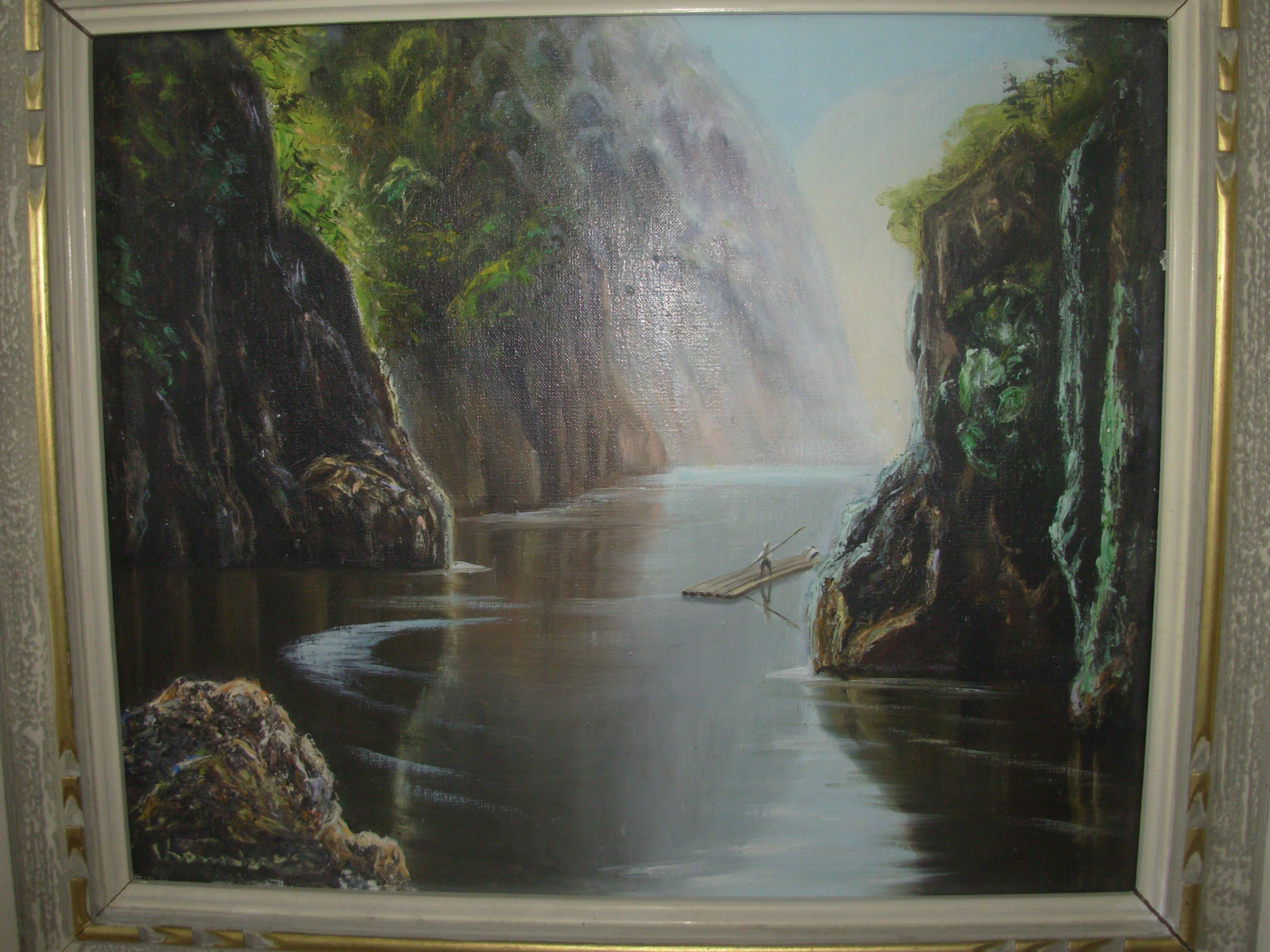 not sure if it is japanese or chinese but the paint is puffed up at the bottom of the pic where the rock is. i cant make out the signature or the stamp on the back of the frame. i have no idea how old it is either. all i know was my grandmother was from japan and was hers.