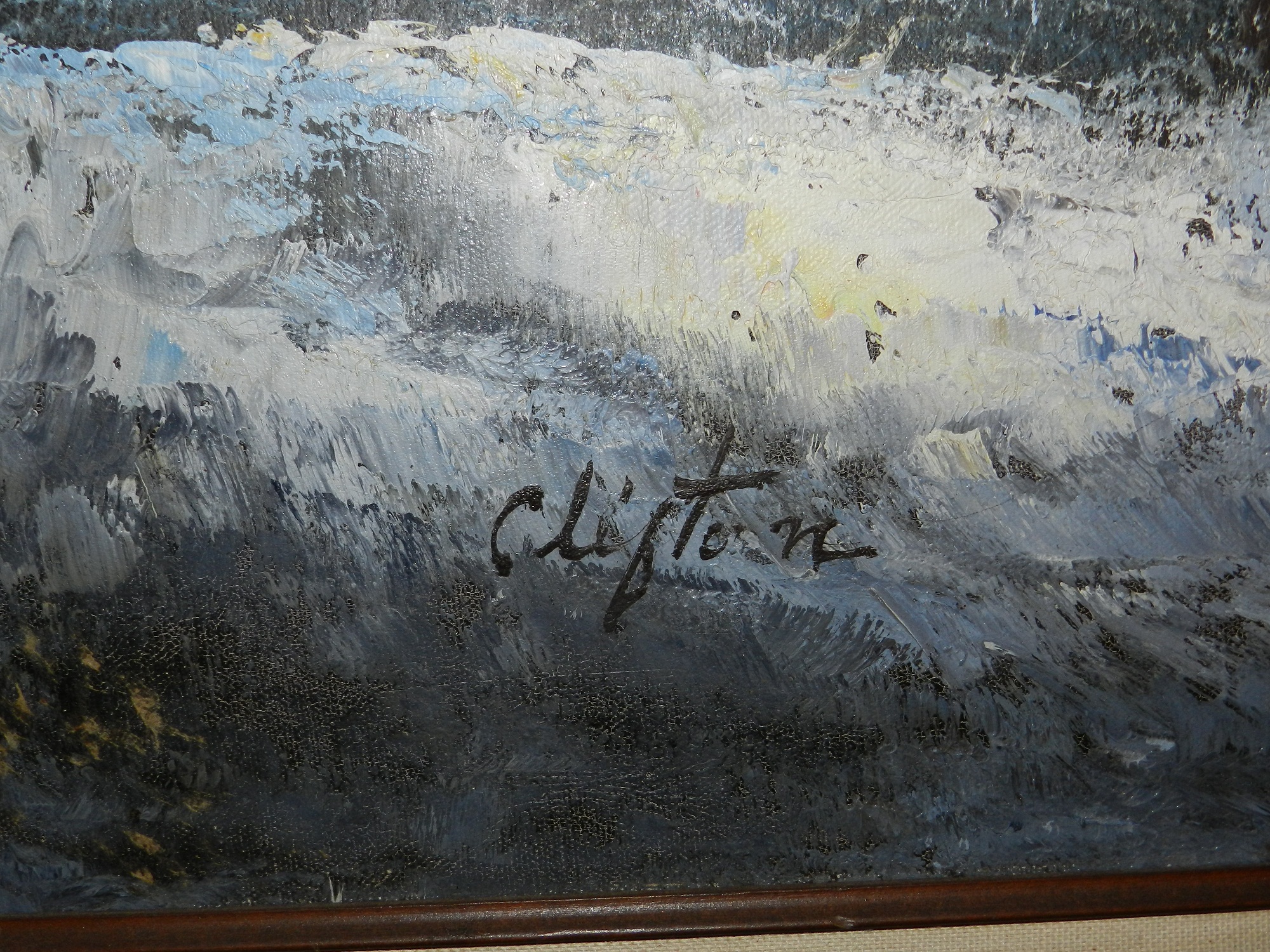 I bought this item from a woman who said it belonged to her aunt and she remembered it hanging in her aunt's home when she was a little girl. she is about 60 right now. The Painting is signed Clifton and appears oil based. It has a stain on the upper left side and it is on a wood frame. Don't know much about it so I would like to know if its worth anything. Thank You.