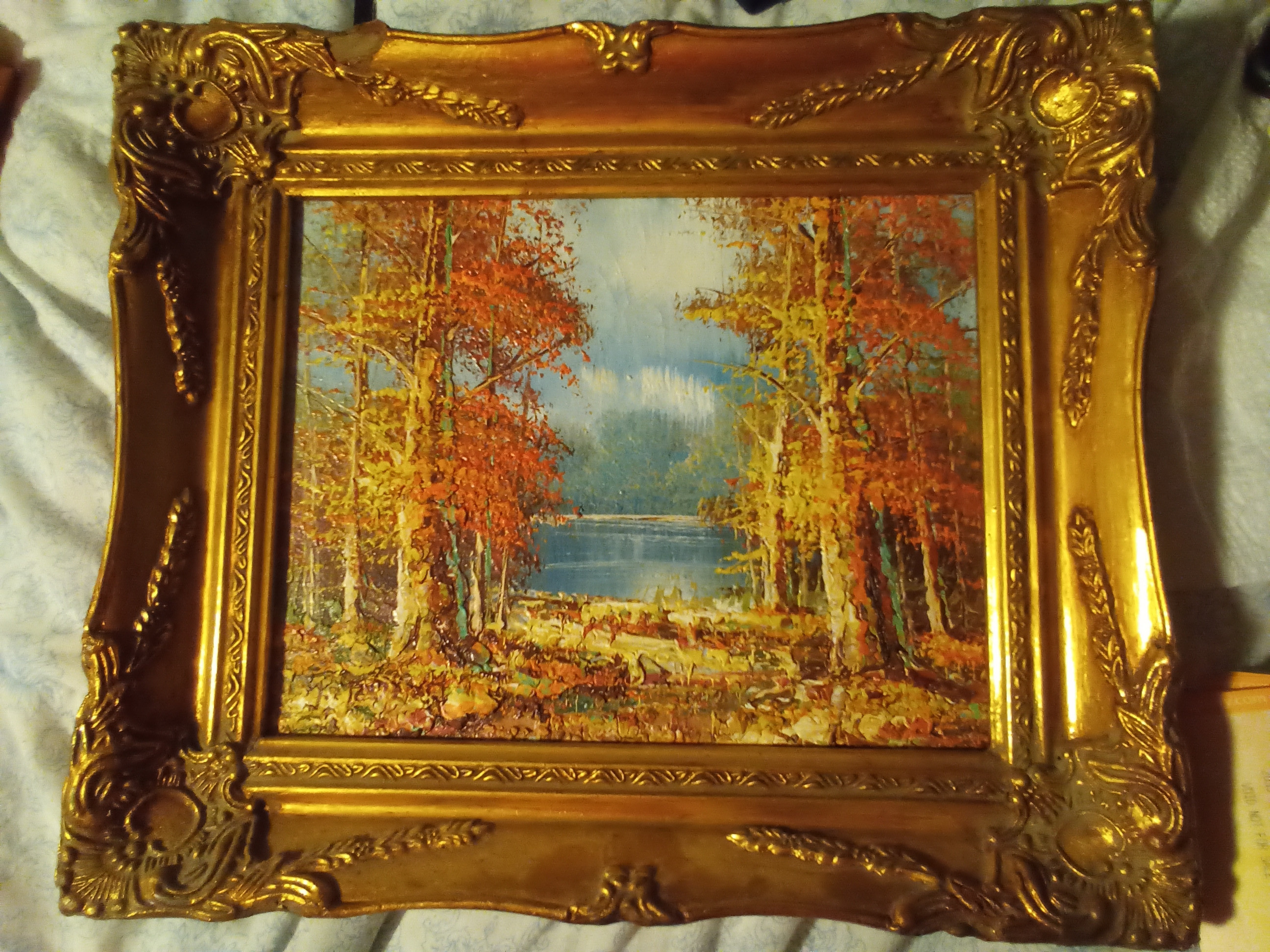 The collection consists of oil on canvas paintings, acquired at an estate sale for $125 each. The paintings are in excellent condition and feature serene landscapes and natural scenes, with ornate frames that enhance their decorative appeal. Notably, one of the paintings bears the inscription "Petersen Gold Medal Bradshaw 4/20/81", while another is marked "STYLE 689 RP, Size 8 x 10, MADE IN MALAYSIA". These inscriptions provide important clues about their origins and context.