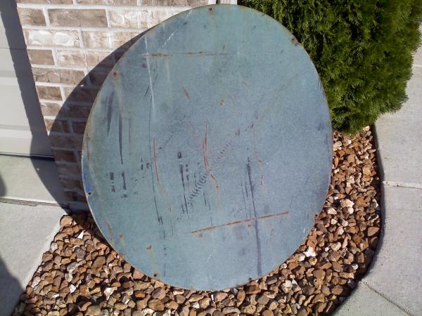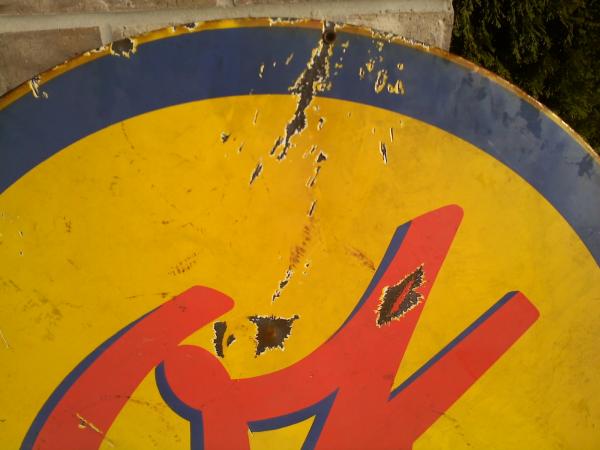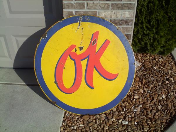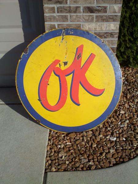 Sign has some rust on it but still in good shape for how old it is. It is made out of metal and is 36" in diameter.