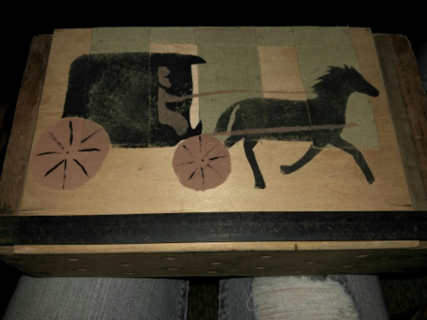 There are two boxes one has a civil war doll that's made out of a handkerchief explaining how they used to make them when resources were low and another box that has a horse and buggy on it and also wolf statue will attach picture