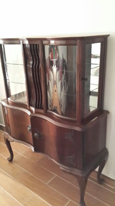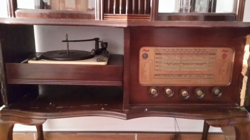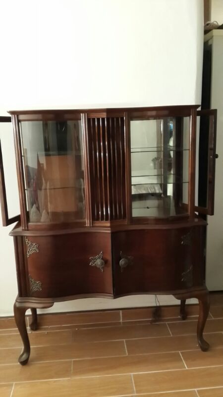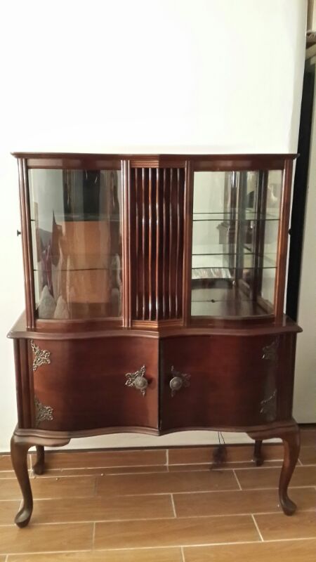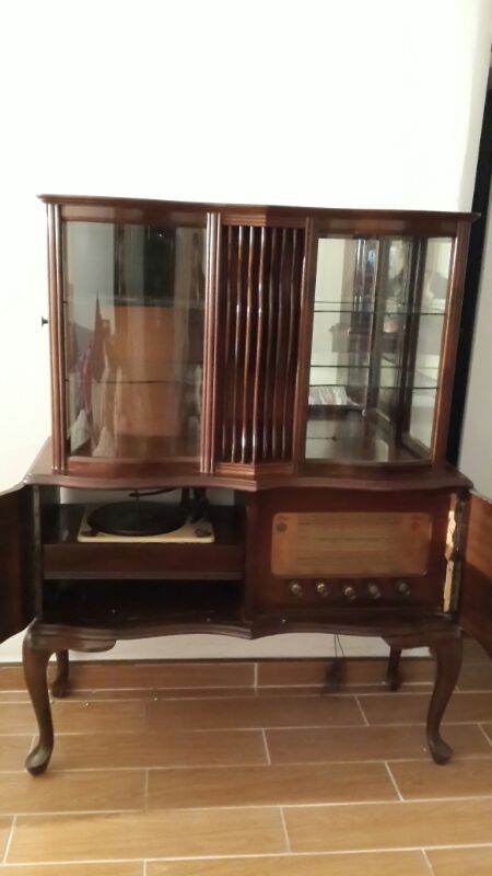 Been in the family for only 10 years, vintage look with curved legs, unscracthed glass and 2 doors that open to reveal an old school radio and turntable.