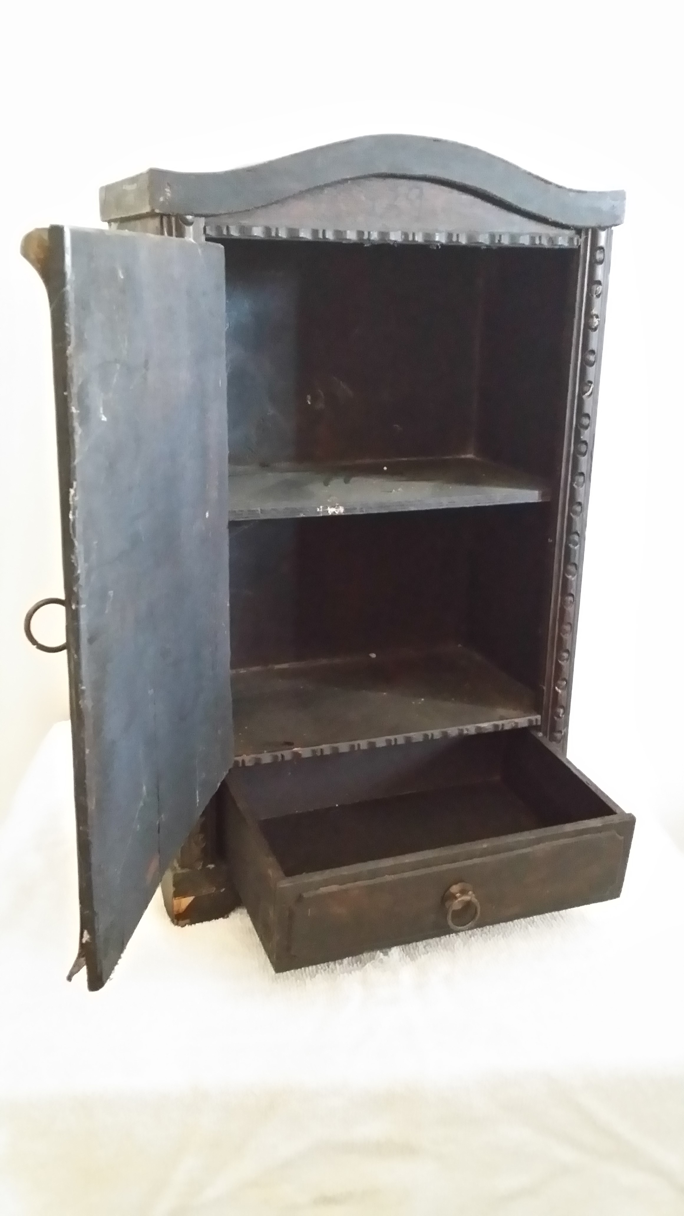 I just bought this little cabinet at a yard sale this morning. It is definitely old but I have no clue how to determining the age or what it's for. I just liked it so I bought it. My first guess is that it's some kind of medicine cabinet. The dimensions are 19 1/2" high x 12" wide x 7" deep. The finish is really dark, almost black. The front door has a thin brass face over top of the wood door; it cover the entire front of the door. The brass has a couple of embossed cherubs. Hoping someone out there can tell me what I have.