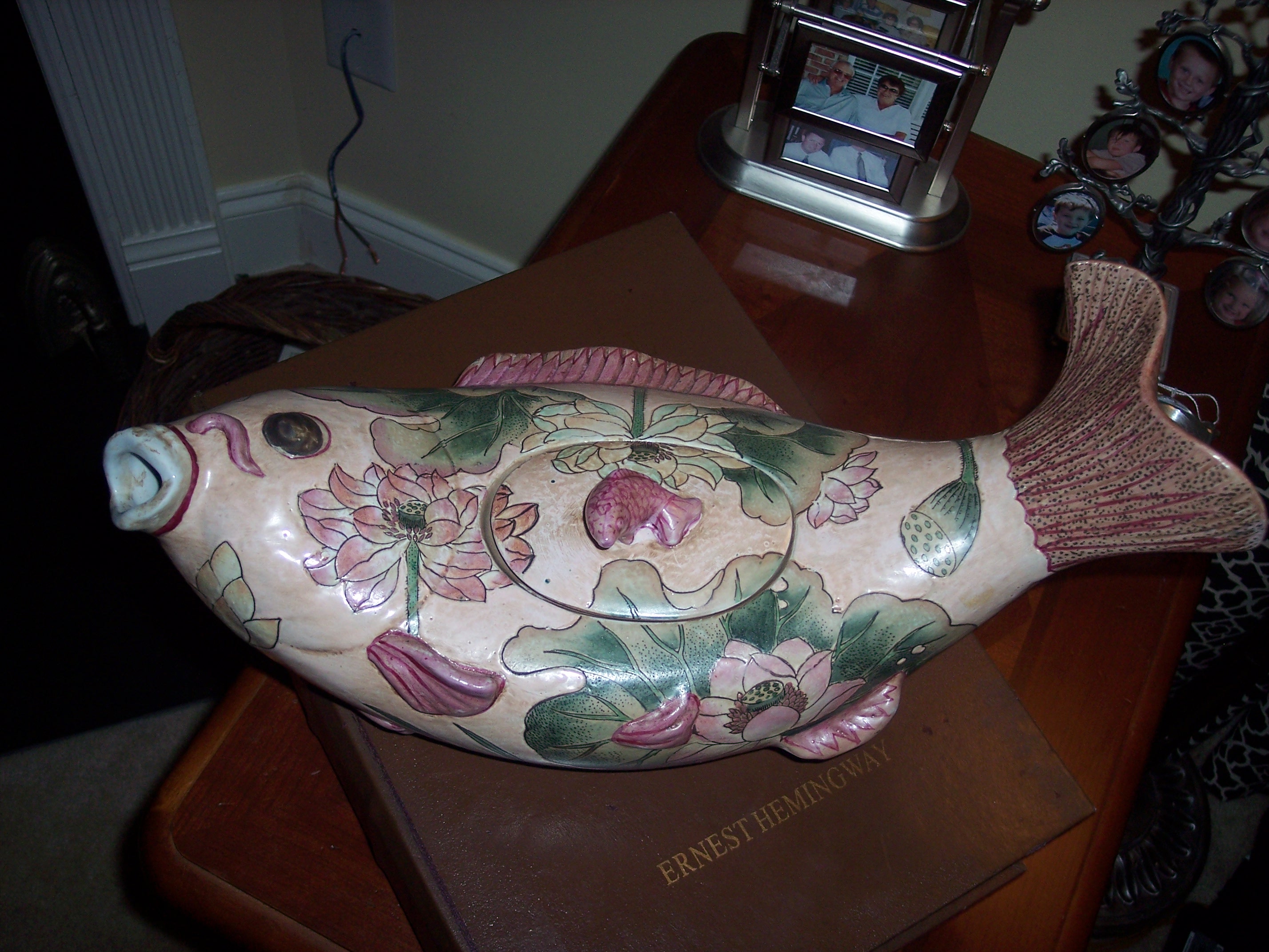 Hi, Just purchased this unusual Chinese fish.  It has a cover on top and his mouth is a spout.  It is 16" long.  Any info on the mark on the bottom as to age and value would be appreciated.  Thank you so much!