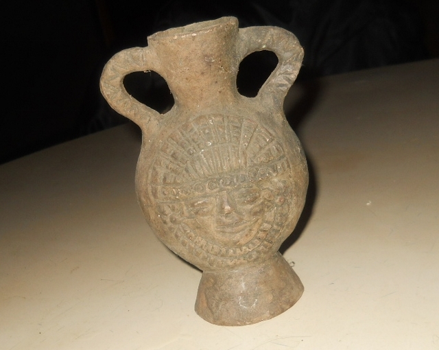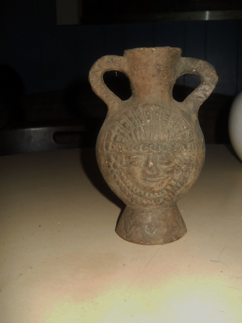 LOOKS HANDMADE .VASE WITH WHAT LOOKS MAYAN LIKE SUN GOD DESIGN MADE INTO IT.FOUND IN THE GROUND WHILE I WAS DIGGING. VERY LIGHT IN WT. FEELS LIKE GLASS CLAY OF SORT. ITS UP FOR GRABS IF SOMEONE IS INTERESTED IN IT. PLEASE CONTACT ME. MAYBE TERRACOTTA POTTERY. NOT SURE.