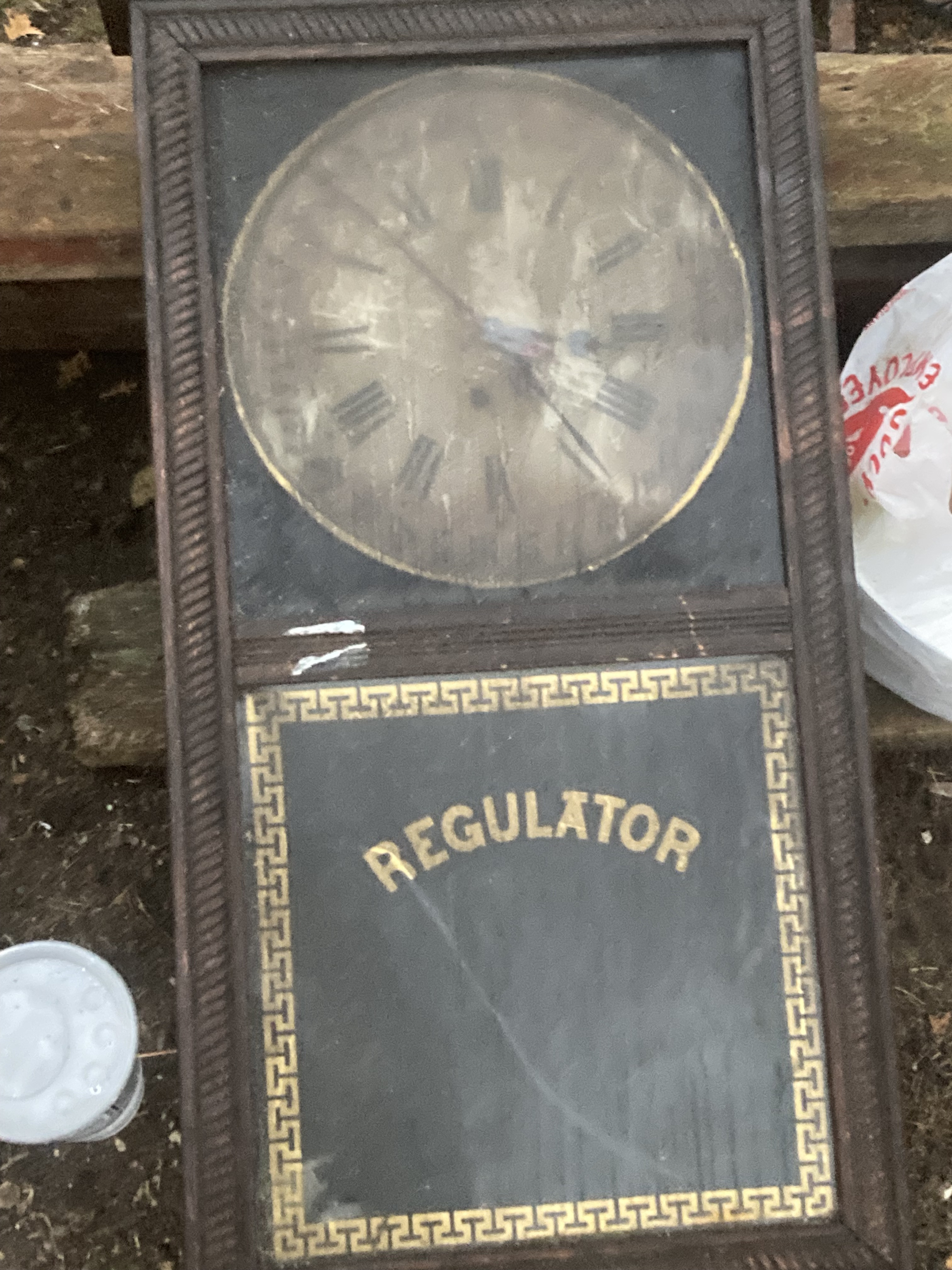 Old regulator clock, dirty but no breaks, has old price tag of $225 but that was long ago