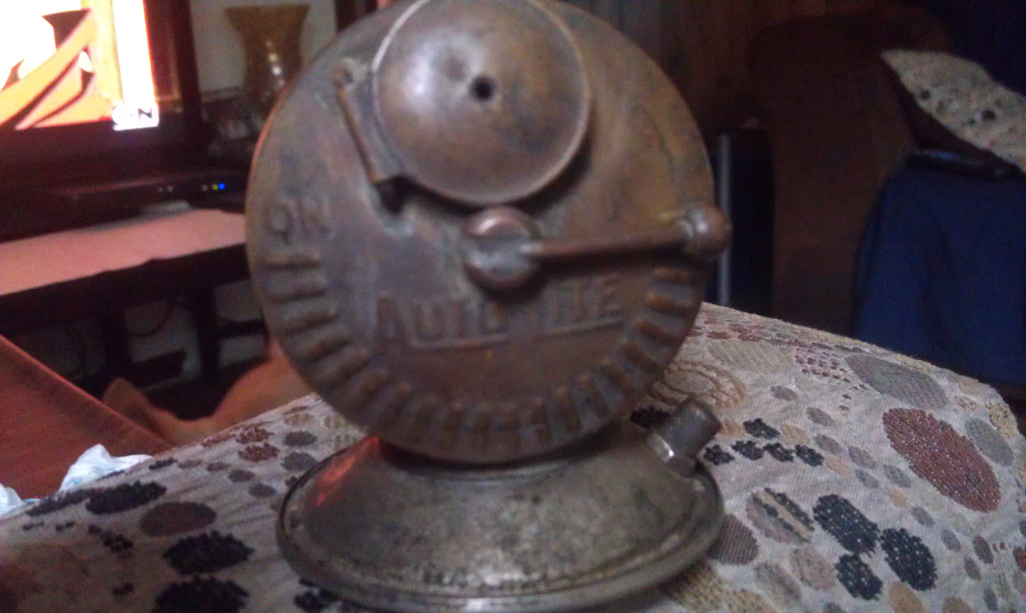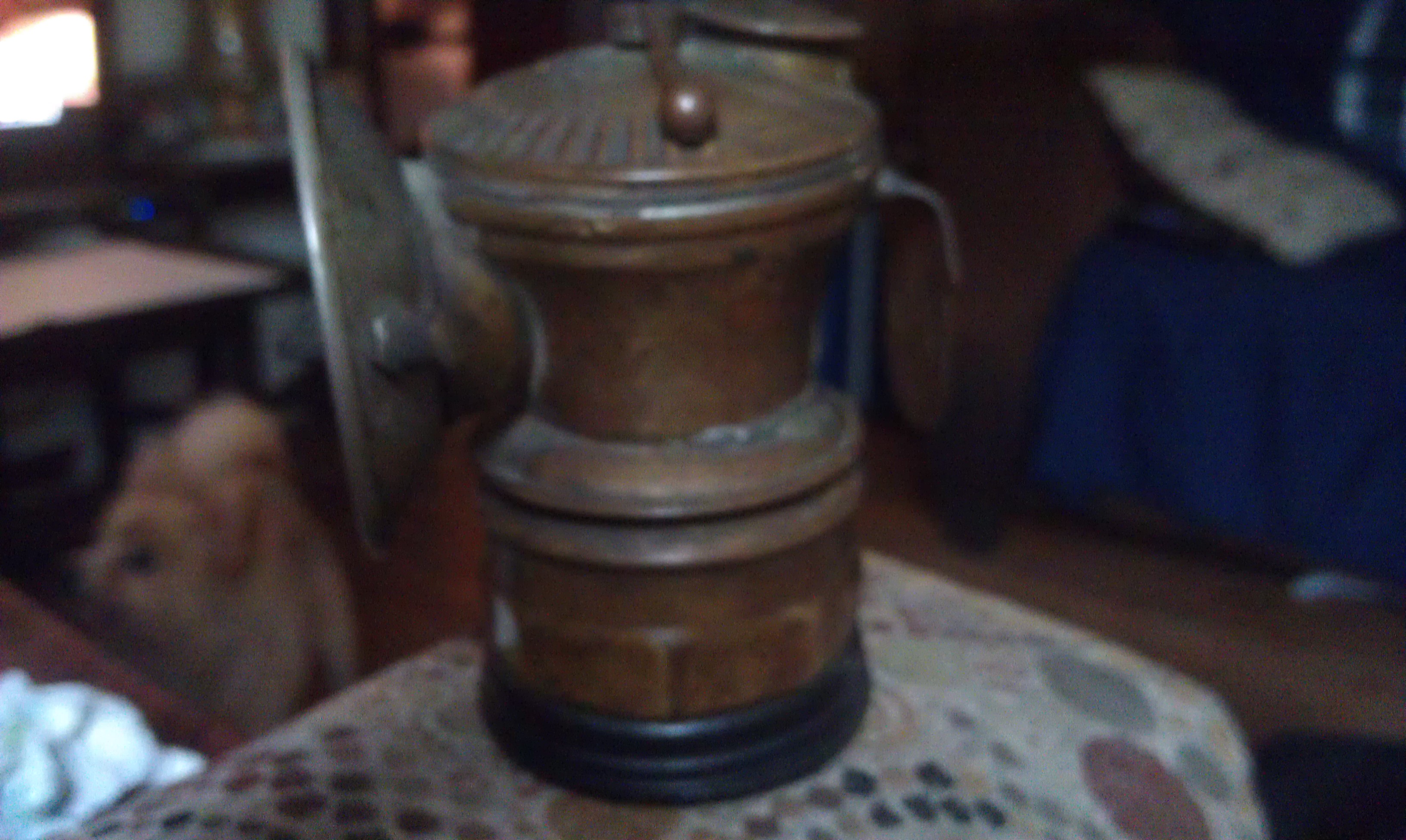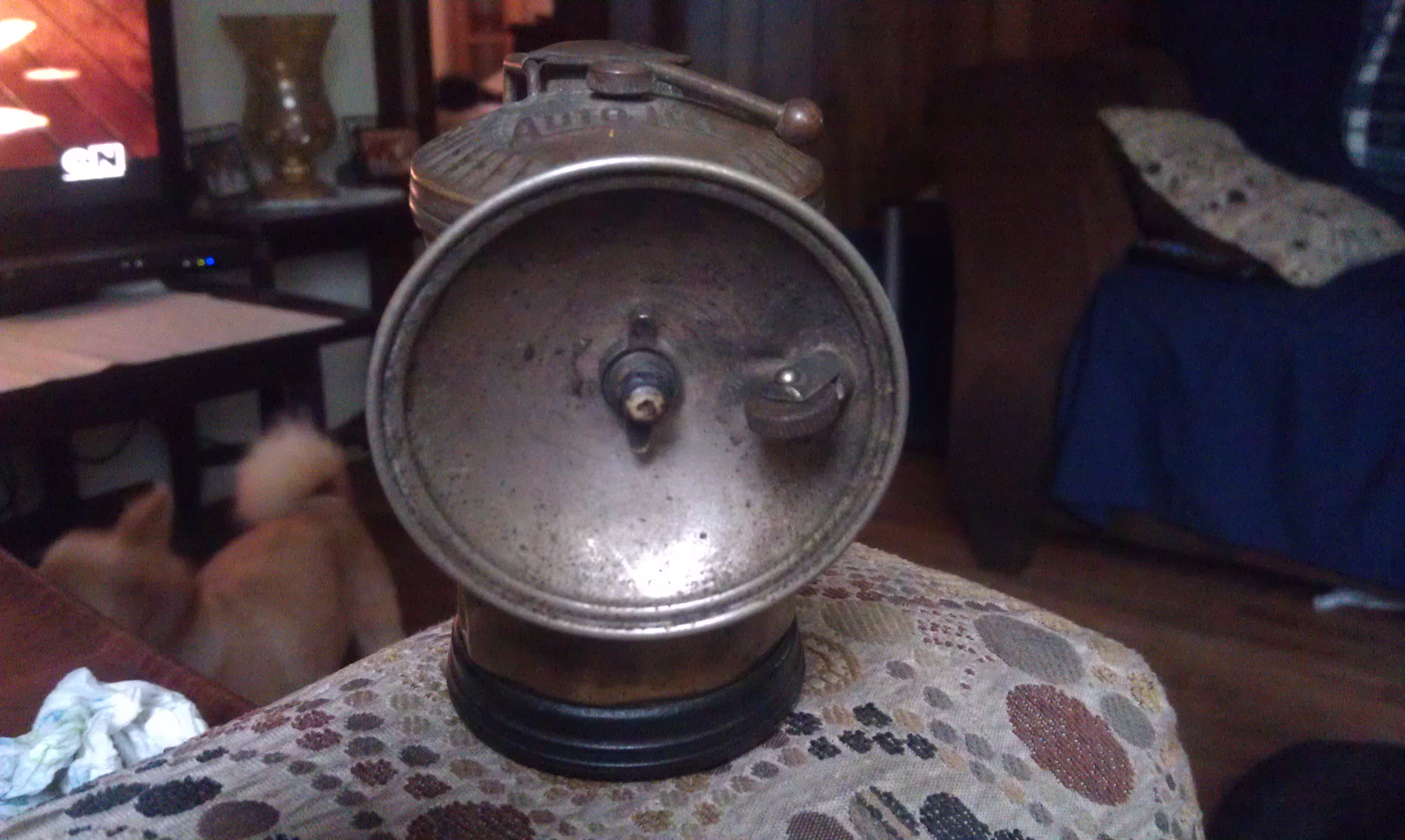 Flint ignited coal miners helmet light with white powder. Not sure of age nor value.