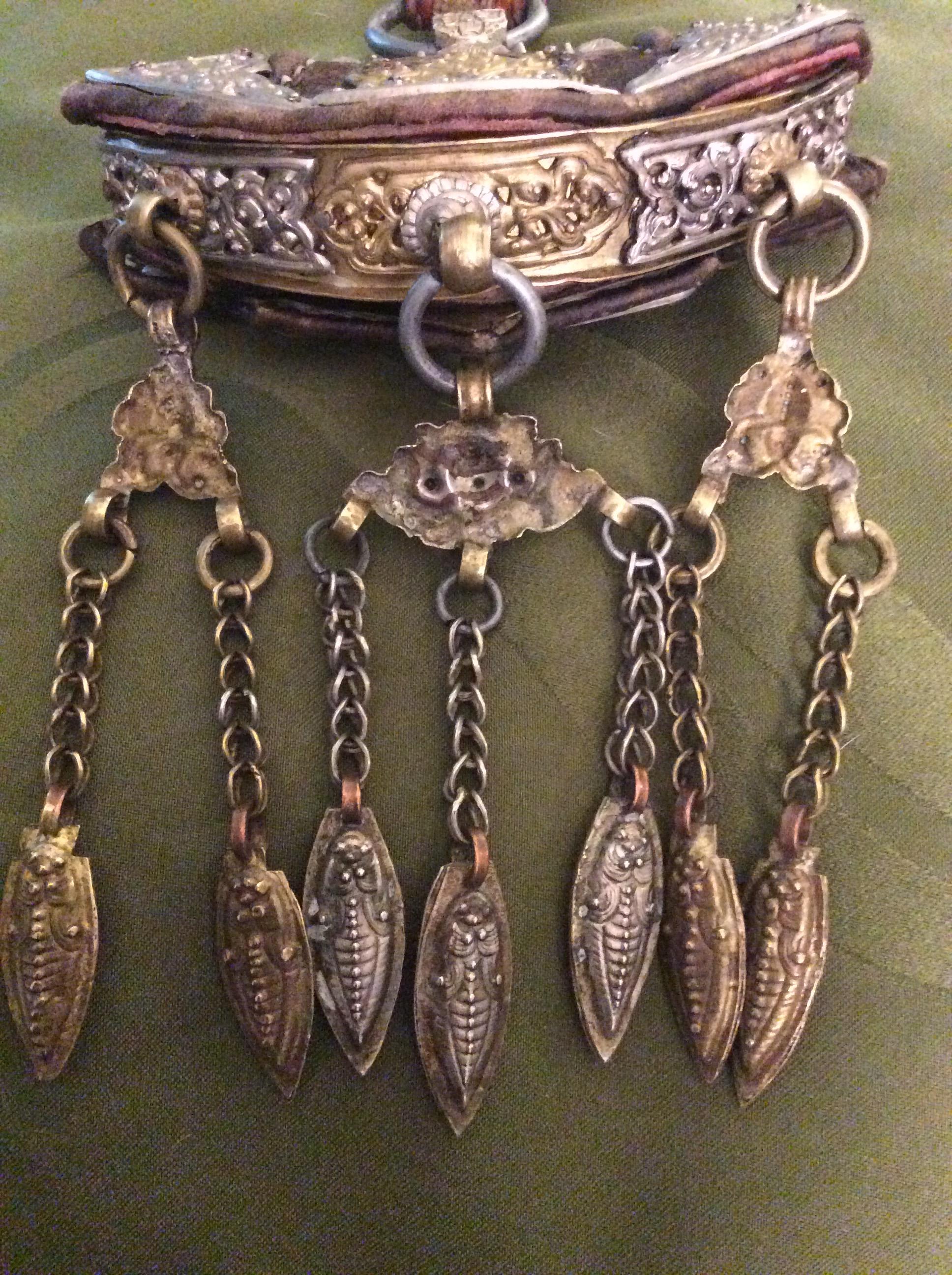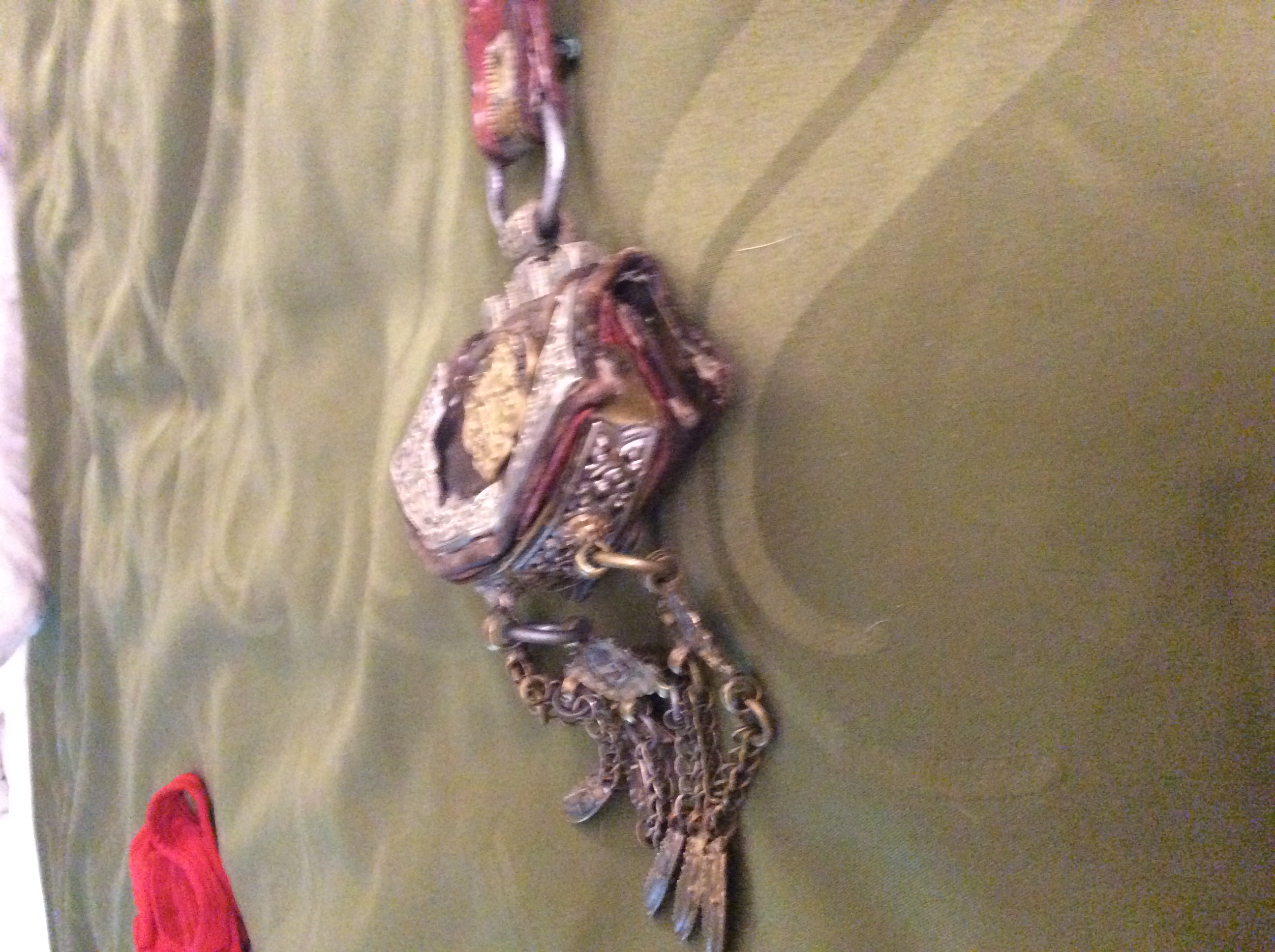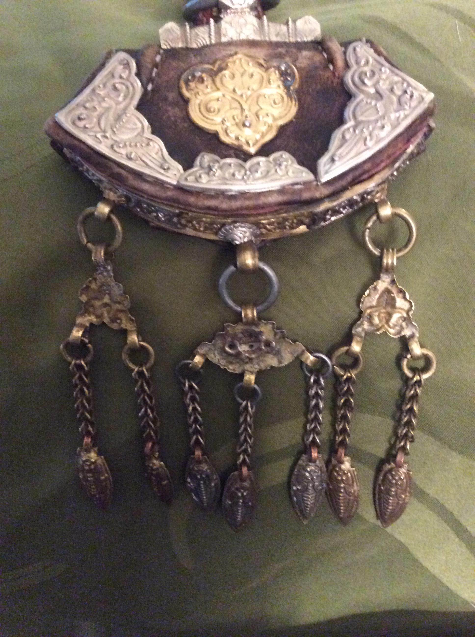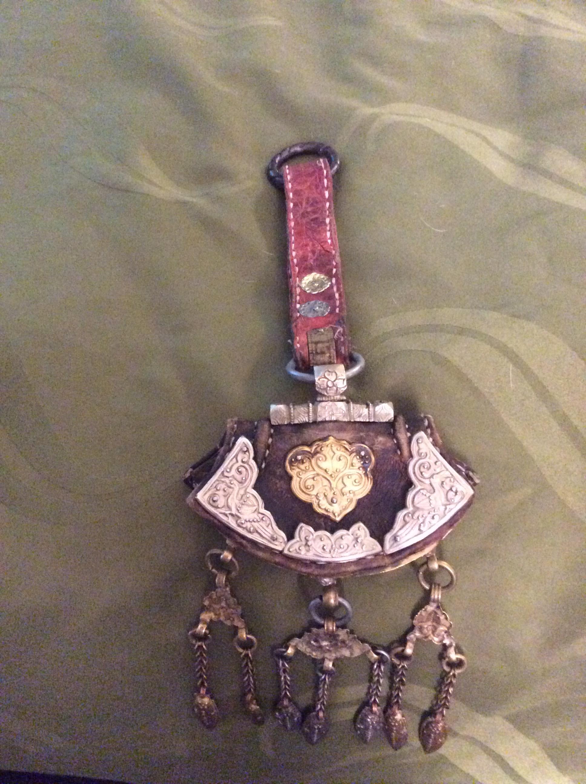 Very old metal and leather coin pouch, metal appears gold and silver, but may be brass and silver. Leather appears very old, but still strong and not bad looking. Turquoise stones on front of pouch and strap. Hand made without question, but that is about  all I can say for sure.