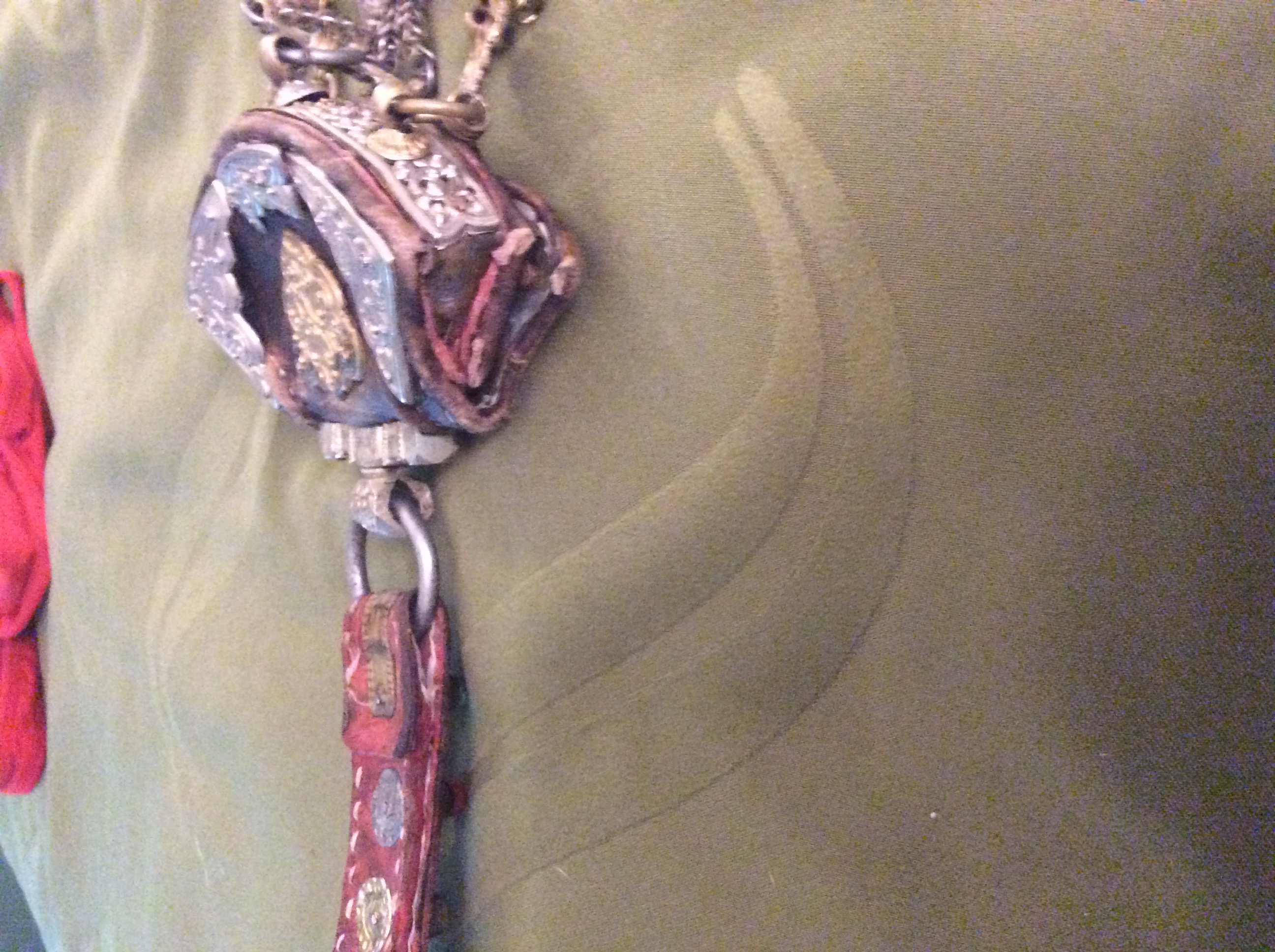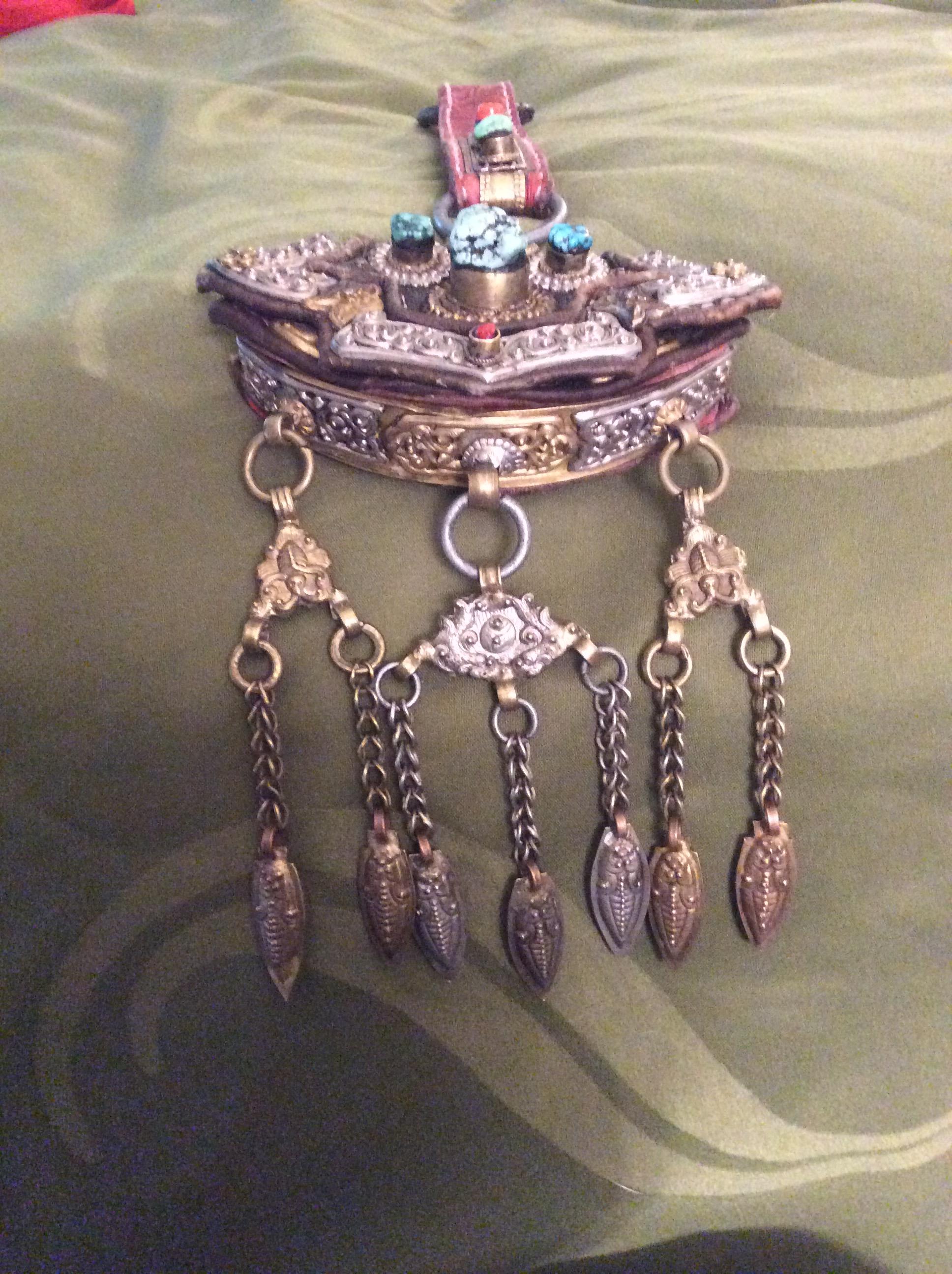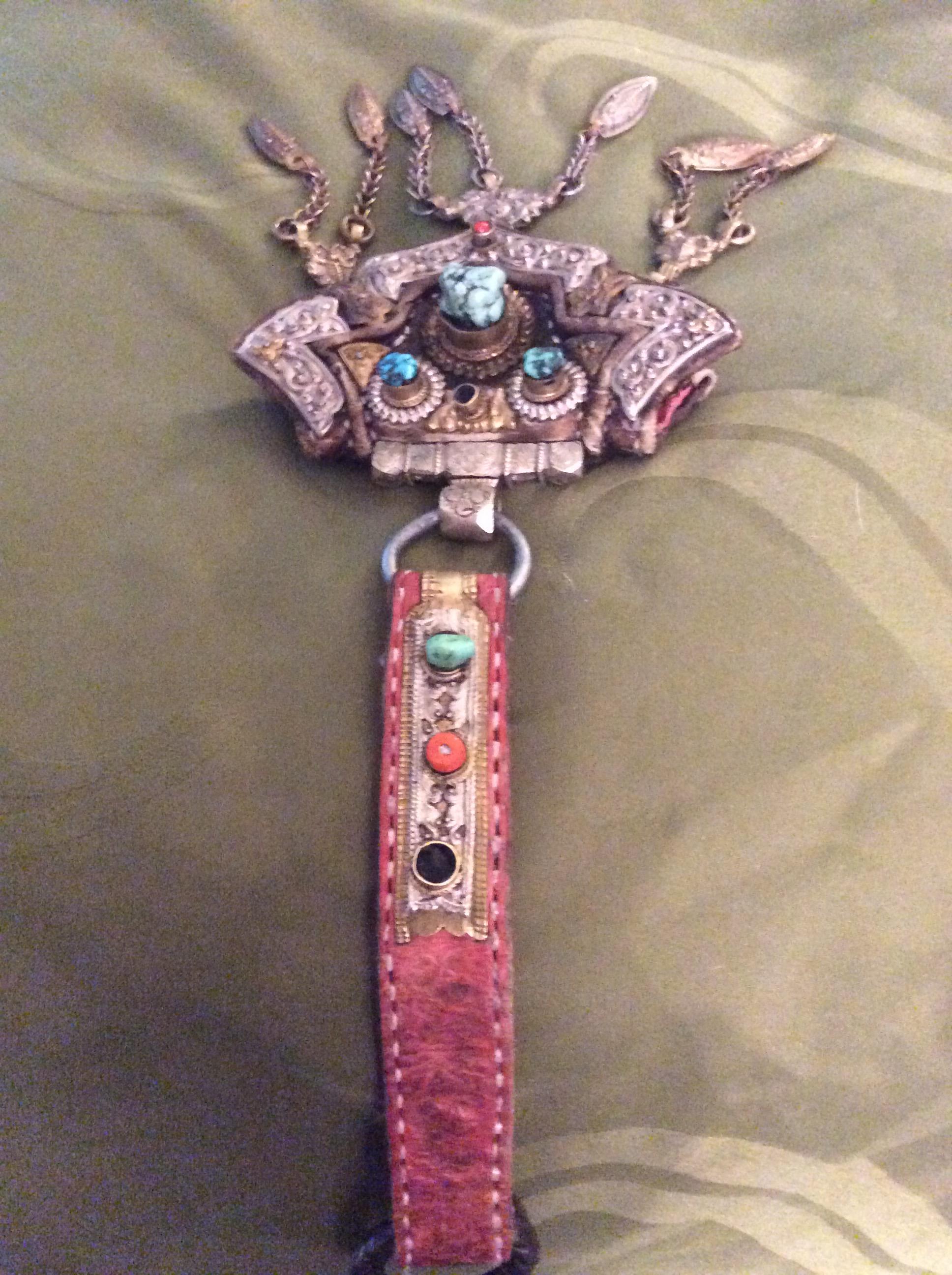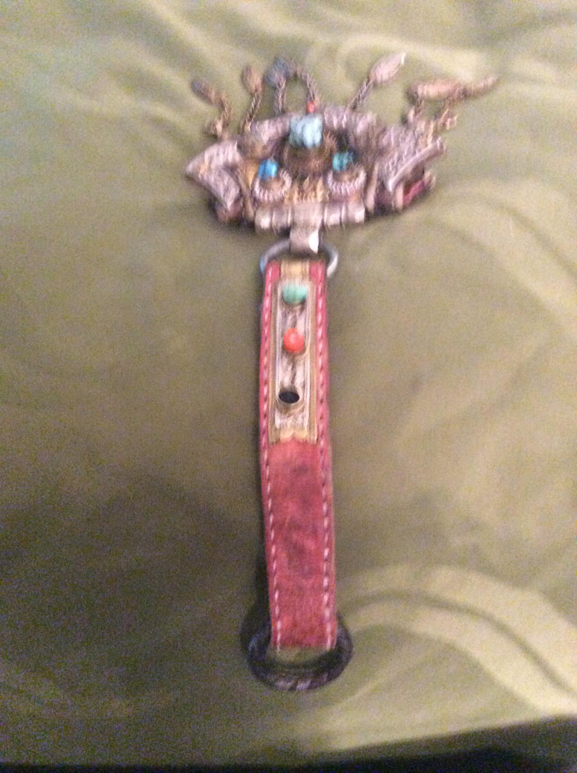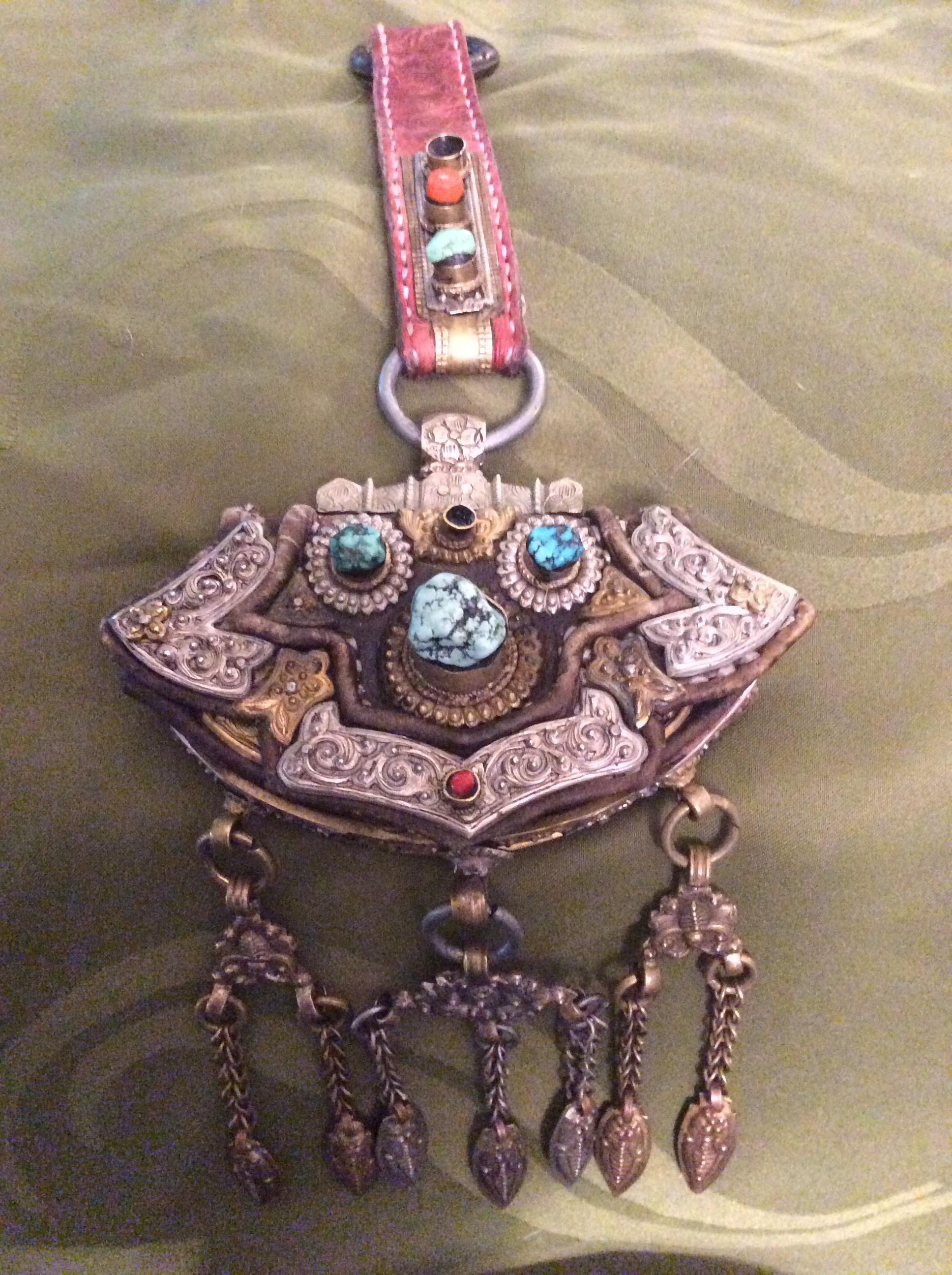 Very old metal and leather coin pouch, metal appears gold and silver, but may be brass and silver. Leather appears very old, but still strong and not bad looking. Turquoise stones on front of pouch and strap. Hand made without question, but that is about  all I can say for sure.