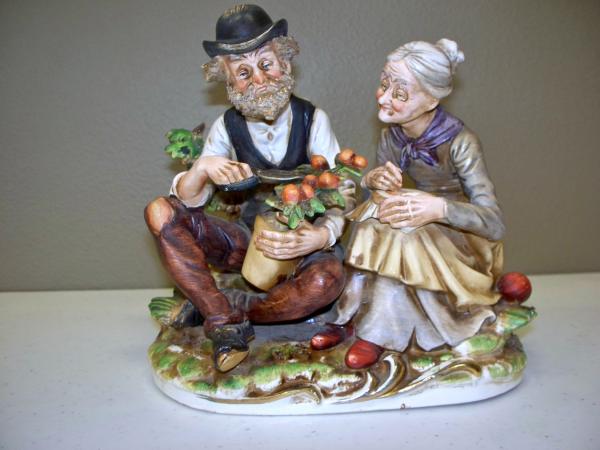 This is an old couple and the man is pruning a plant. The woman is doing needlepoint. There is gold trim around the bottom. I have searched EVERYWHERE and cannot find this or anything that looks like it comes from the same set. It is in very good condition with no chips or cracks. Some of the gold trim on the bottom is fading.
